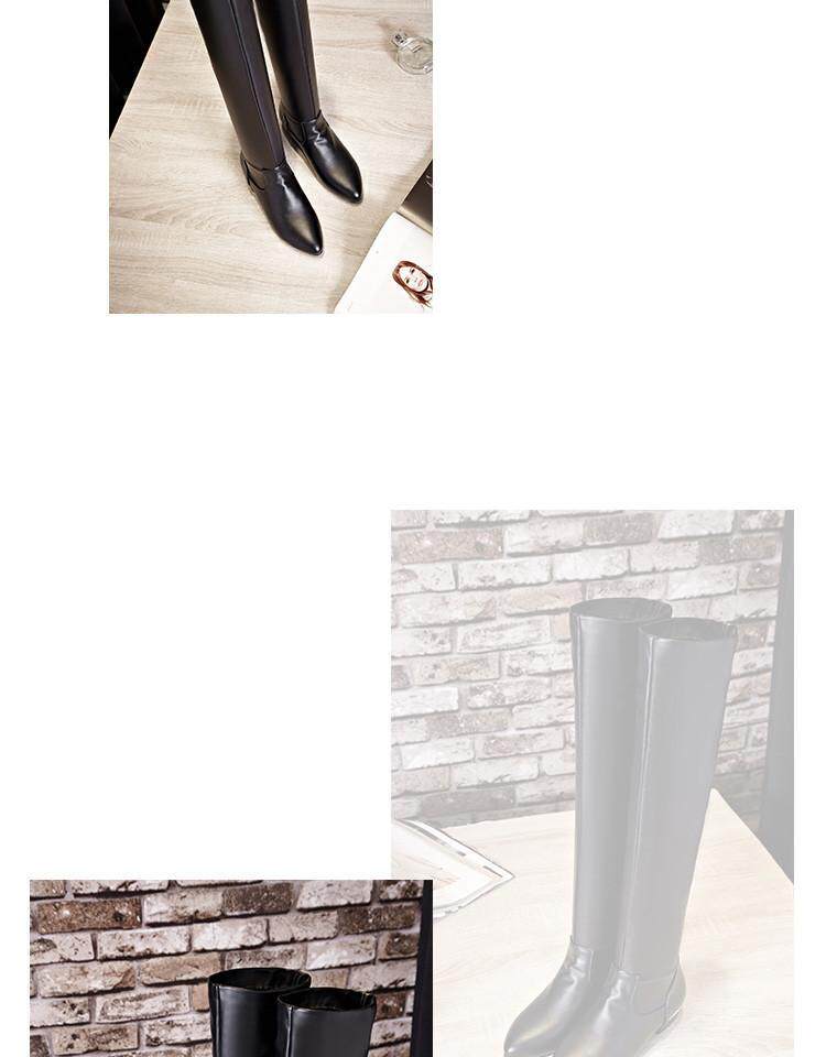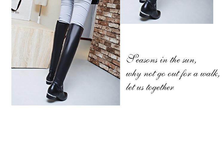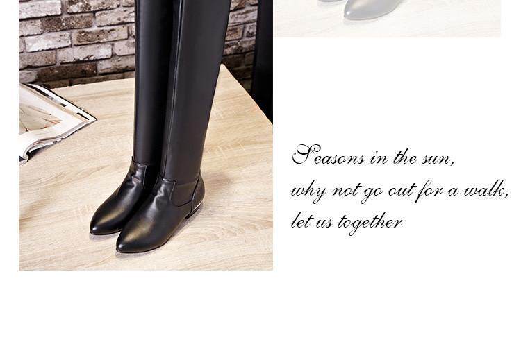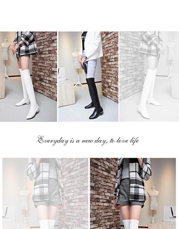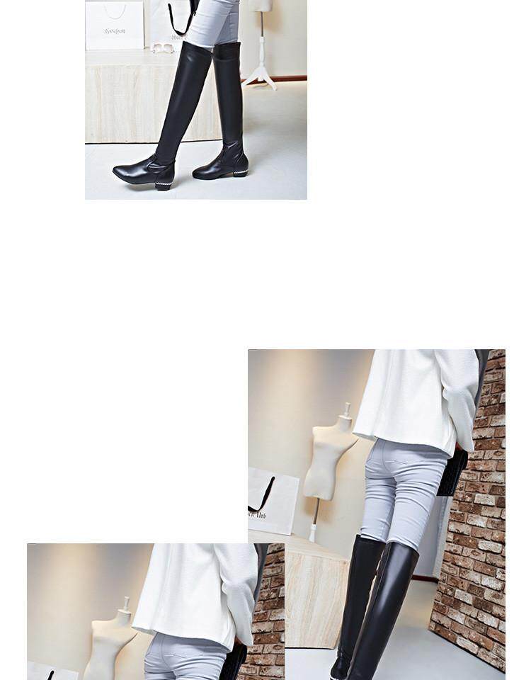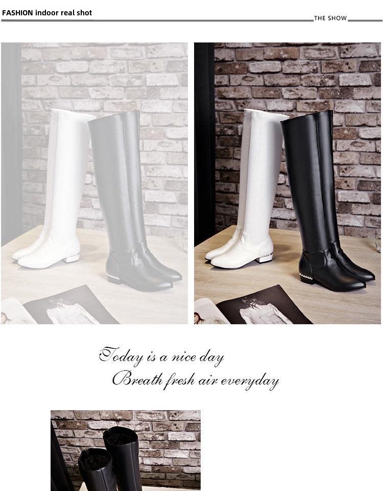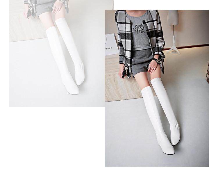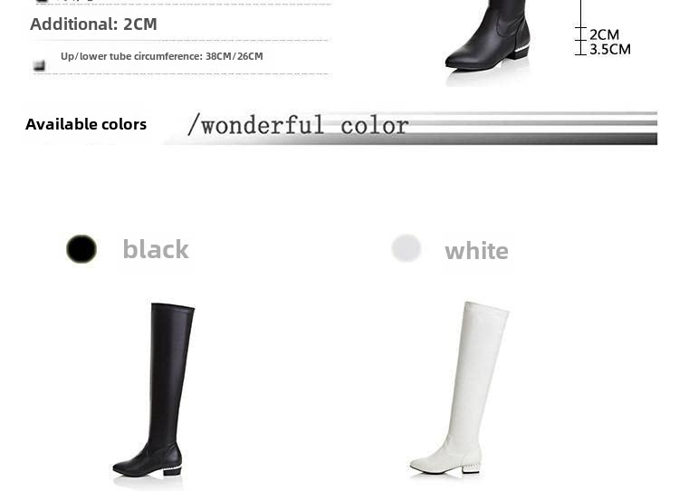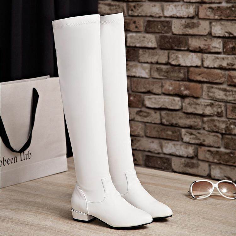 Купить товары Зимние женские сапоги, эластичные прямые кожаные сапоги, бело-черные сапоги выше колена, тонкие ноги, острый носок, плоская подошва, низкие каблуки