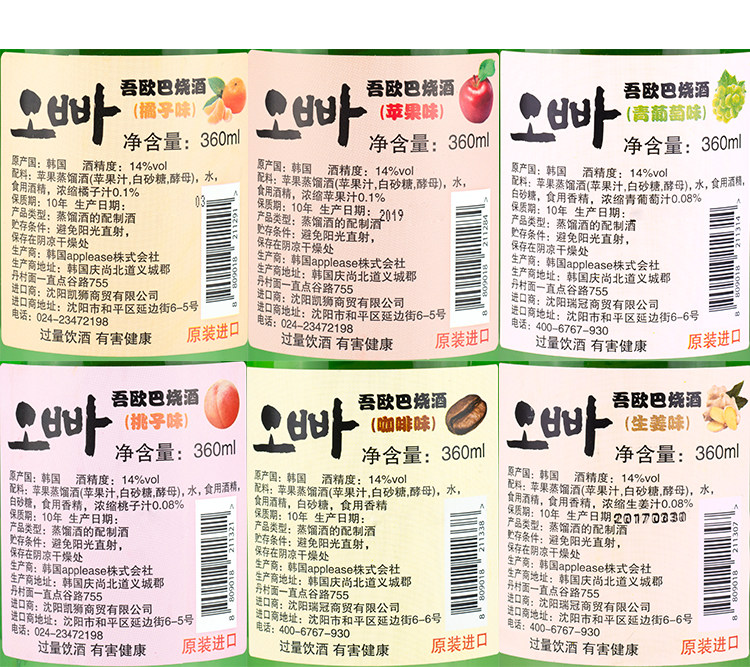 6 бутылок бесплатной доставки Южная Корея, импортируемая из импортированного вау -жареного фруктового вкуса, 360 мл*6 бутылок яблочного дистиллированного вина