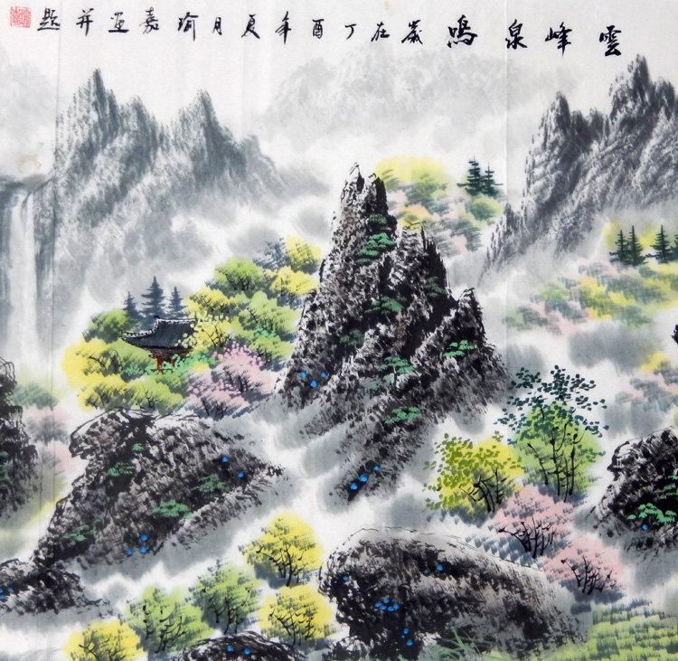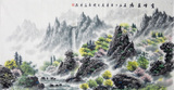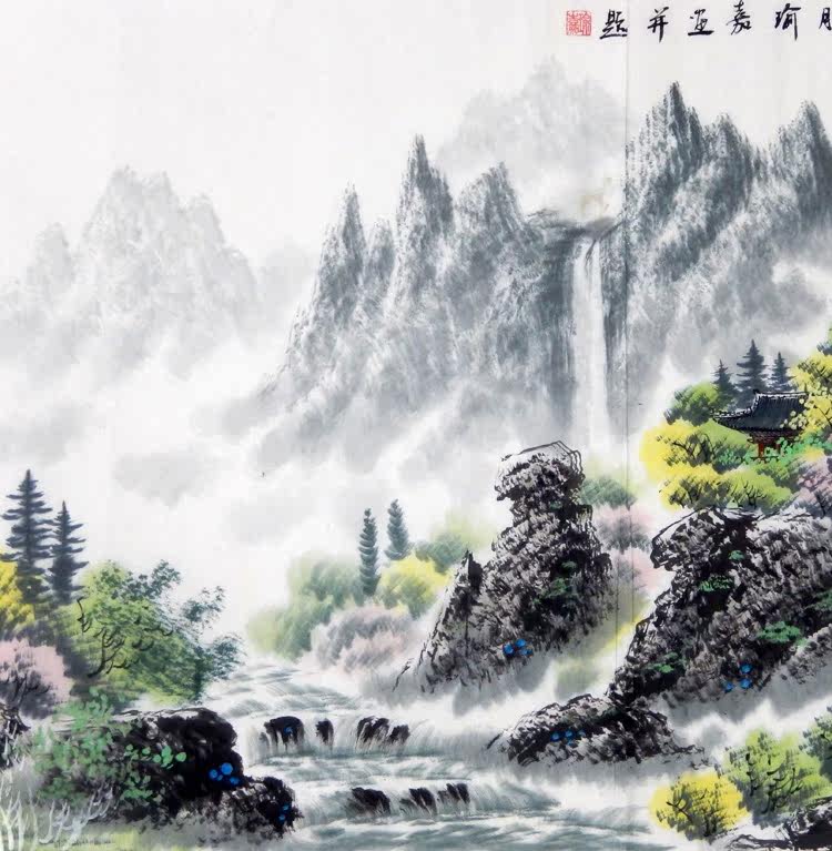 Китайская живопись чистая рука красочная чернила зеленая ландшафтная живопись фэншуй.