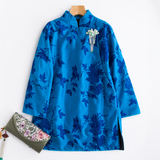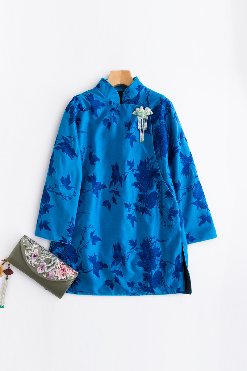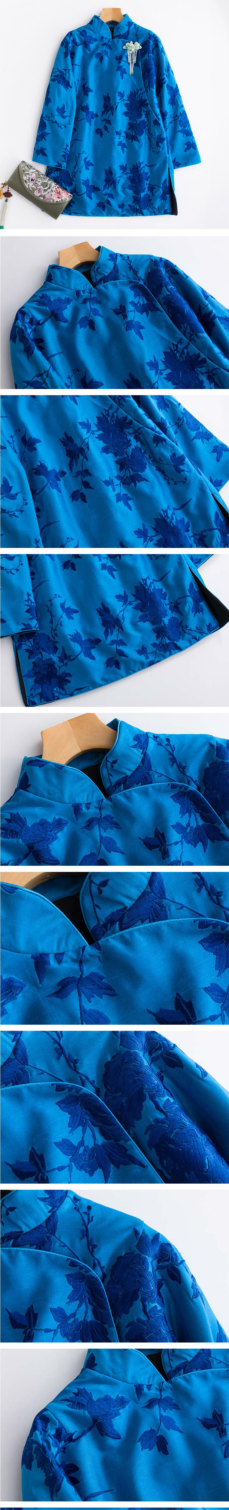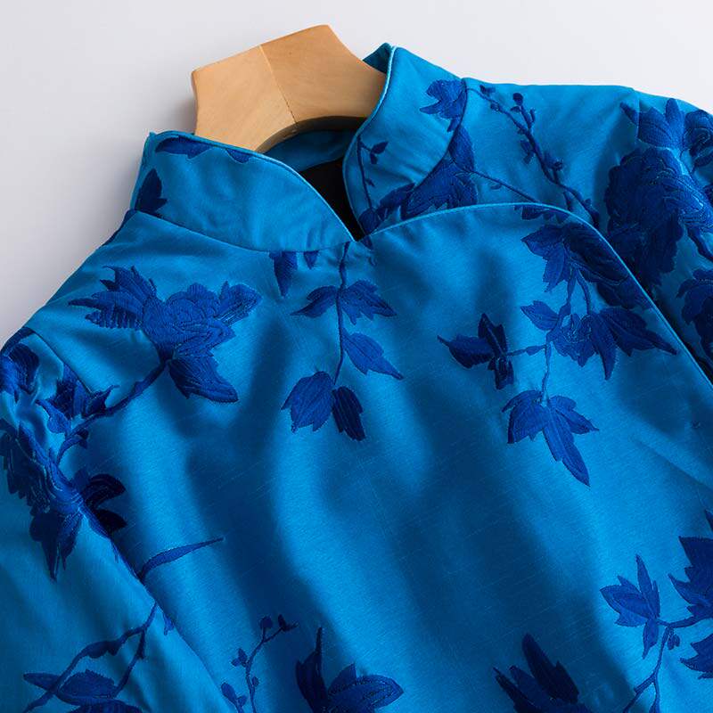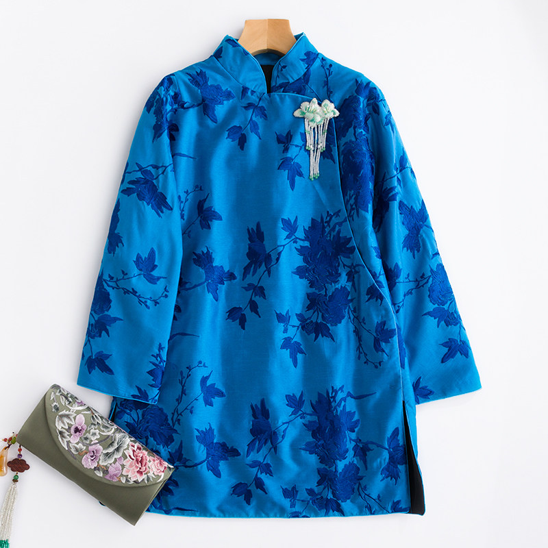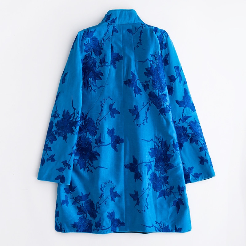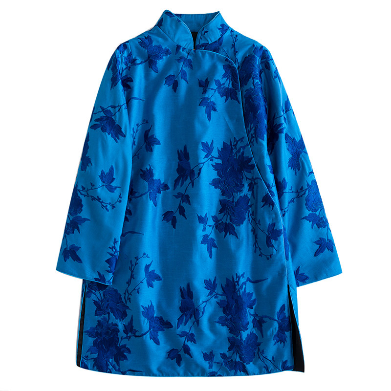 Демисезонный синий цветной классический пуховик, китайский стиль, с вышивкой