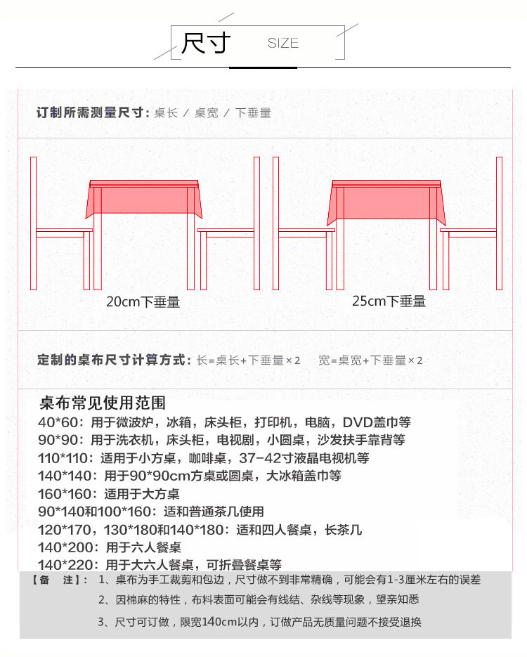Характеристики: Индивидуальный размер свяжитесь с обслуживанием клиентов (необходимо изменить цену), 90*90 см (подходит для небольшого квадратного стола), 90*140 см (подходит для небольшого журнального столика), 130*130 см (подходит для обычных квадратных столов), 130*150 см (подходит для небольшого обеденного стола), 130*180 см (подходит для обеденного стола), 140*180 см (подходит для обеденного стола), 140*200 см (подходит для обеденного стола), 140*220 см (подходит для обеденного стола), 65*150 см (обычно используется в общежитиях), 140*140 см (подходит для квадратного стола), 40*60cm, 60*60cm, 60*90CM, 80*120cm, 120*120CM, 100*160CM, 110*170CM, 120*180CM, 140*300CM