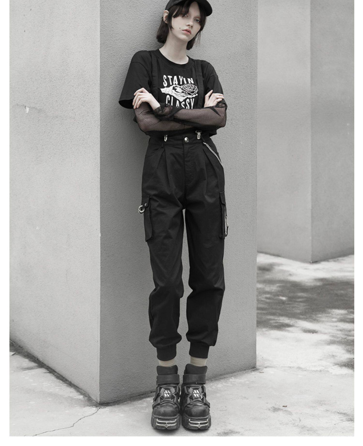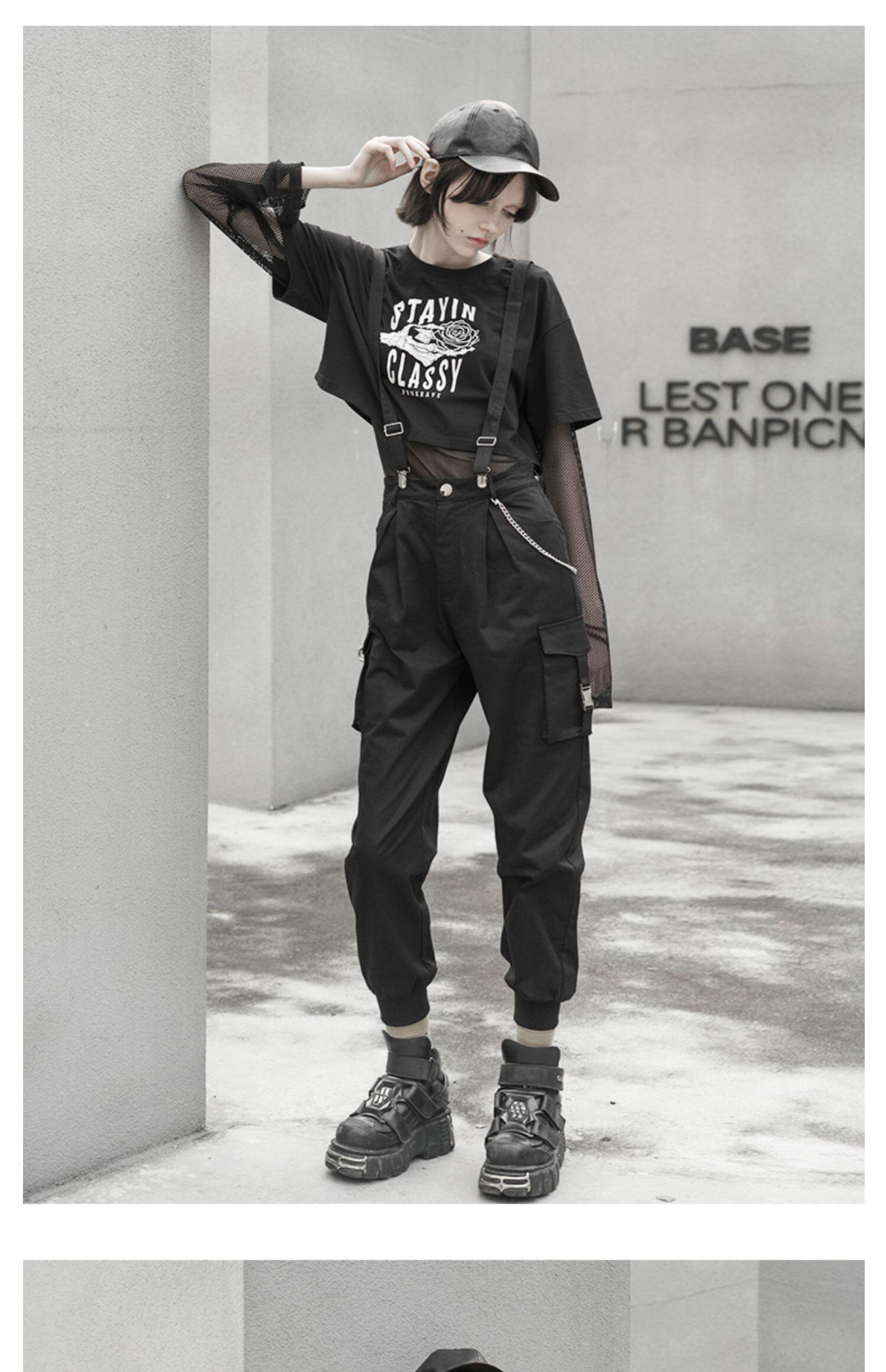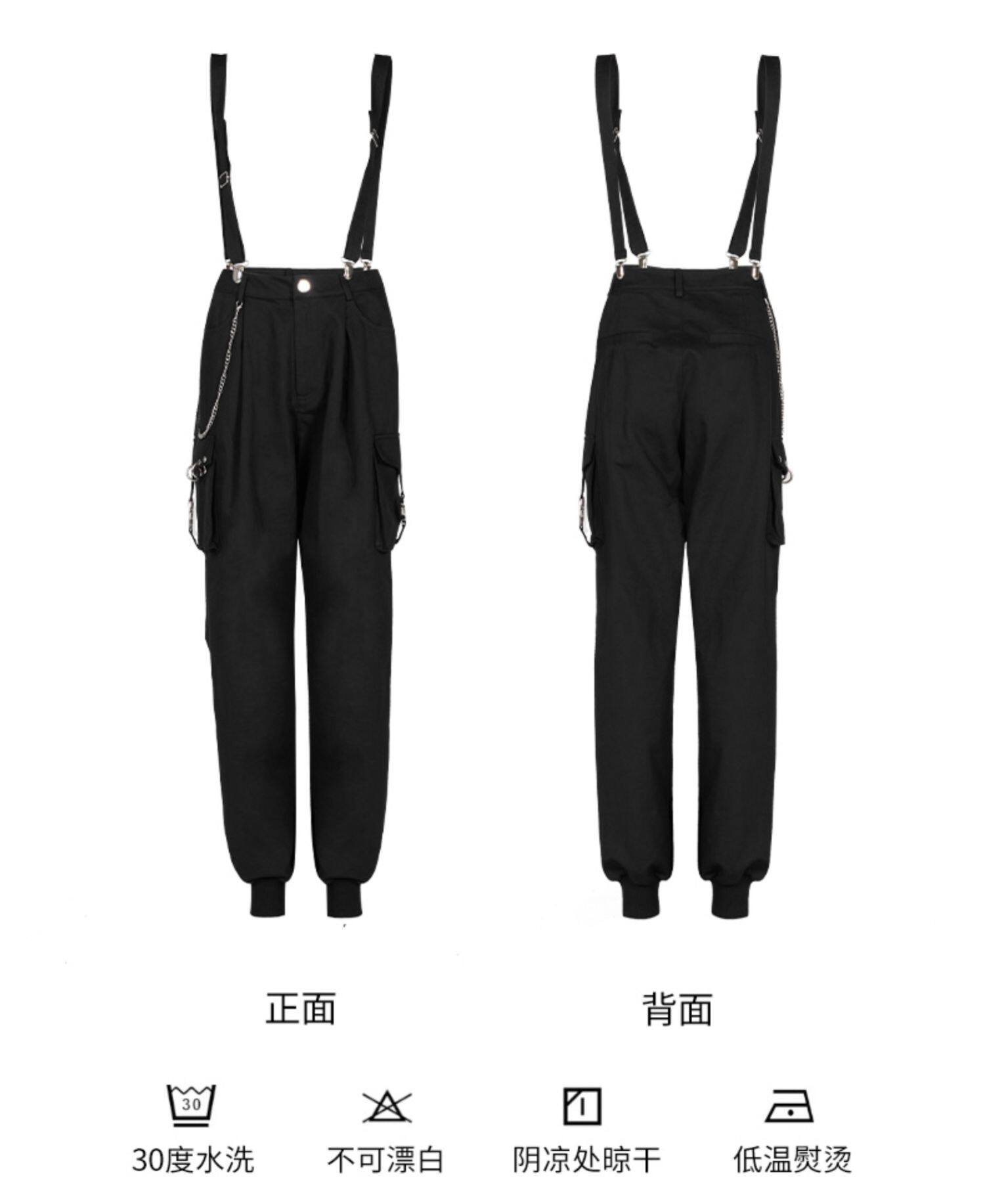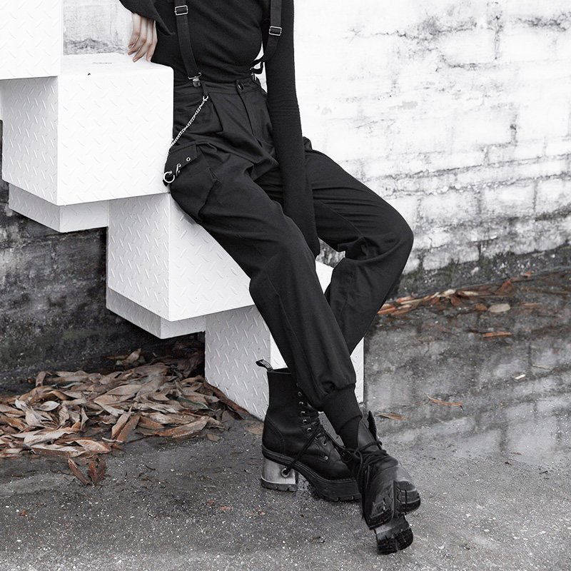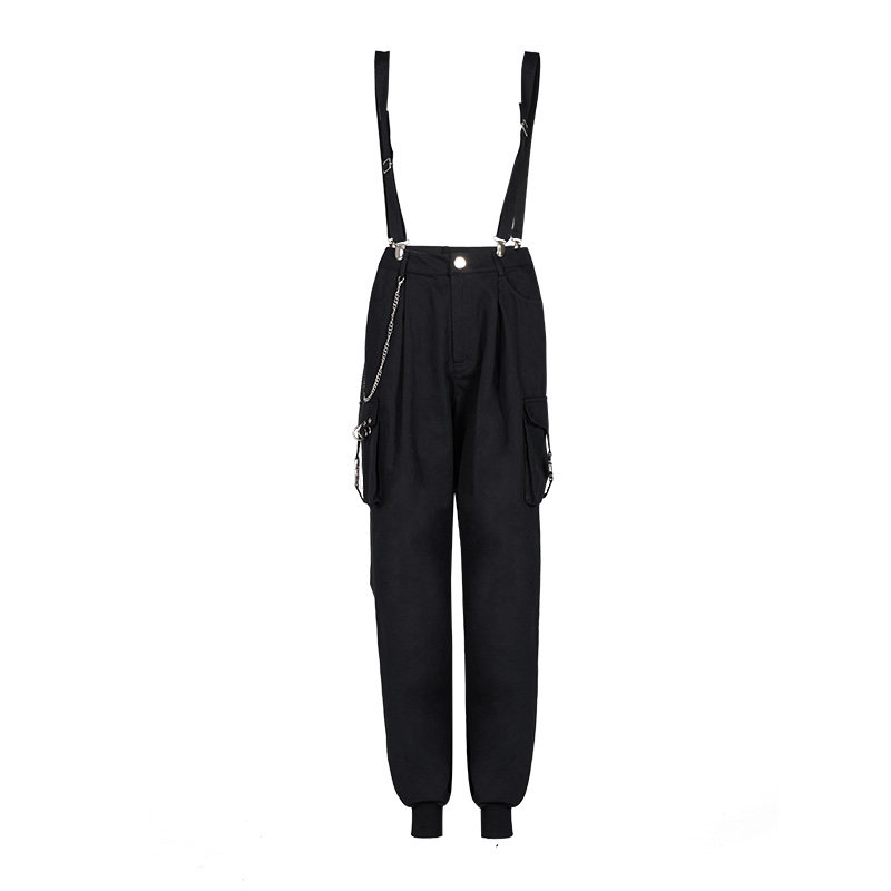 Штаны, черный комбинезон, высокая талия, в стиле панк, эффект подтяжки