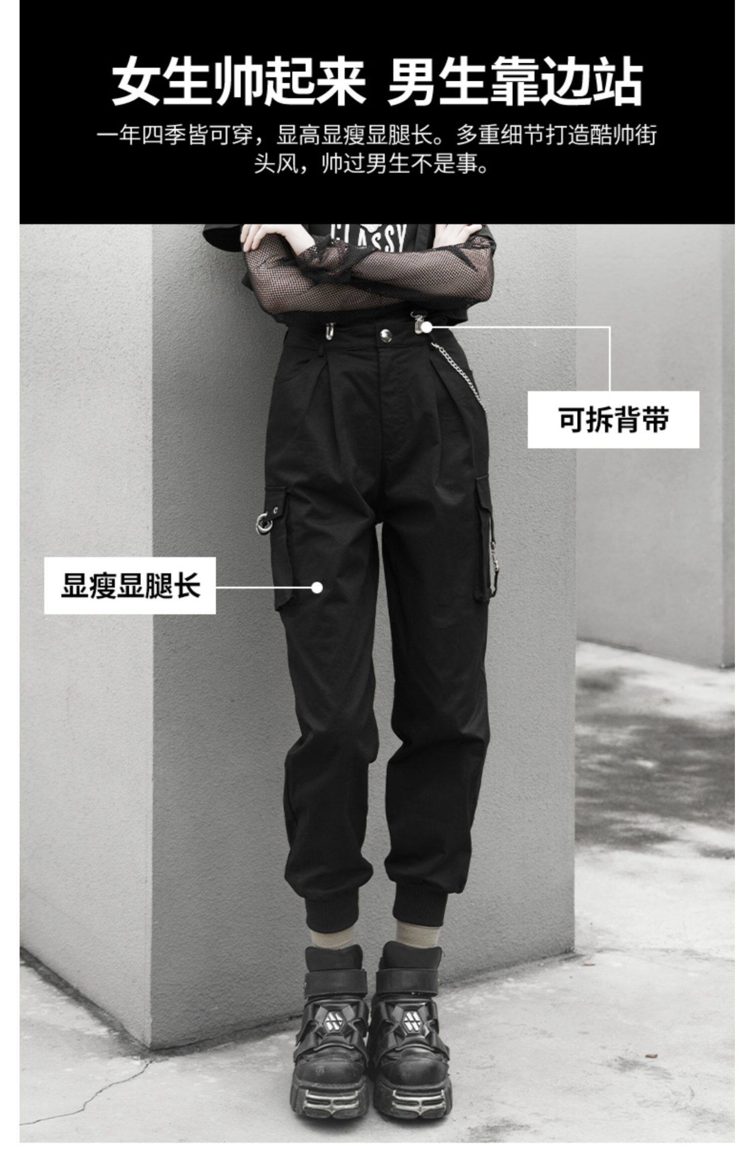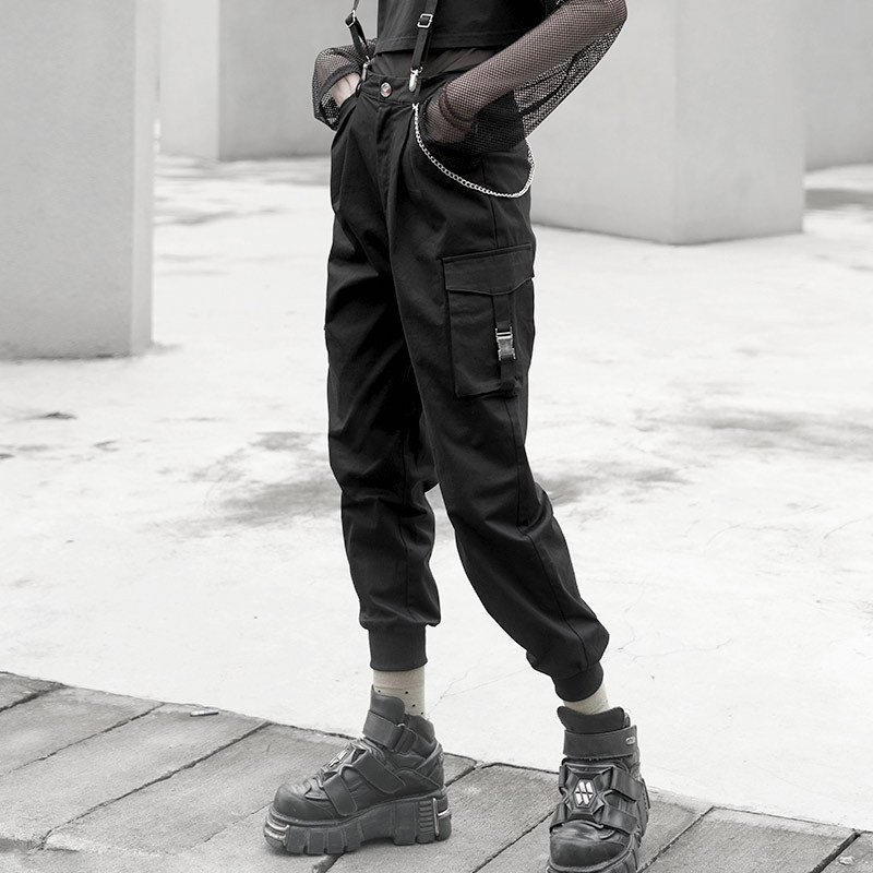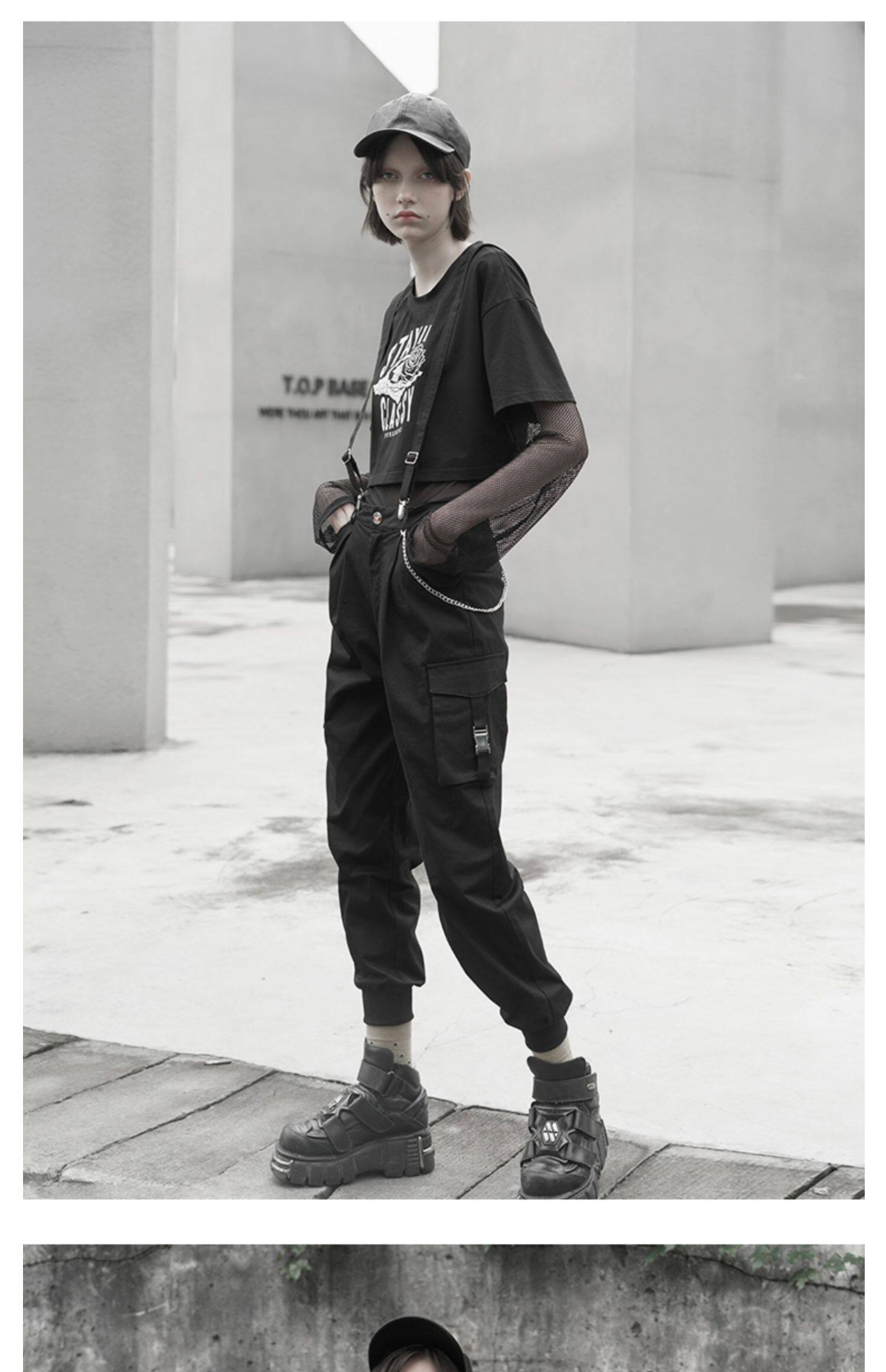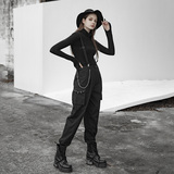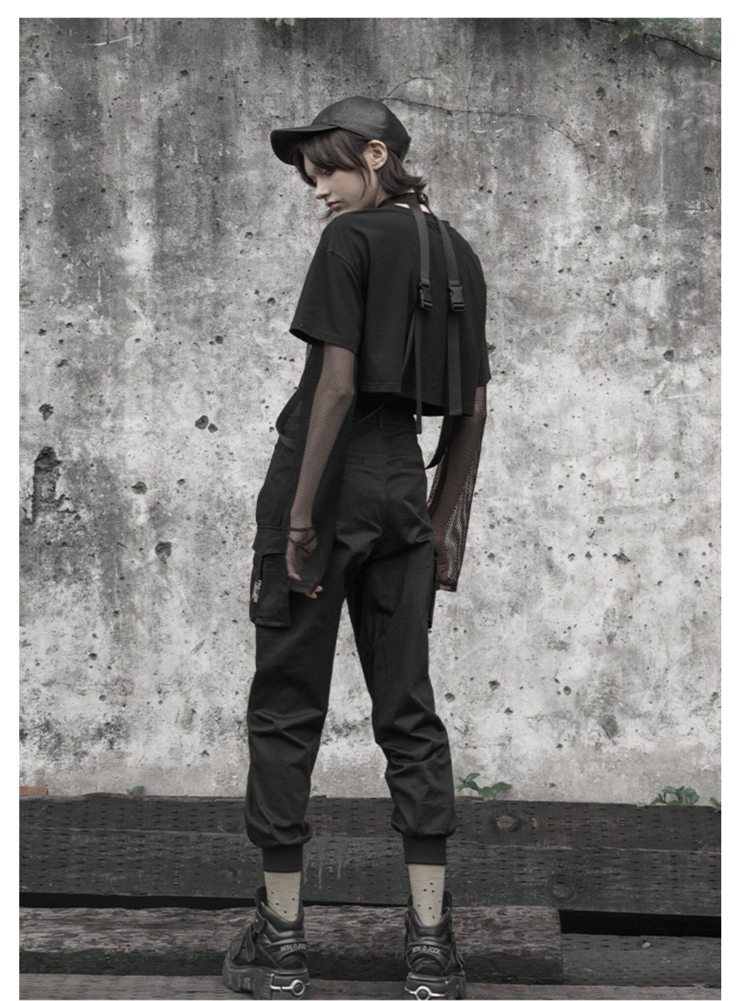 Штаны, черный комбинезон, высокая талия, в стиле панк, эффект подтяжки