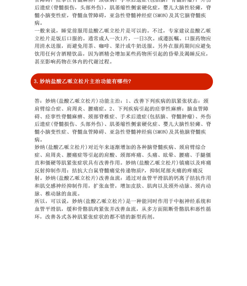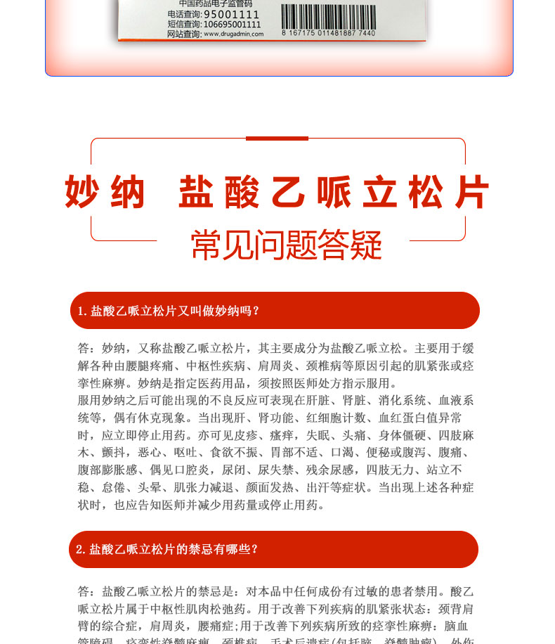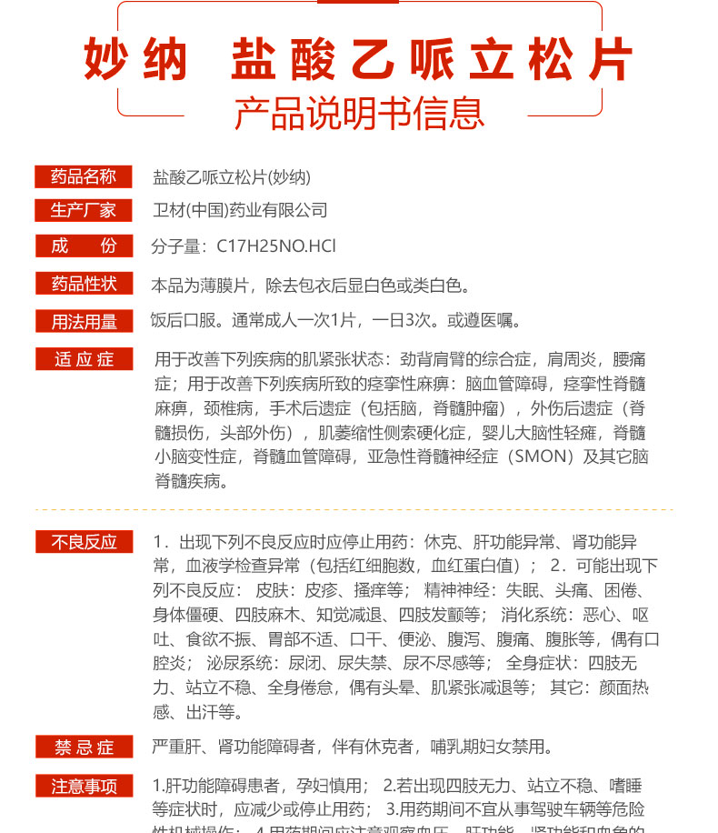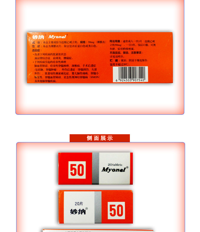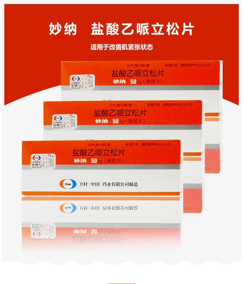 妙纳 Таблетки эперизона гидрохлорида 50 мг * 20 шт./кор. Улучшают шейно-плечевой синдром, замороженное плечо, боль в пояснице, спастический паралич, цереброваскулярное расстройство, спастический спинальный паралич, шейный спондилез и т. д.