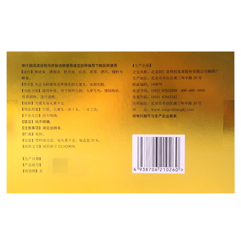 同仁堂 Официальный веб -сайт флагманского магазина Liuwei Dihuang Таблетки 20 таблетки почек дефицит мужчин дополняют шесть таблеток Dihuang