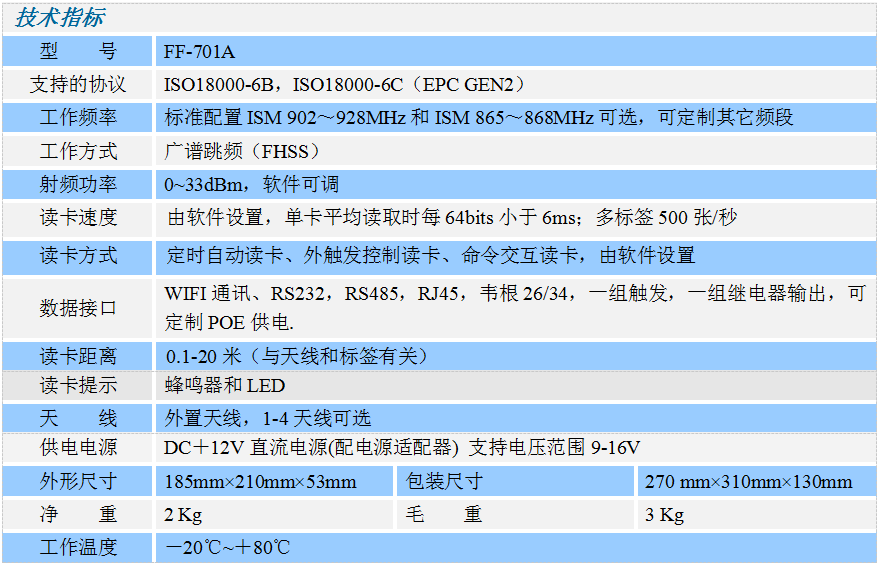 FF-701Это высокая эффективностьUHFРазделившийся читатель.Действительно осознавать долгое расстояние, читать быстрее,4Антенна, различные коммуникационные интерфейсы и превосходная производительность широко использовались в управлении интеллектуальной производственной линии, беспилотной розничной торговлей, систем управления активами и т. Д.