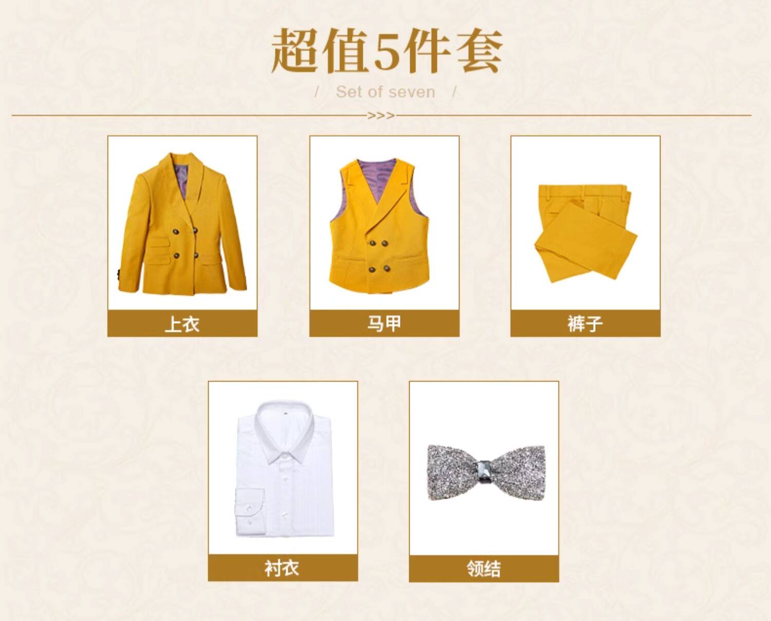 | Цвет: | Желтый комплект, куртка, жилет, штаны, рубашка, галстук-бабочка, 5 шт, Желтый комплект, куртка, жилет, штаны, рубашка, галстук-бабочка, 5 шт, Желтый комплект, куртка, жилет, штаны, черная рубашка, брошь, 5 шт |