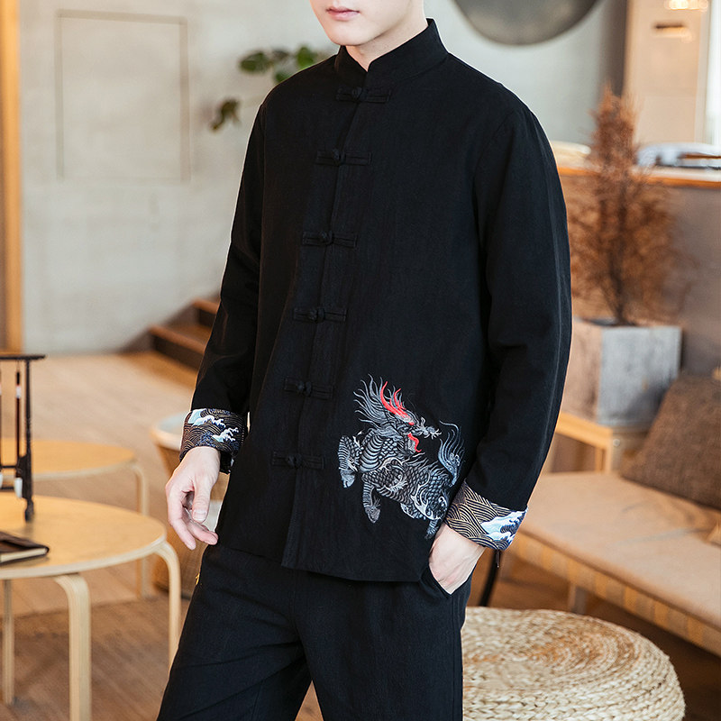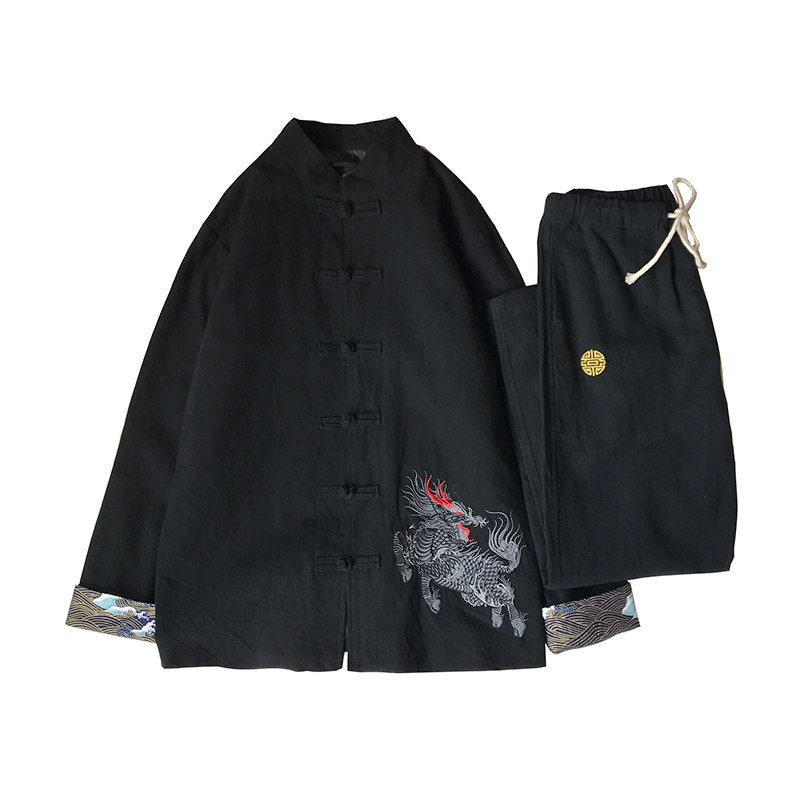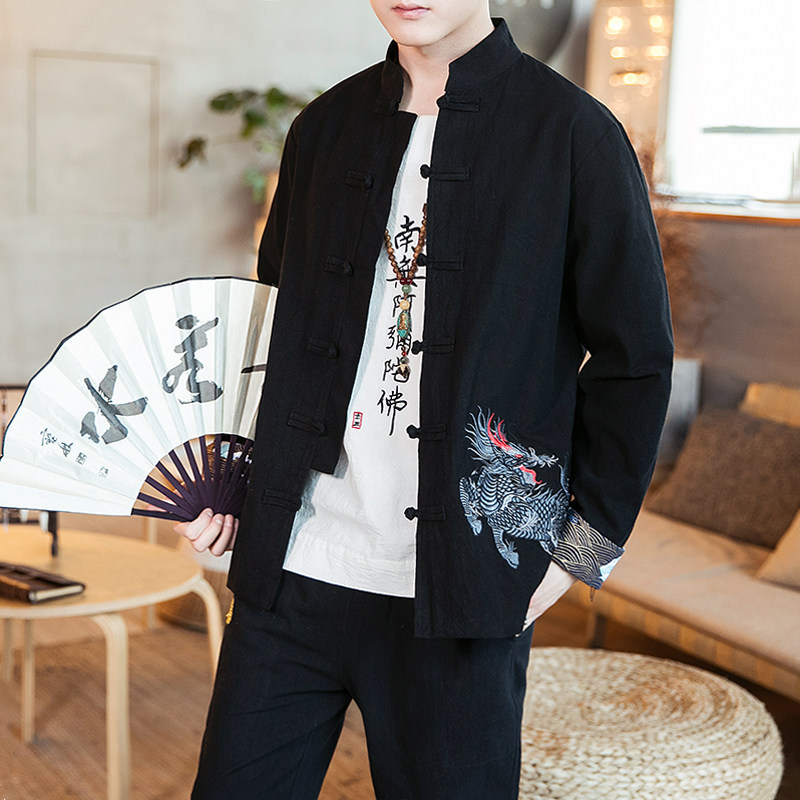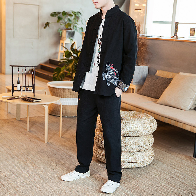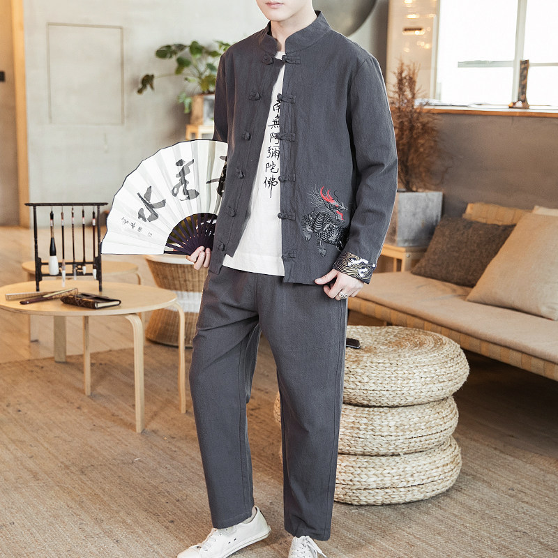 Комплект, ретро куртка, мужское ханьфу, китайский стиль, с вышивкой, из хлопка и льна