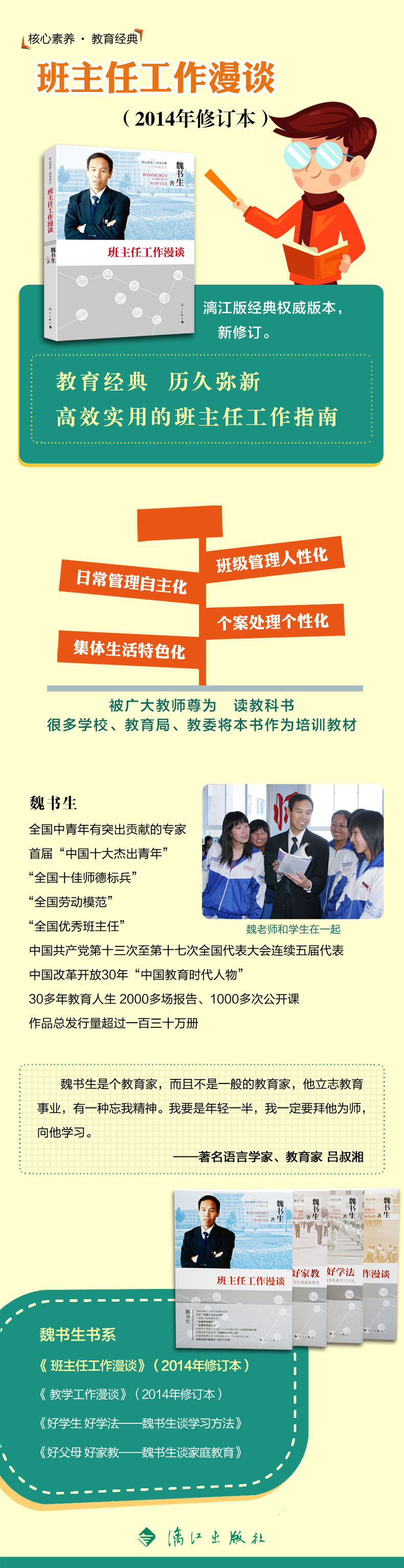 Редактировать рекомендацию:думатьСделайте хорошую работу учителей и сначала прочитайте Вэй Шушенг.Опыт преподавания и обучения людей за 30 лет повлиял на поколение морали учителей.  по всей стране проживает более 2000 лекций, и сообщество образования популярно. Общее распространение этой книги превышает 1 миллион копий.2014Ежегодный пересмотр.Классика образования, долгое время.Вэй Шушенг возглавил направление нового раунда образовательной реформы. Эта книга является сущностью его реформы образования, и это руководство по работе учителя класса.Классические случаи образования, замечательная учебная карьера, затронули миллионы учителей, почти все преподаватели изучают и изучают Вэй Шушенг.Теперь многие образовательные эксперты, директора и учителя вспоминают, что они впервые читают «Работа учителя» как учитель.Читатели -учителя говорят——Когда я впервые вступил в контакт с ним, я почувствовал, что каждое слово, каждое слово было таким шокирующим!Я поклонялся перед ним, глубоко отражал и глубоко убежден.Когда мои эмоции низкие, а моя работа разочарована, я больше не жалуюсь на окружающую среду, но активно адаптируется; больше не останавливается, а смелость практиковать.Сегодня я должен быть совершенно новым, и я должен использовать улыбку, чтобы сделать ее вдвое, к сожалению, вдвое!Это предложение так хорошо!&Ldquo; жаловаться на то, что окружающая среда не хороша, потому что мы не хороши; жалуются на сужение других, потому что мы не открыты -я чувствую, что жалуются на то, что студентам трудно обучать, потому что наши собственные методы слишком малы.” участвовать“ я собрал коллективно с классом&При изучении Rdquo; в исследовательской группе я почувствовал смысл фразы Вей Шушенг.“ я собрал коллективно с классом&Rdquo; изучение исследовательской группы заставило меня сделать все возможное, чтобы изменить мой метод образования в работе классового учителя, чтобы облегчить здоровое и оживленное развитие учеников.В своей преподавательской практике он считает учеников своим помощником. Сколько учеников в его классе, сколько заместителей учителей класса, каждый ученик является помощником, а не противником.Со временем у него был только помощник, и у него не было противника, который сильно мобилизовал инициативу и энтузиазм студентов.Преподаватель Вей тесно связал свое преподавание и образование с процветанием страны, чтобы улучшить национальное качество.Он очищает разум ребенка, спасает будущее нации и осознает процветание страны.С благодарностью он считает свою работу возвращением к вечеринке, народу и любви к природе.Он сохраняет спокойствие своей души, выполняет нормальные вещи, хорошо выполняет свою работу и достигает своих намерений, рассматривая работу как счастливое состояние, пробуя вашу жизнь, и посвящая все образованию и преданность студентам.Он часто пробовал счастье и радость быть учителем: культивирование всех видов талантов, чувство искренних чувств учителей и учеников и собирать много результатов образования и исследований.Вэй Шушенг заложил свою высокую образовательную карьеру из своей учебной мотивации и счастья.Учитель Вей разработал привычку уважать студентов, понимать студентов и начинать с учащихся.Учитель Вей уважает разнообразие личности учеников, развивает совершенство и красоту учащих Атмосф