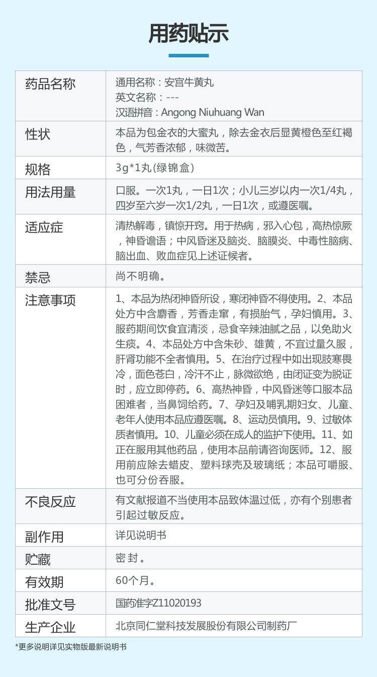 同仁堂 Angong Niuhuang Wan 3g*1 Язык таблеток неблагоприятен для пуска, прозрачного тепла, детоксикации половины тела, удивительный менингит