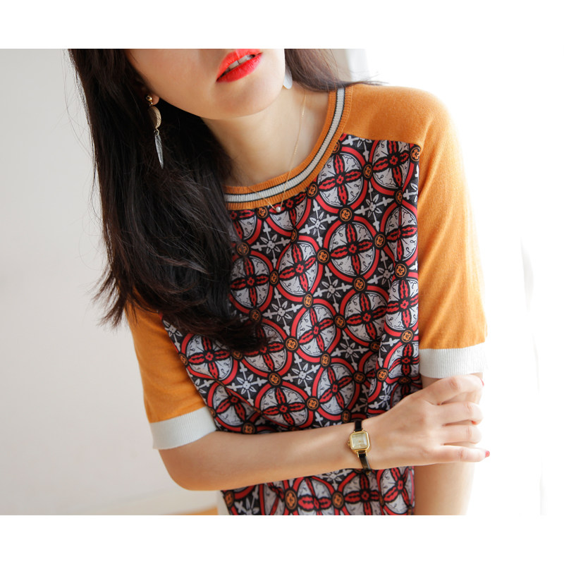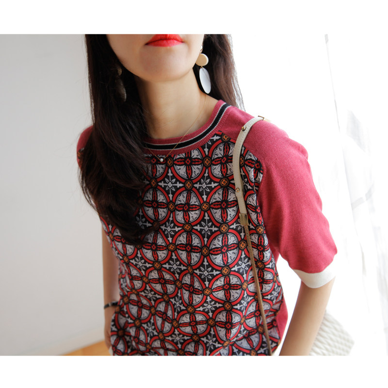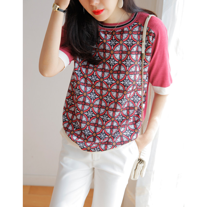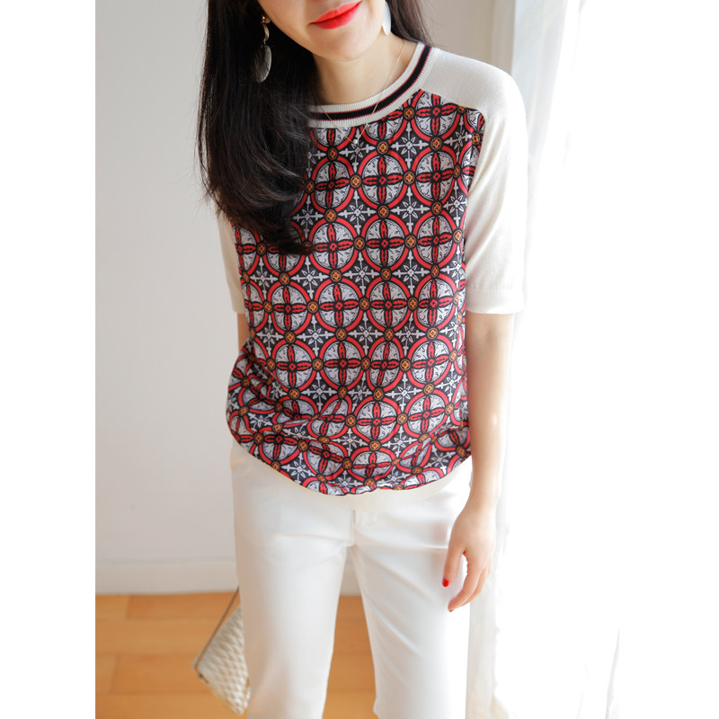 Шифоновый трикотажный свитер с круглым воротником, принт, короткий рукав