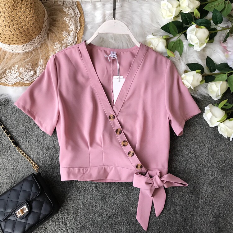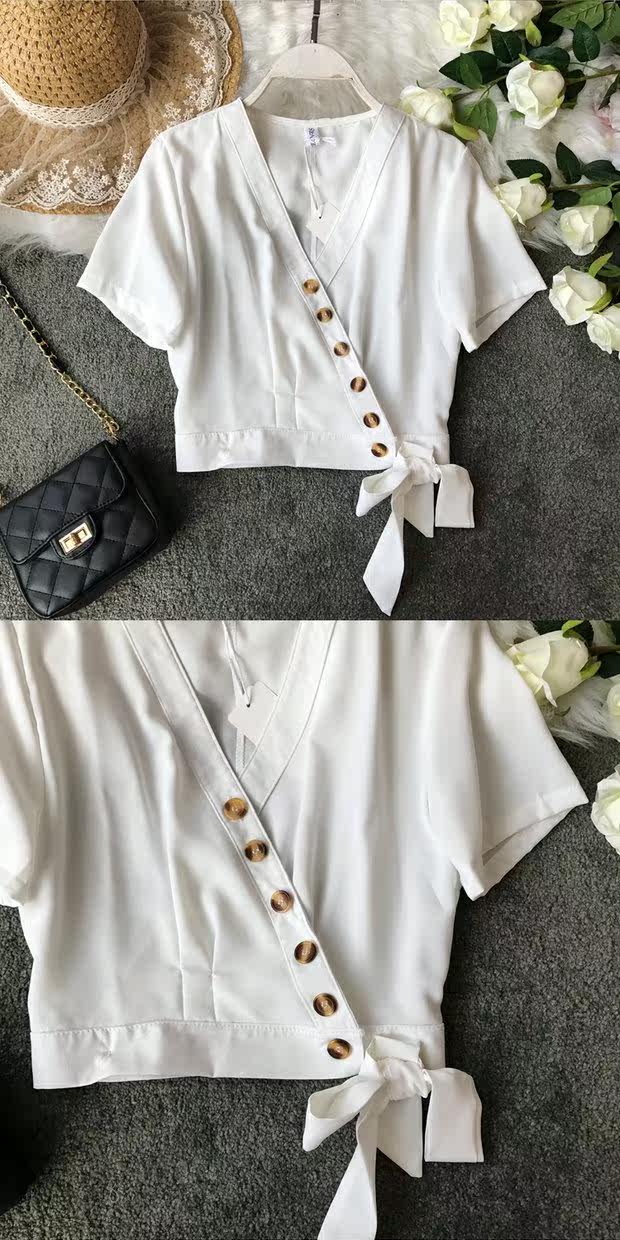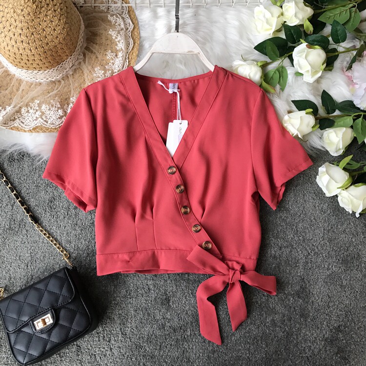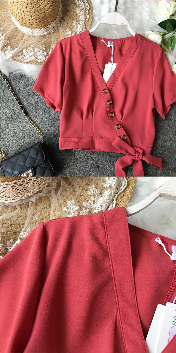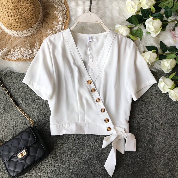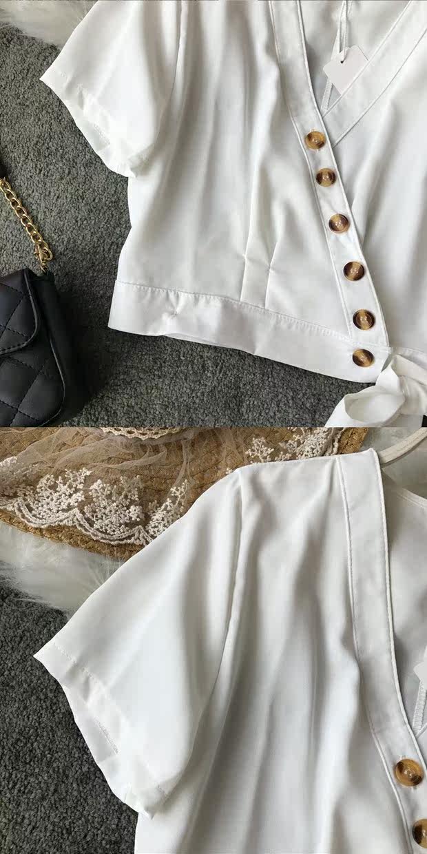 Европейский и американский стиль 2021, весна и лето, новый стиль, модный универсальный V-образный вырез, тонкий, тонкий, кружевной, на пуговицах, однотонный, короткий топ для женщин