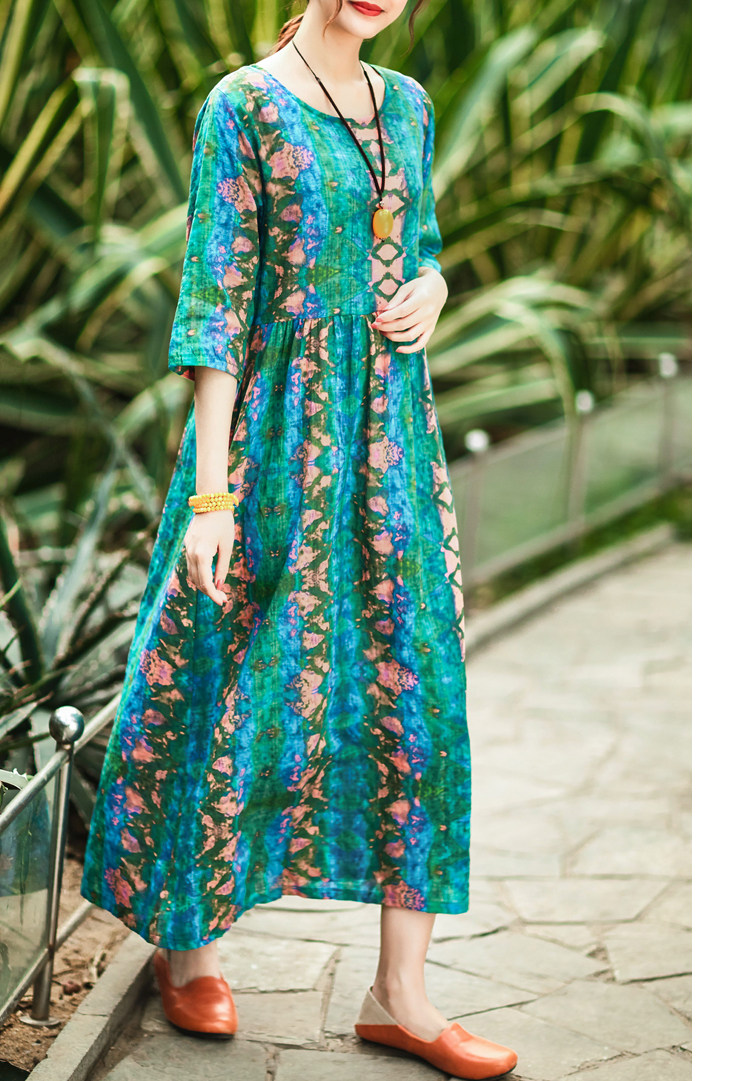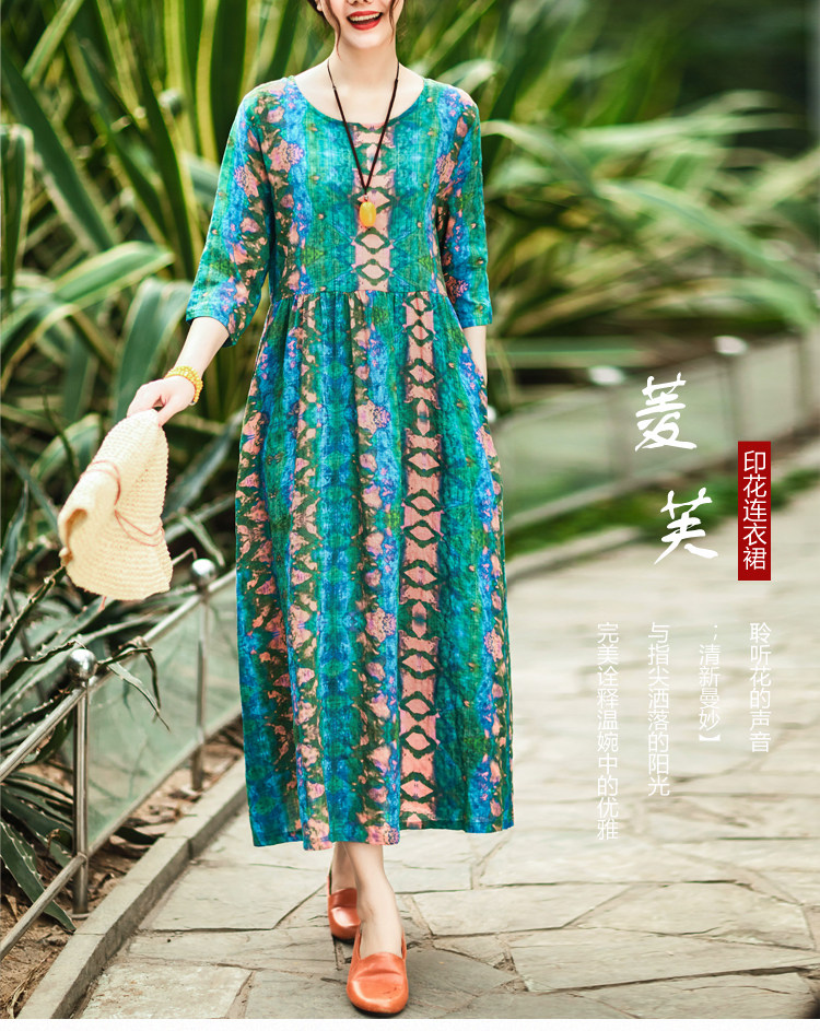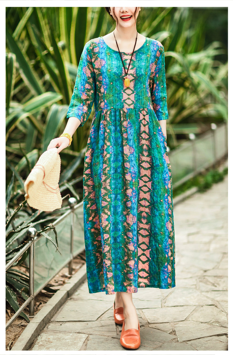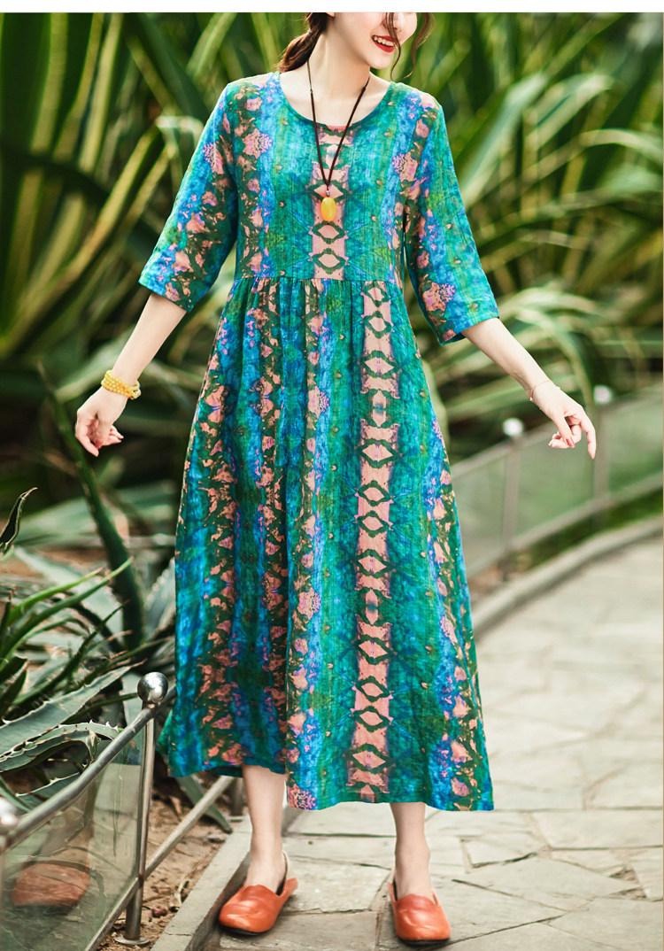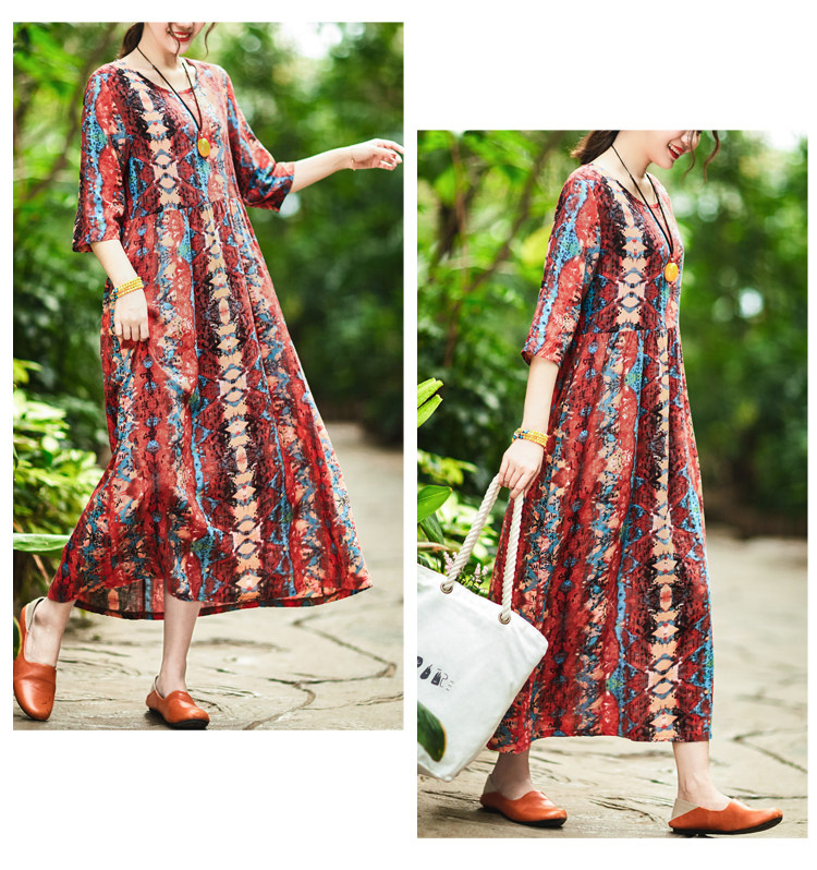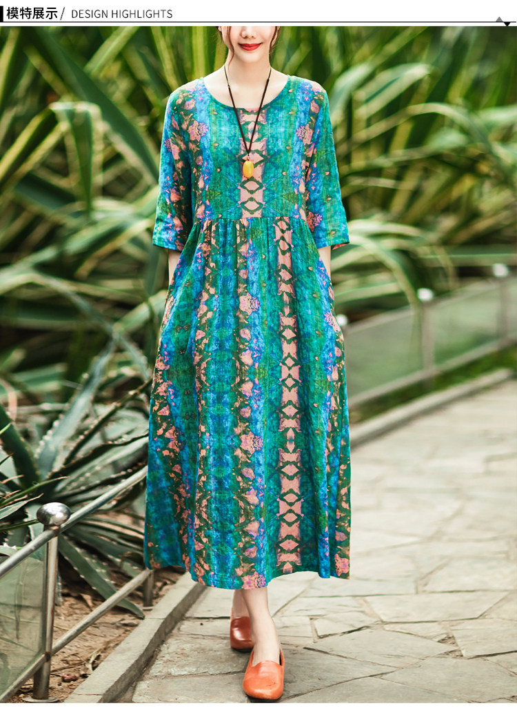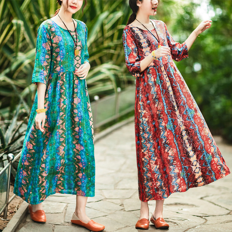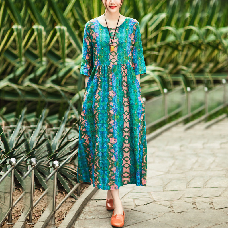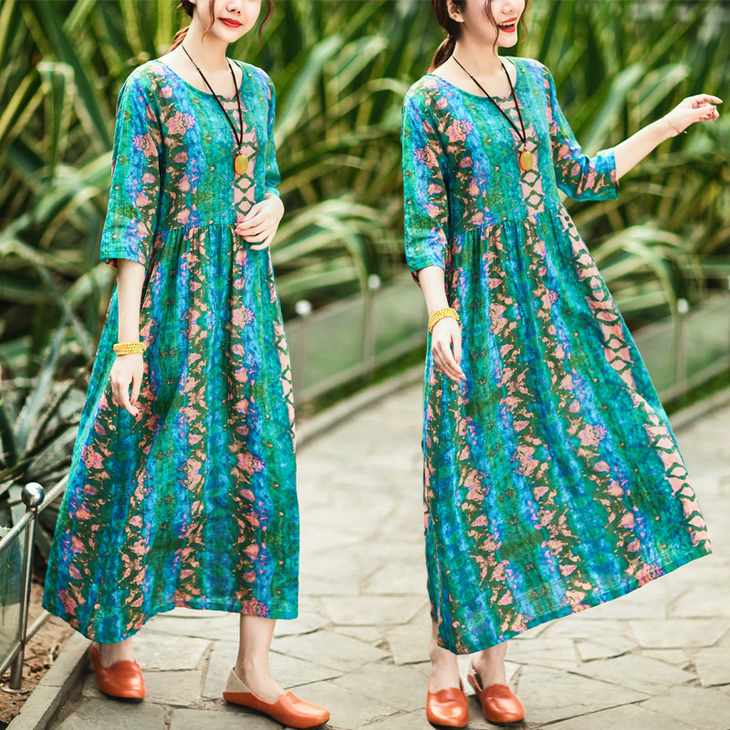 Летнее ретро этническое тонкое платье большого размера, этнический стиль, высокая талия, из хлопка и льна, большой размер, свободный крой