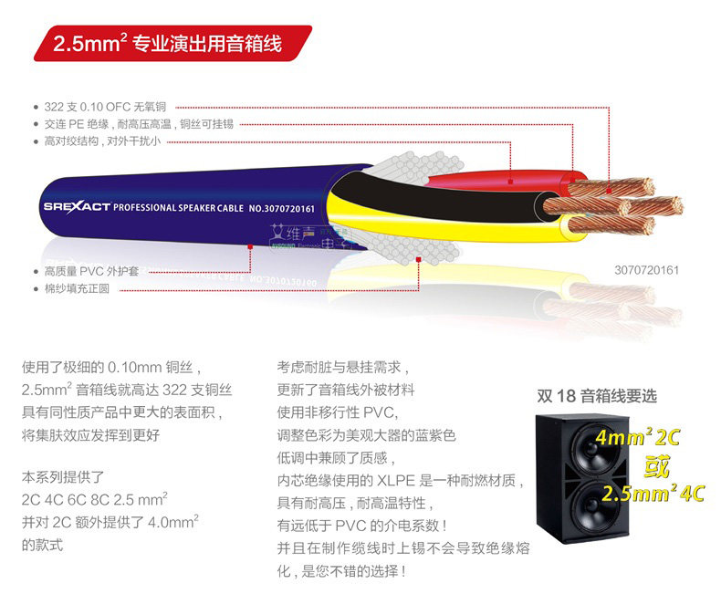 *&[nbsp; 使用了极细的]0.10mm[铜丝,2.5mm 音箱线就高达][322 支][铜丝,具有同性质产品中最大的表面积,将集肤效应发挥到最好,双18 音箱线要选。本系列提供了:2C 4C 6C 8C 2.5 mm2,并对2C 额外提供了 4.0mm2的款式]