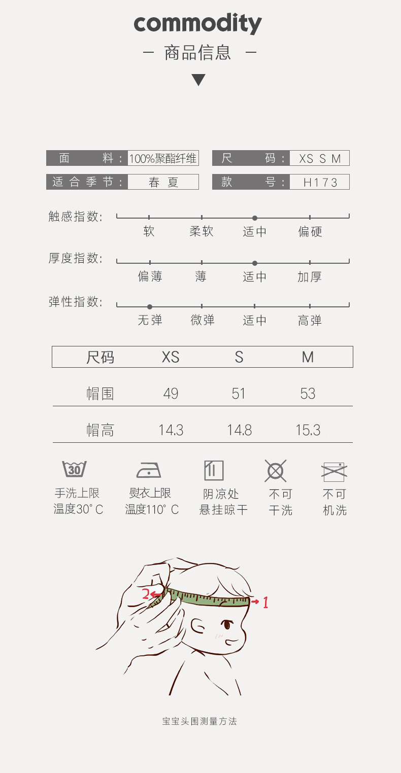 - XS (рекомендуемый окружность головы 44–48), рекомендуемый возраст от 6 месяцев до 2 лет.