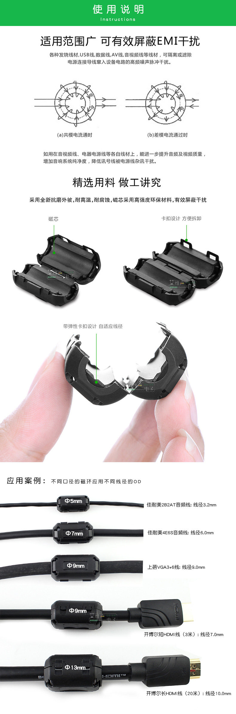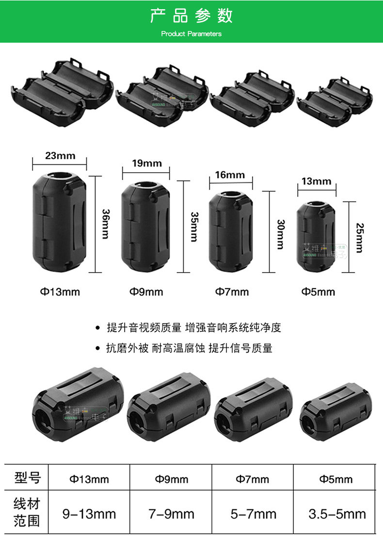 Применимо: различные лихорадные провода, водительские рекордеры, кабели данных USB -проволоки, AV -кабели, аудио и видео -кабели HDMI/VGA и другие провода могут эффективно блокировать интерференции EMI/RFI, выделение или фильтрацию подключения питания в схему устройства в устройство Схема в схему устройства в схему устройства. Например, она может дополнительно улучшить качество звука и видео на линии электроэнергии аудио и видео.