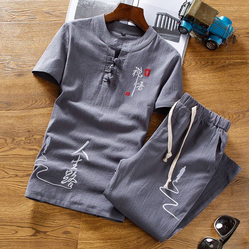 Летний комплект, трендовая футболка с коротким рукавом для отдыха, из хлопка и льна, в корейском стиле, китайский стиль
