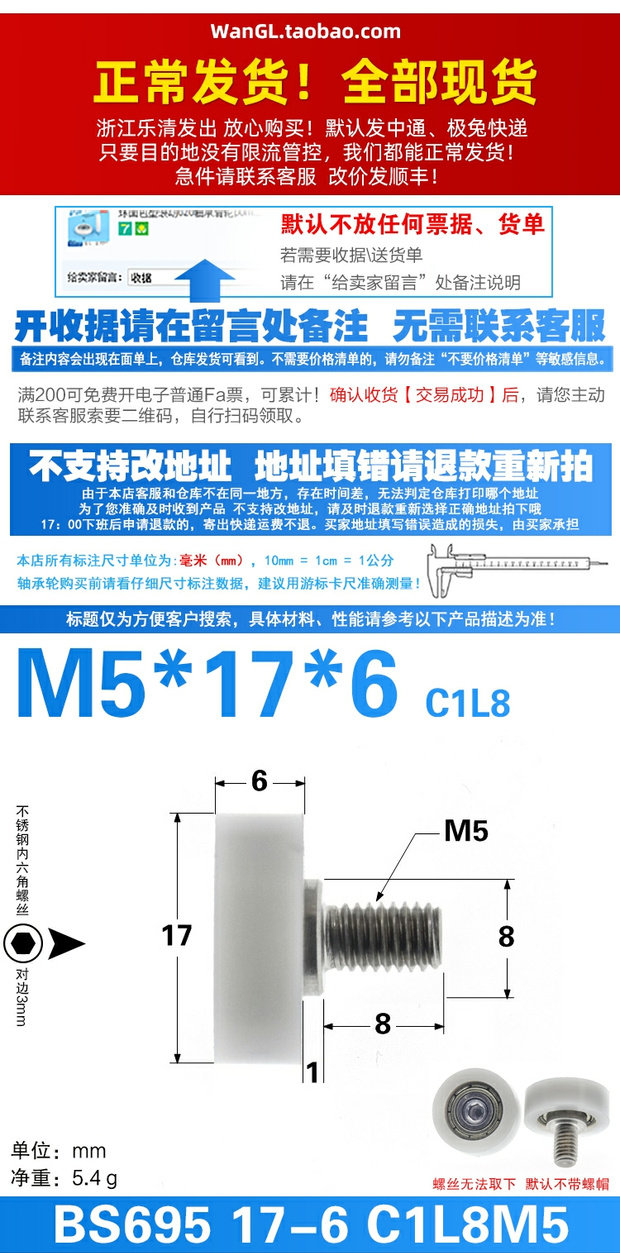 [内六角外螺纹轴承滑轮包塑POM工程塑料轮子M5螺纹抽屉平导轮M5*17]