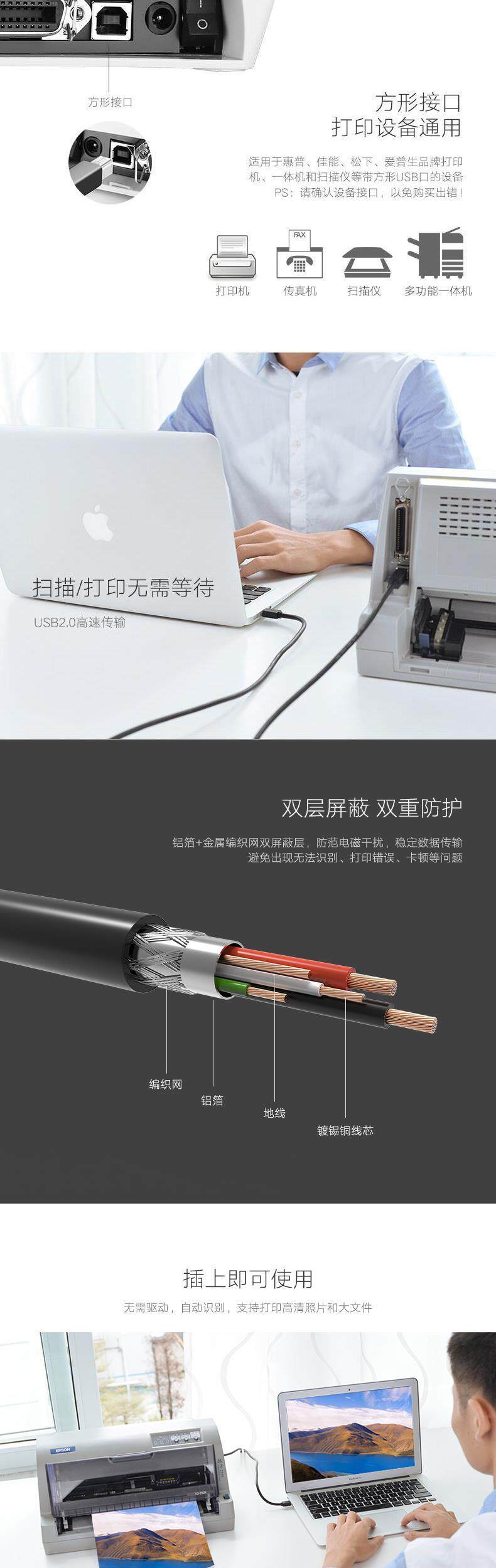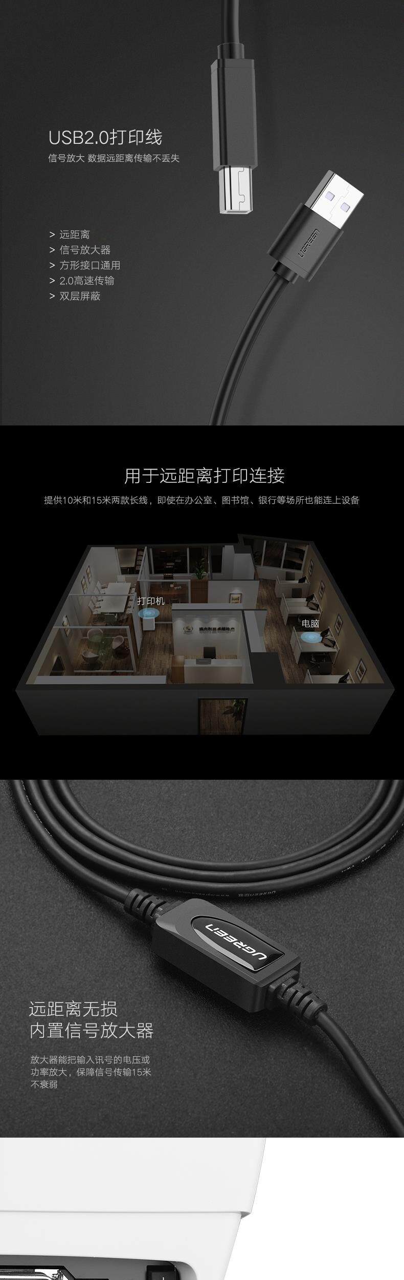 Зеленый союз USB2.0 Данные принтером квадратный рот в рот HP Samsung Lenovo расширенная линия расширенной линии соединения 10 метров 15