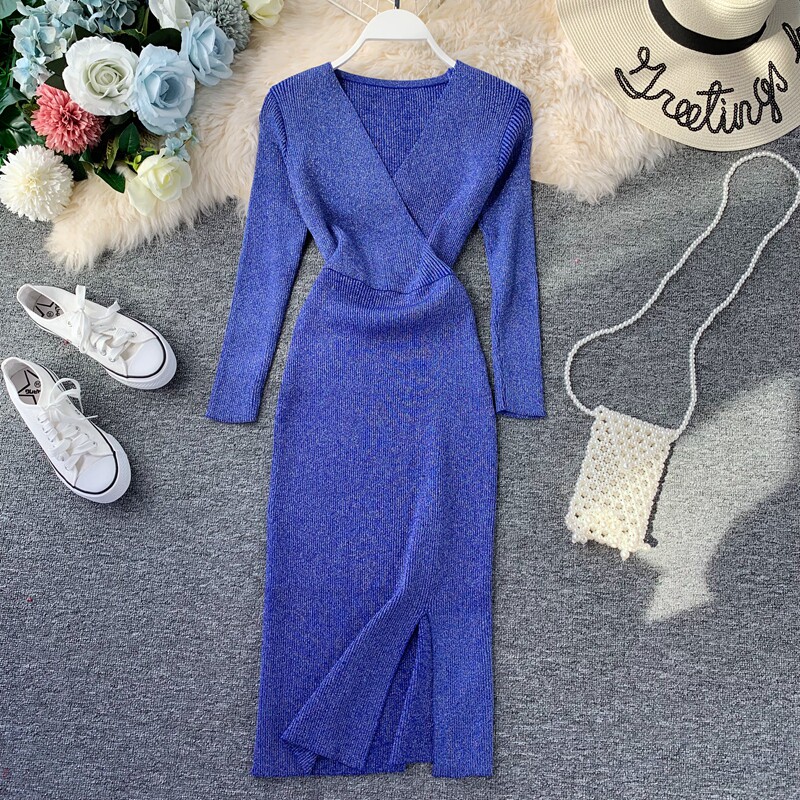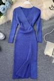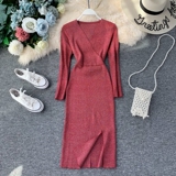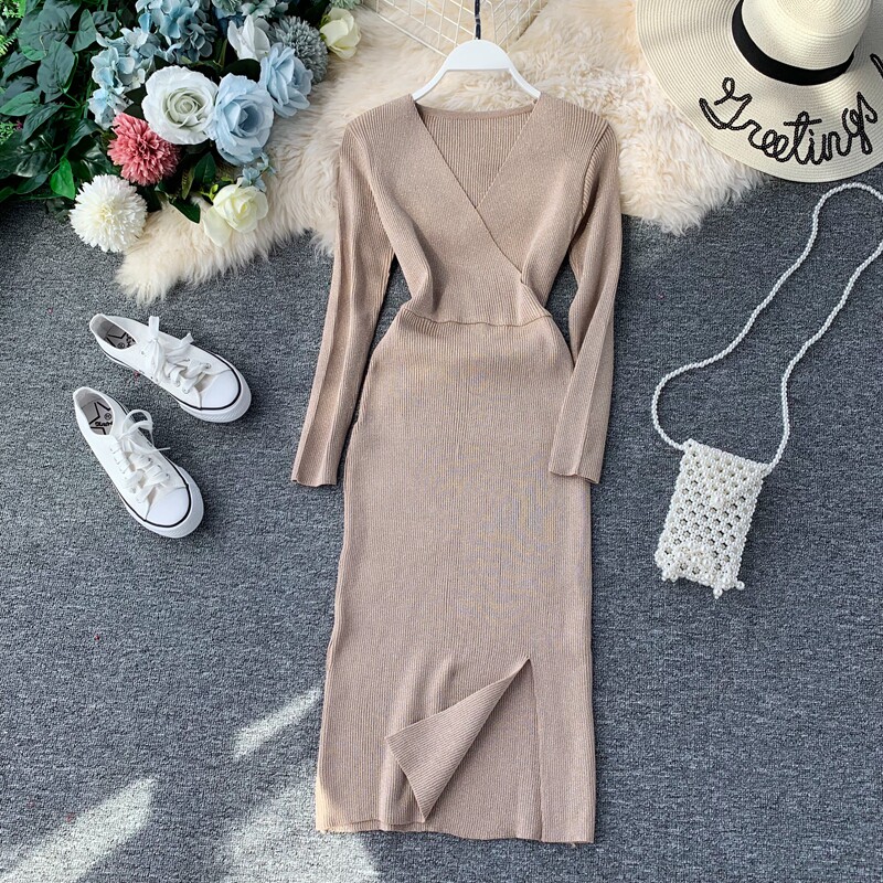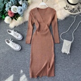 Демисезонный трикотажный базовый свитер, платье, V-образный вырез, в корейском стиле