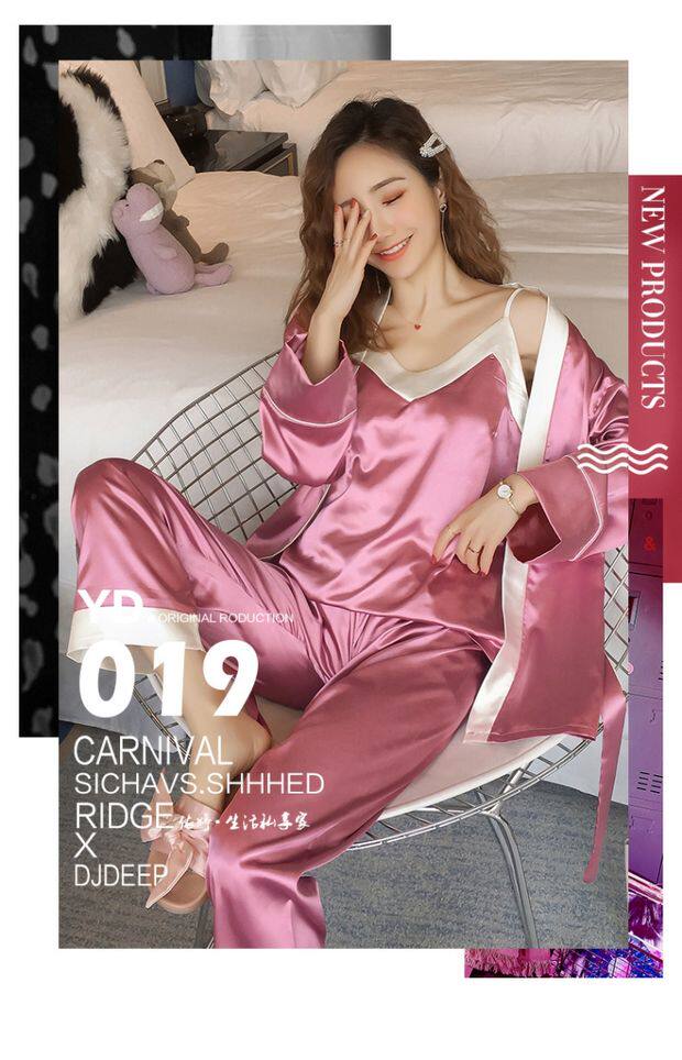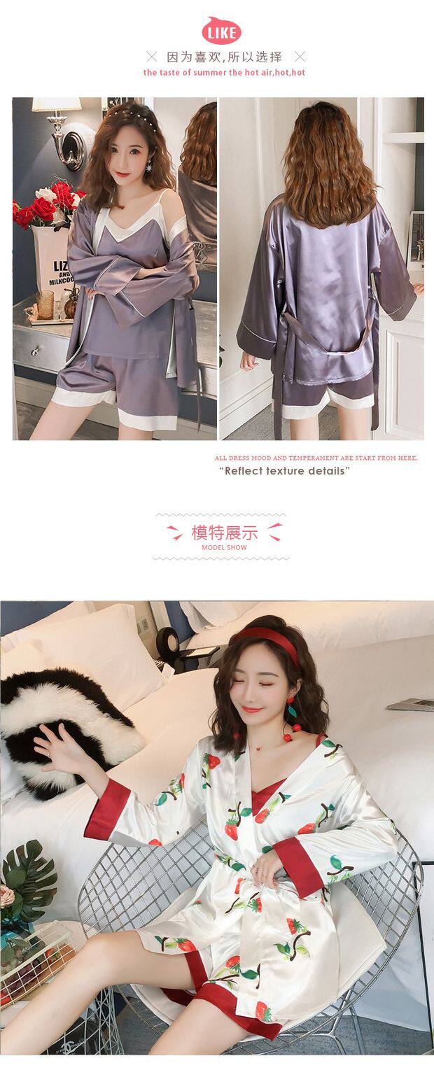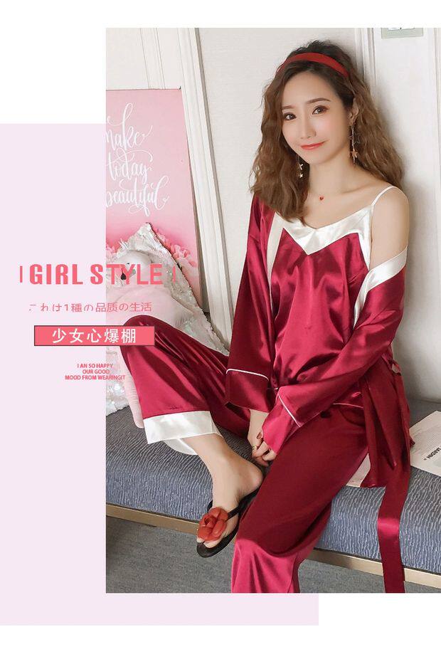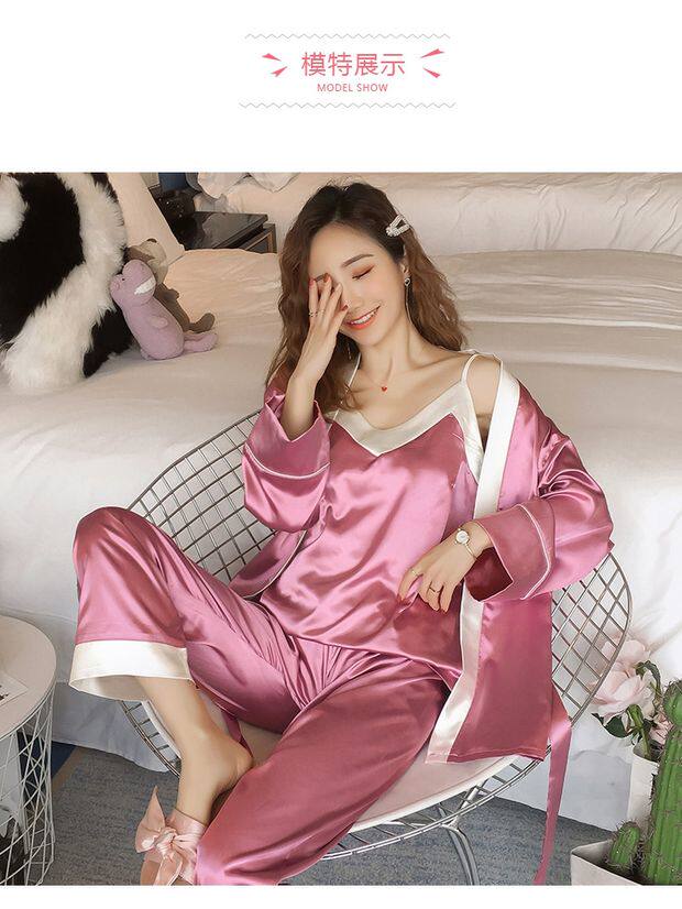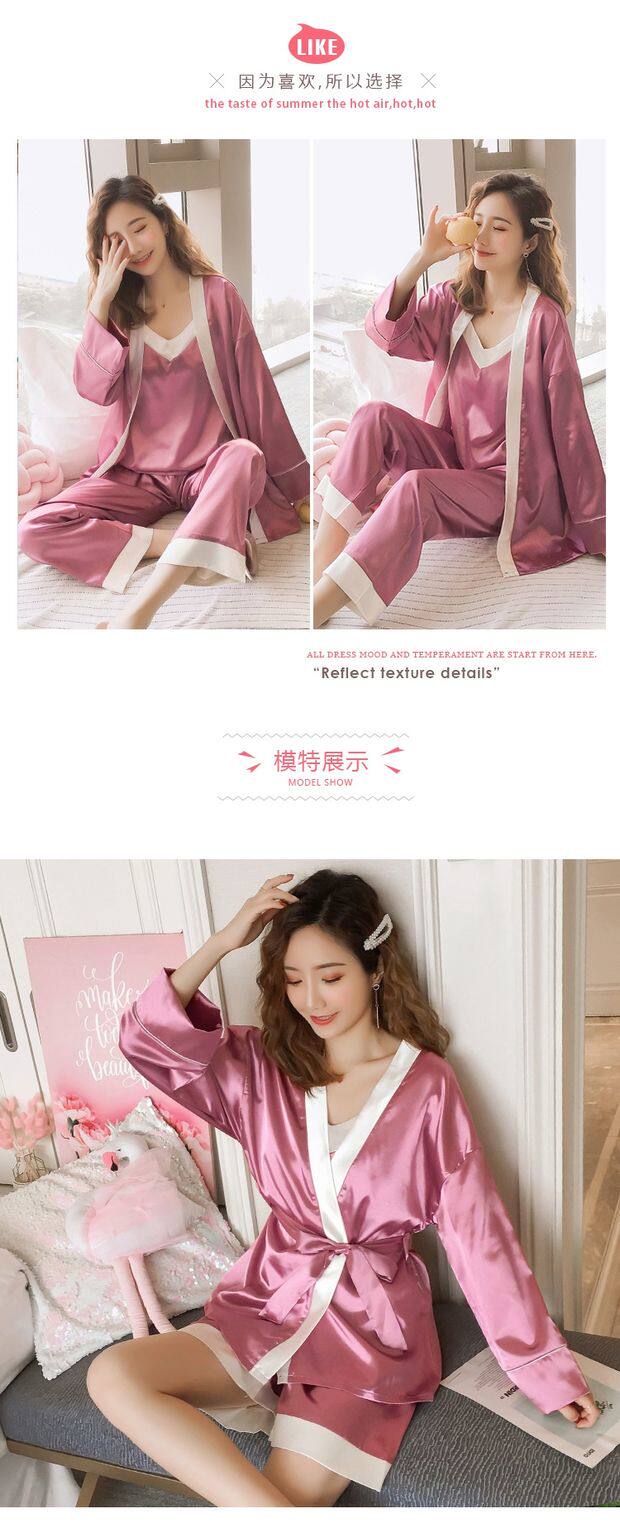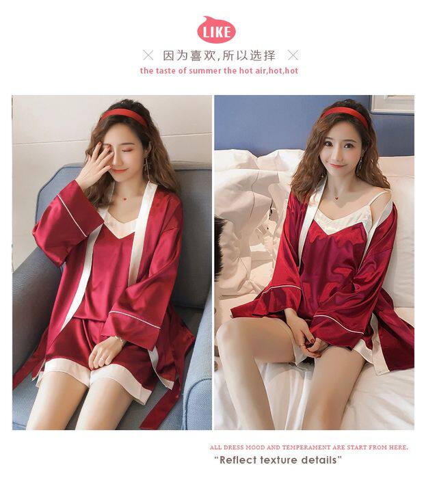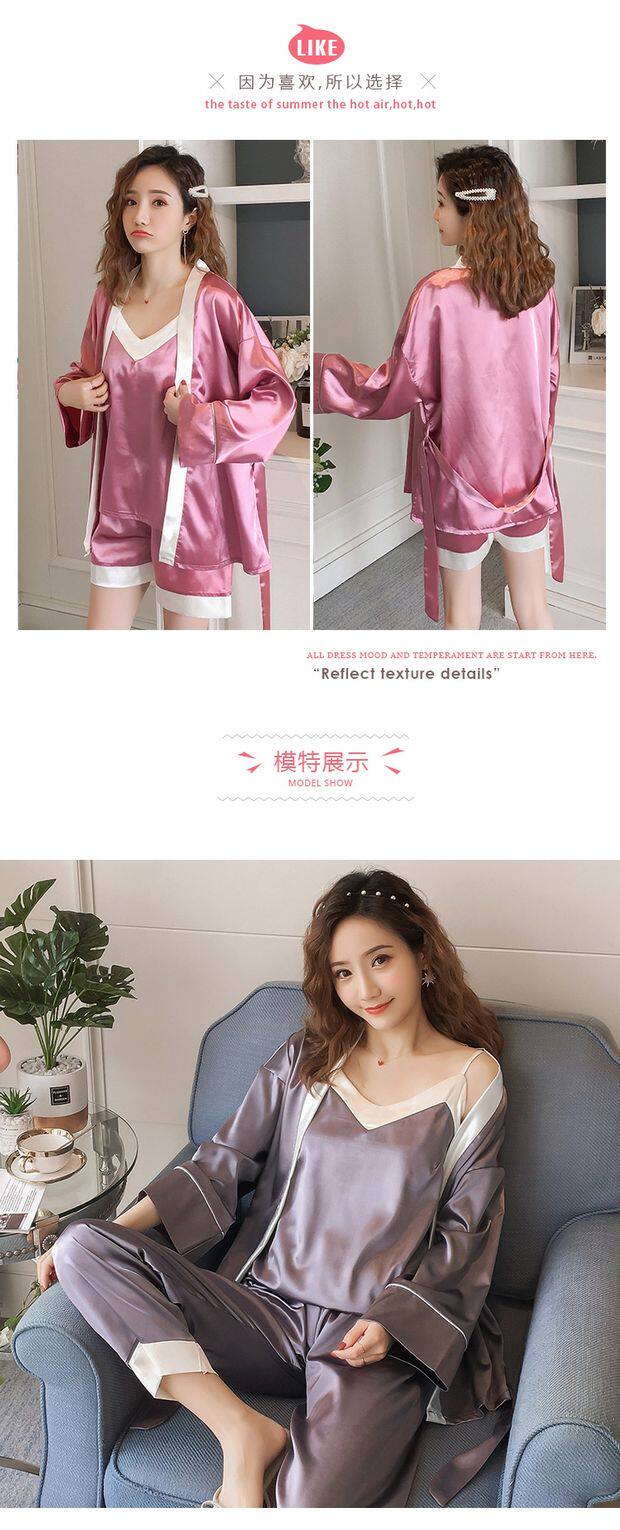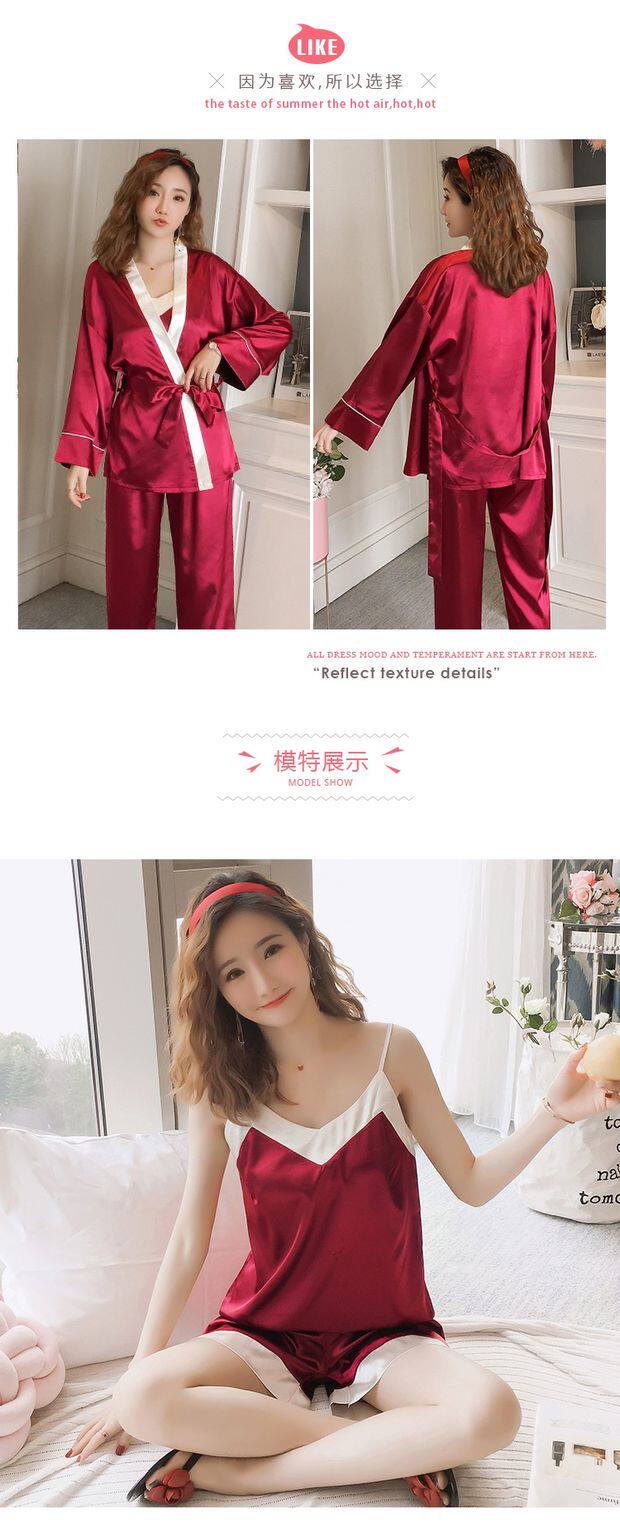 Осенняя летняя тонкая шелковая пижама, шелковый сексуальный комплект, домашняя одежда, эффект подтяжки, 3 предмета, 4 предмета