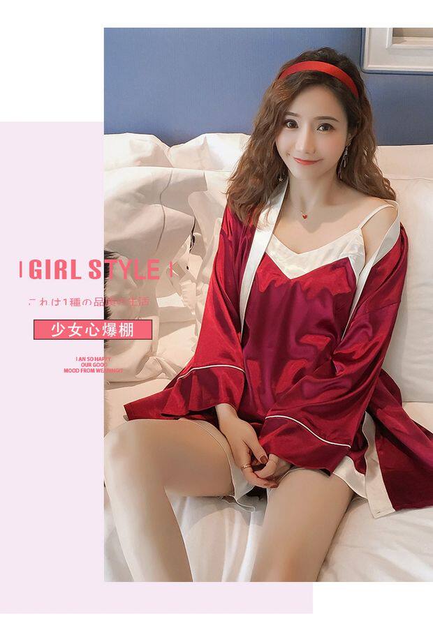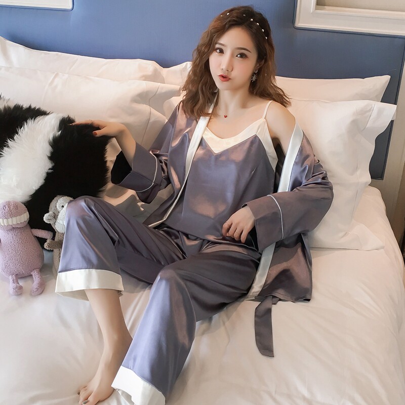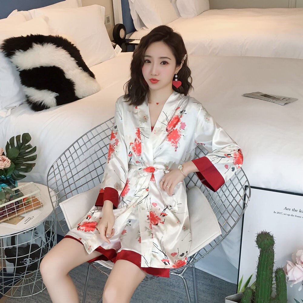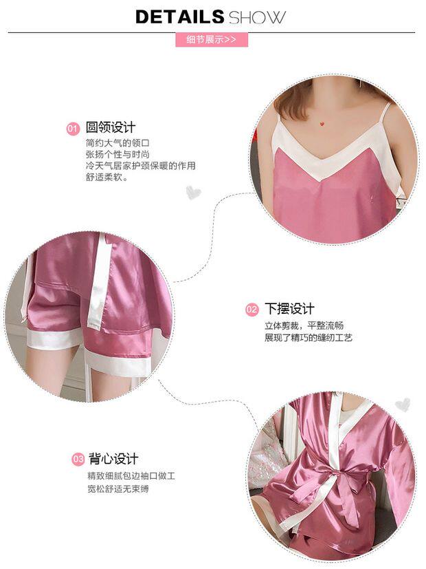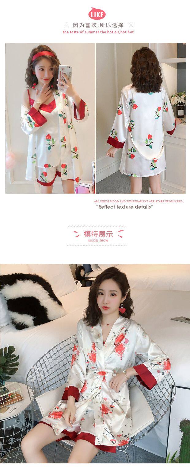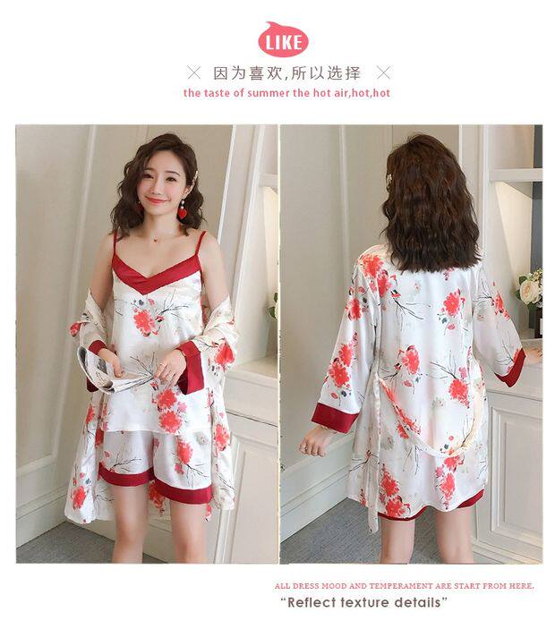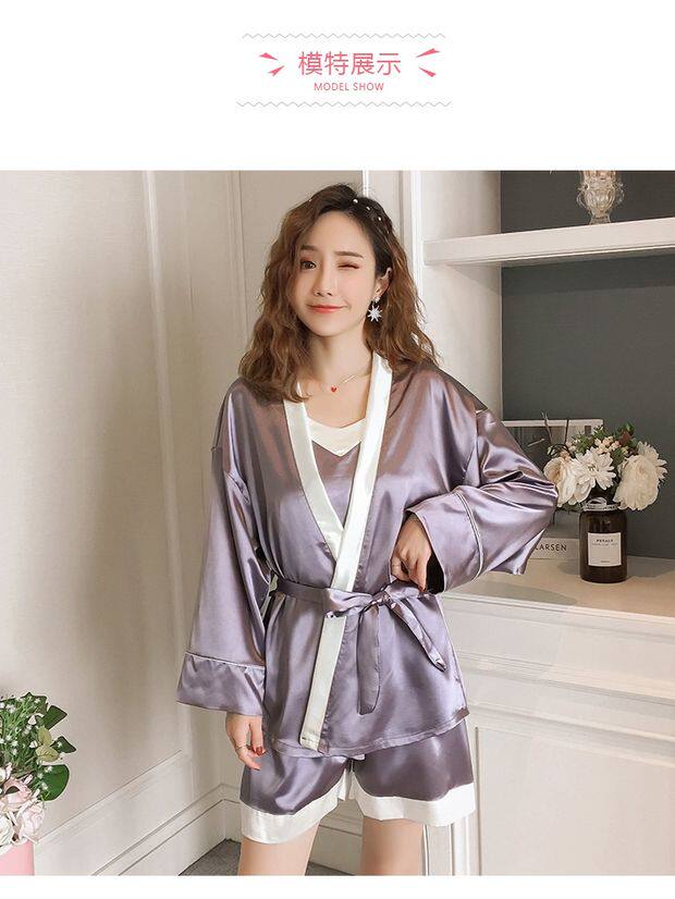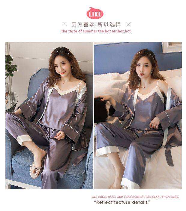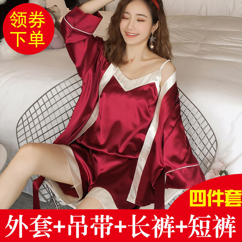 Осенняя летняя тонкая шелковая пижама, шелковый сексуальный комплект, домашняя одежда, эффект подтяжки, 3 предмета, 4 предмета