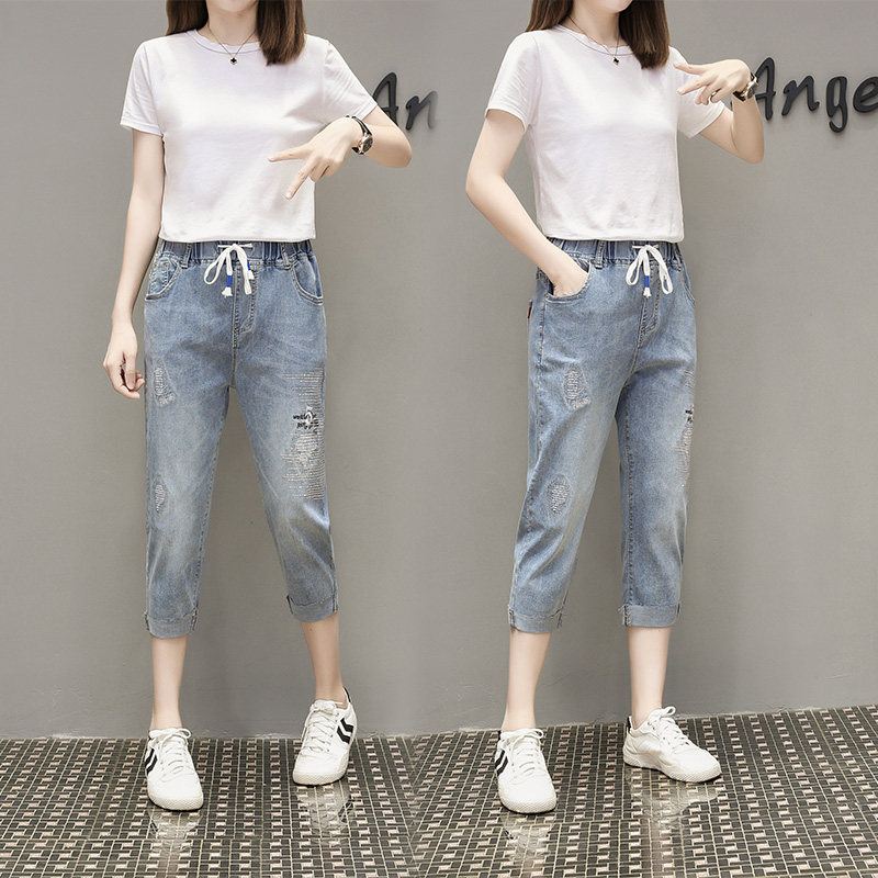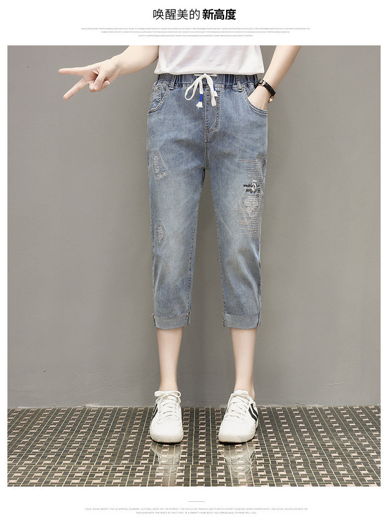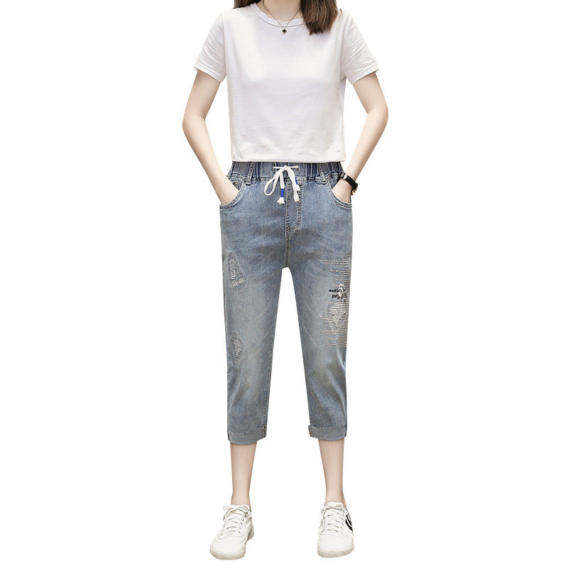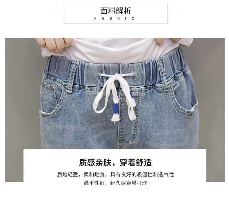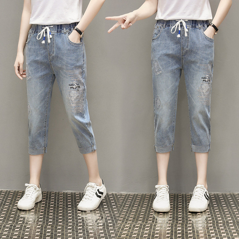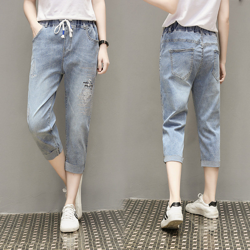 Летняя эластичная летняя одежда, джинсовые штаны, большой размер, подходит для полных девушек, высокая талия, свободный крой