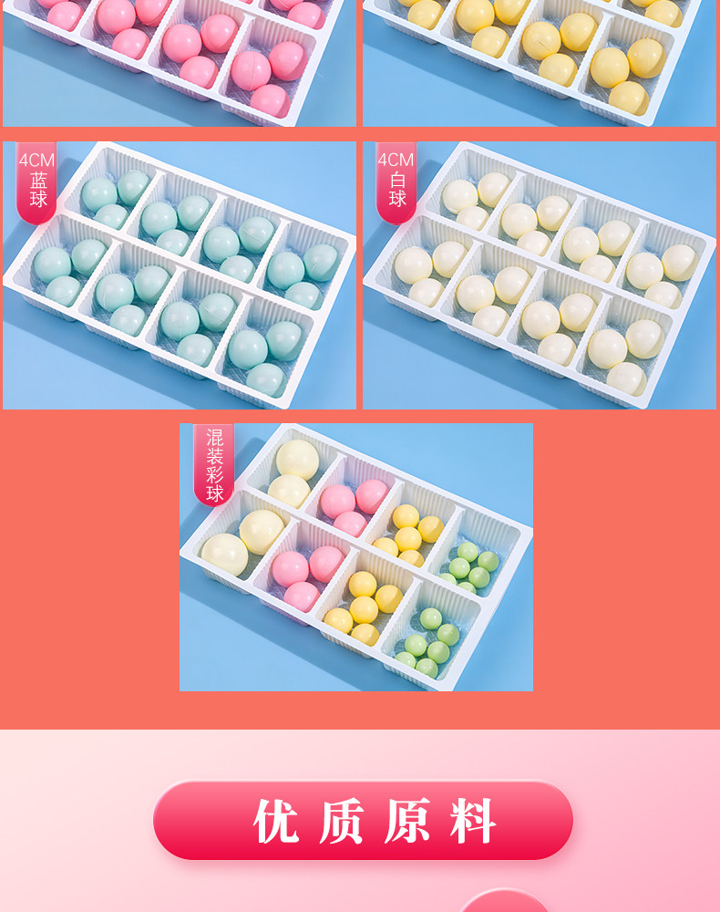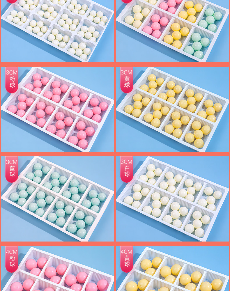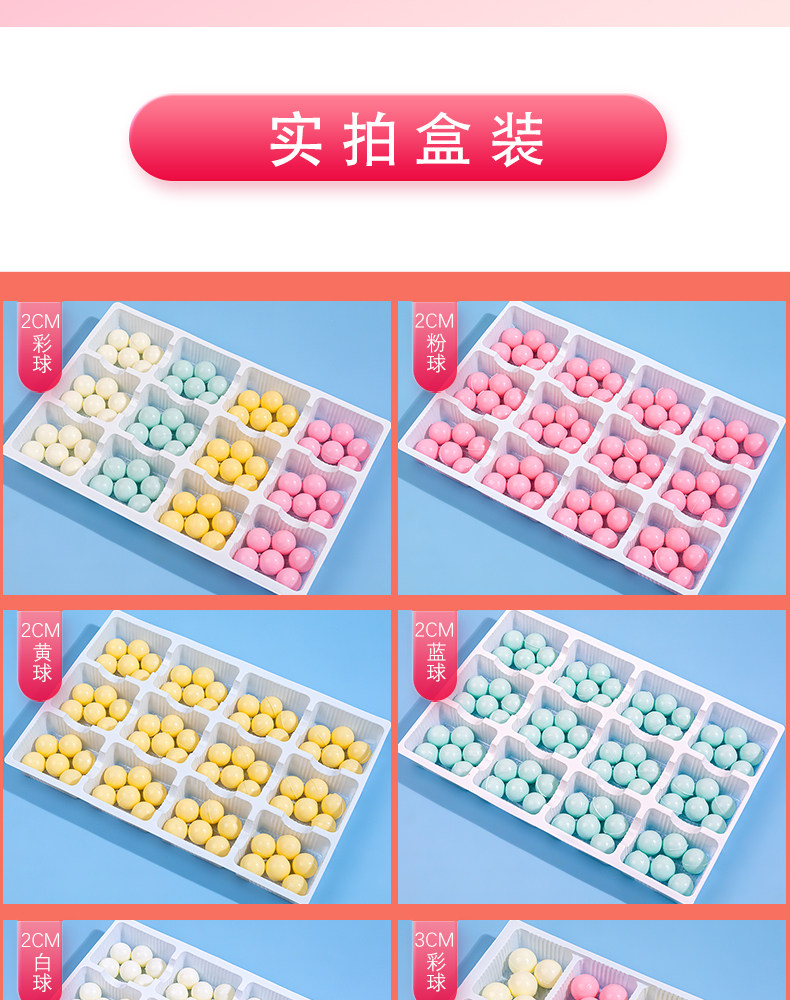 | Еда: | Смешанный размер 32 штуки в коробке, 72 цветных шарика диаметром 2 см., 40 цветных шариков диаметром 3 см., 72 белых шарика диаметром 2 см., Розовые шарики 2см 72 штуки, Желтые шарики 2см 72 штуки, 72 синих шарика 2 см., 40 белых шариков 3 см., Розовые шарики 3см 40 шт., Желтые шарики 3см 40 шт., 40 синих шариков 3 см., 24 белых шарика 4 см., Шарики розовые 4 см 24 шт., Желтые шарики 4см 24 штуки, 24 синих шарика 4 см. |