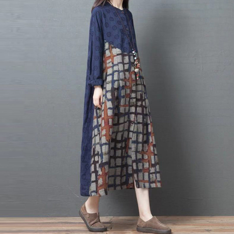 Ретро длинное осеннее платье, лонгслив, рубашка, большой размер, из хлопка и льна, длина миди, в корейском стиле