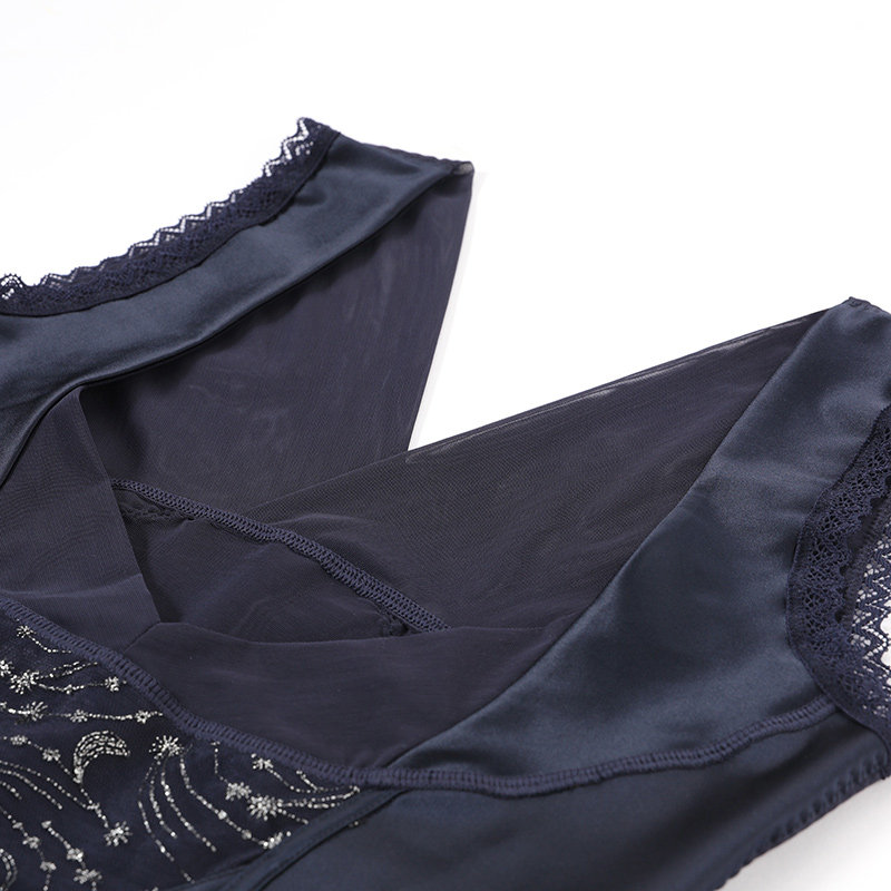 Ткань чувствует себя мягкой и нежной, гладкой и гладкой, дает подходящее давление при ношении близко к телу, и имеет плотную форму. Тело украшено блестящими серебряными узорами, изысканными и романтичными.
