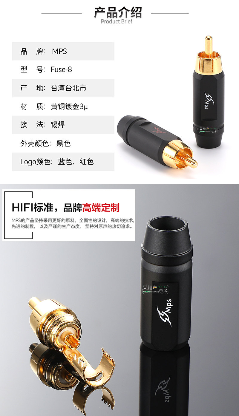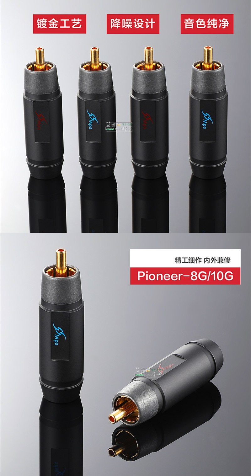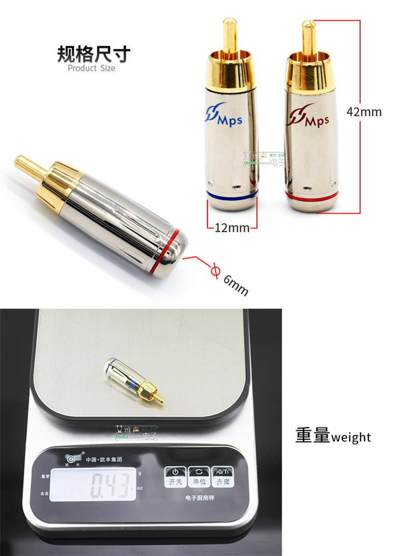 Голова MPS RCA, тонкая полировка исследований делает поверхность до зеркала -плавно.Будь то тройные, средние и басы, он был дополнительно улучшен. С щедрым хромированным внешним видом он подходит для голов RCA, которые подходят для всех классовых проводов. Материал: латунное покрытие настоящего золота