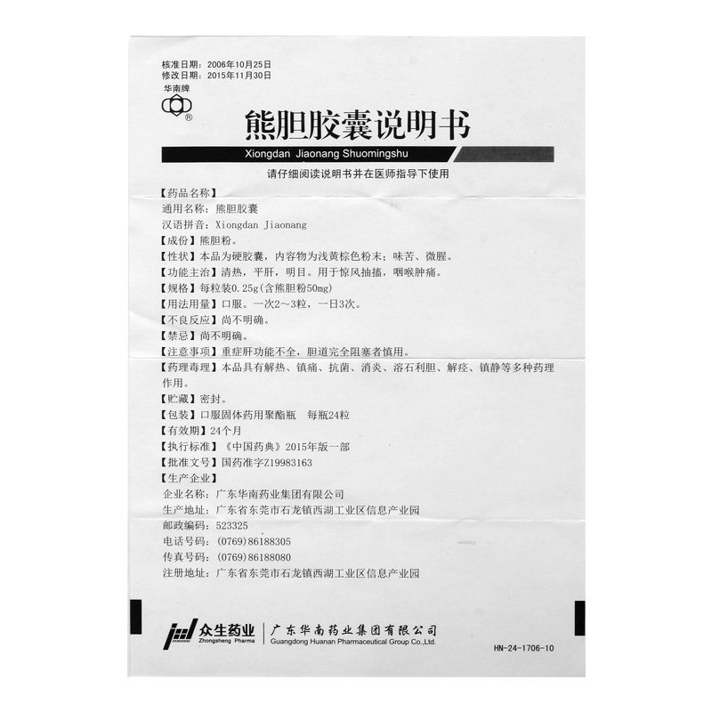 华南牌 Капсула желчи медведя 0,25 г*24 капсулы*1 бутылка/коробка горла, боль, гепатит, гепатит, судороги, тепло, печень и площадь печени