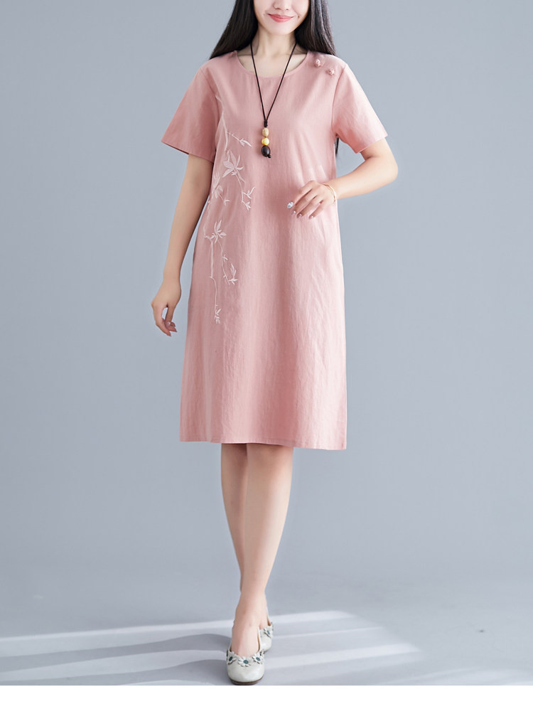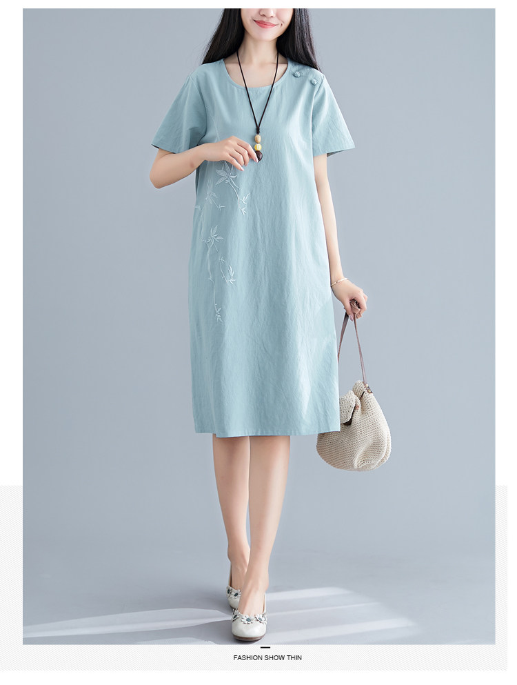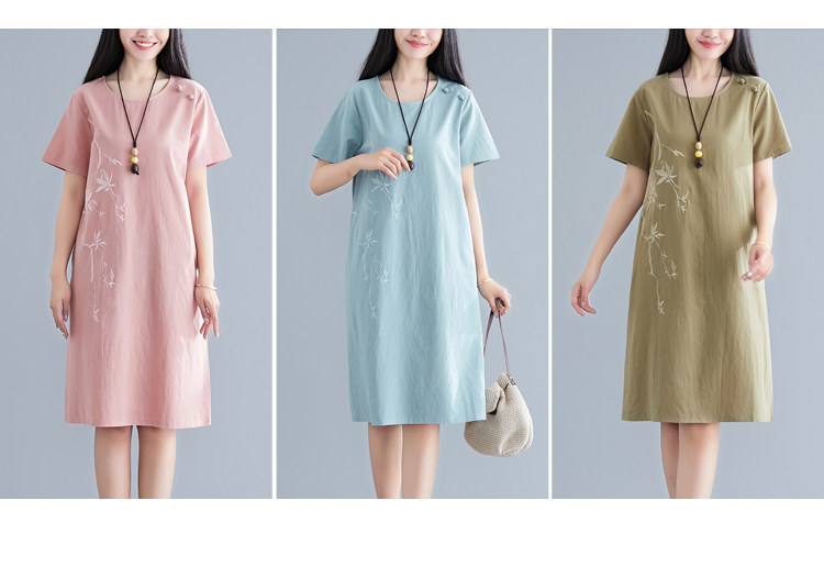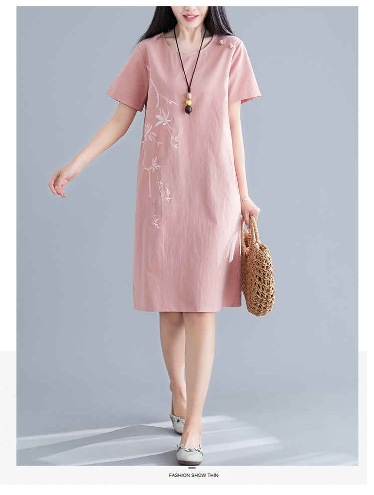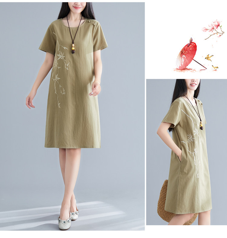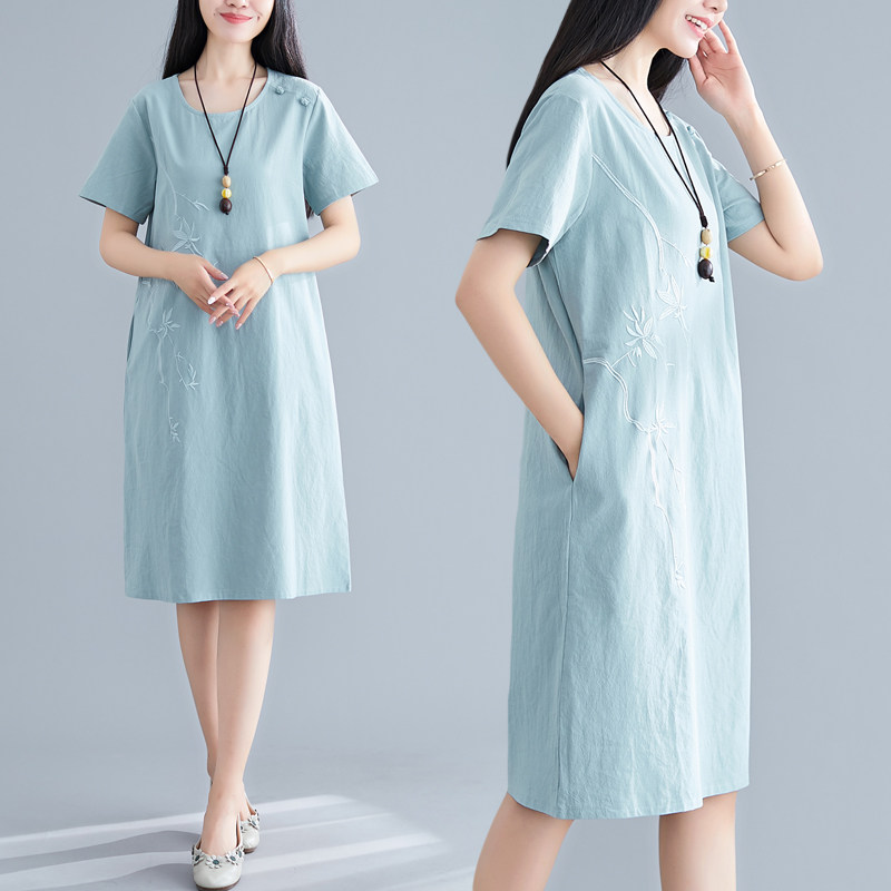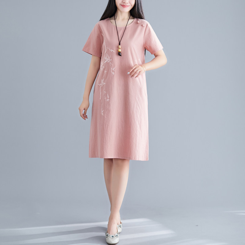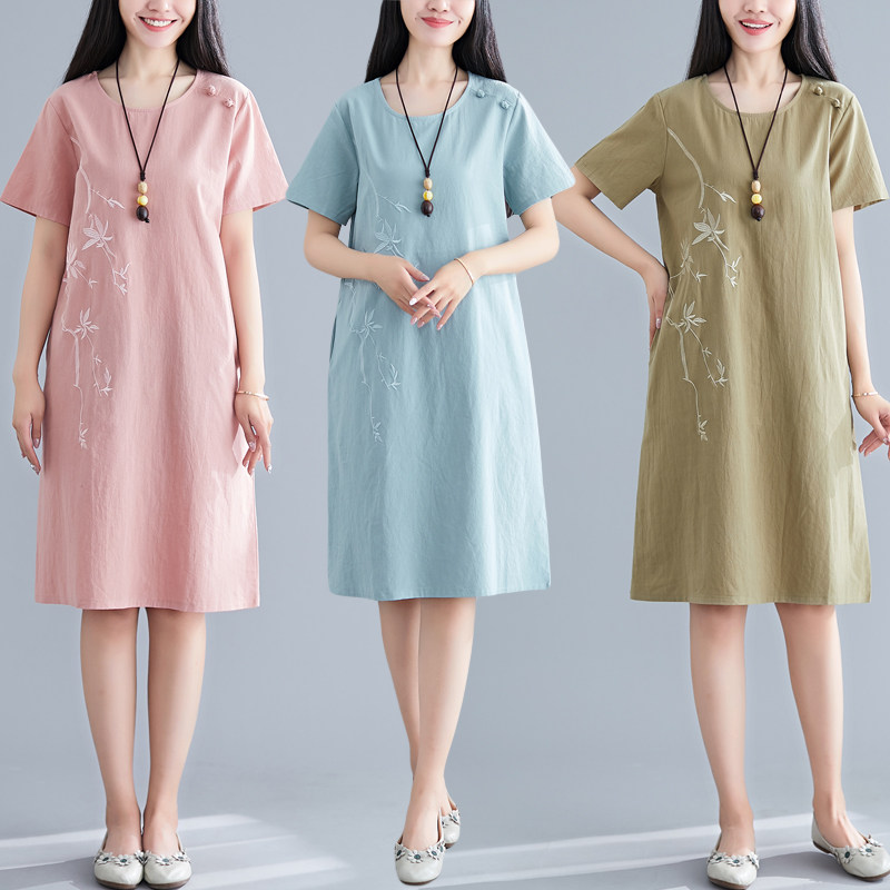 Летнее платье с коротким рукавом, летняя одежда, длинная юбка, с вышивкой, из хлопка и льна, оверсайз, свободный крой, по фигуре, подходит для подростков, средней длины, длина макси