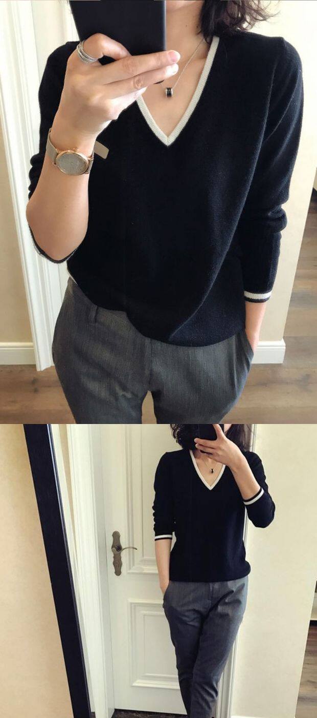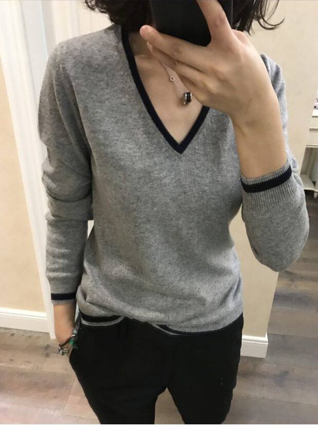 Демисезонный кашемировый шерстяной трикотажный свитер, оверсайз, V-образный вырез, большой размер