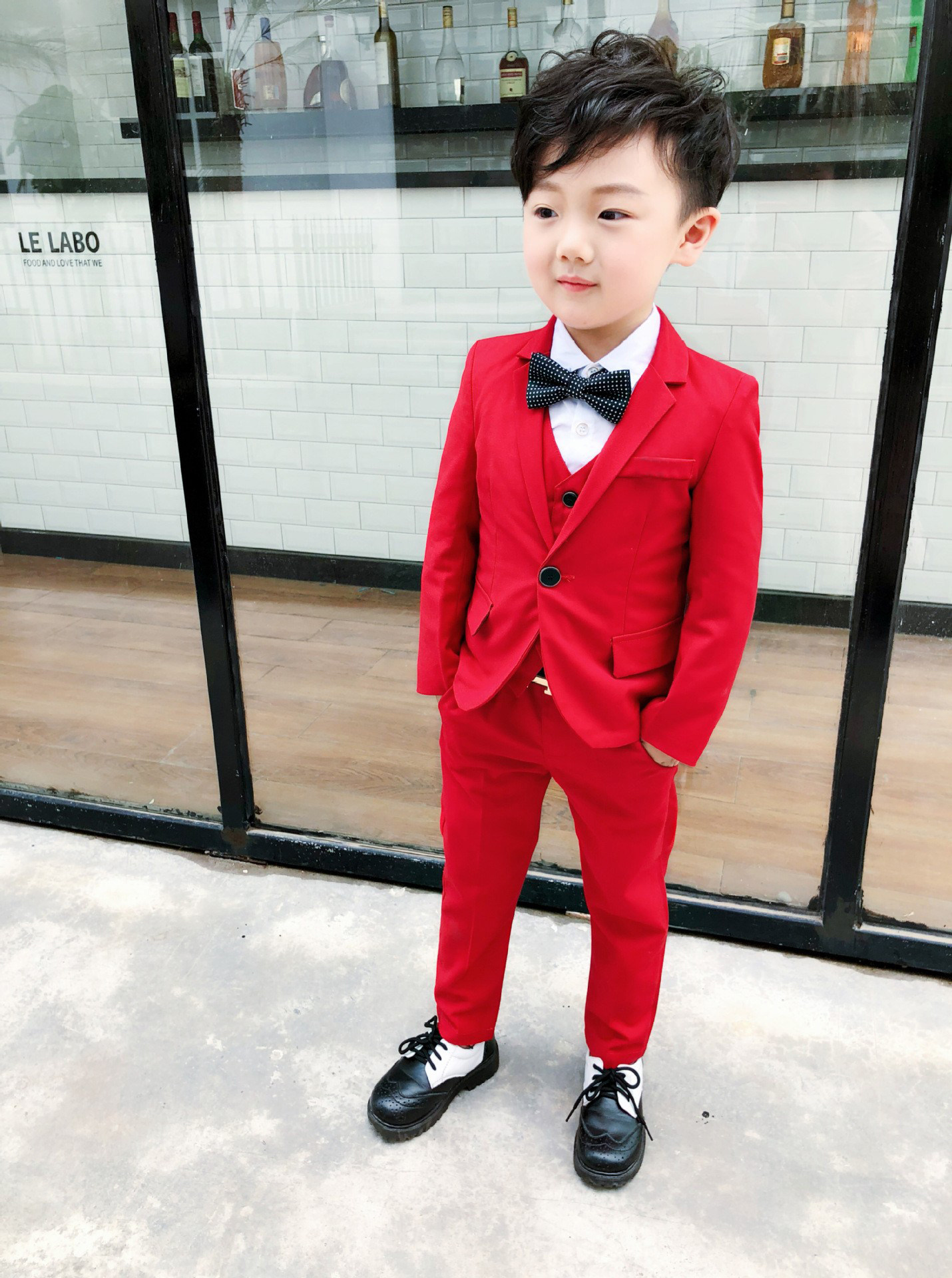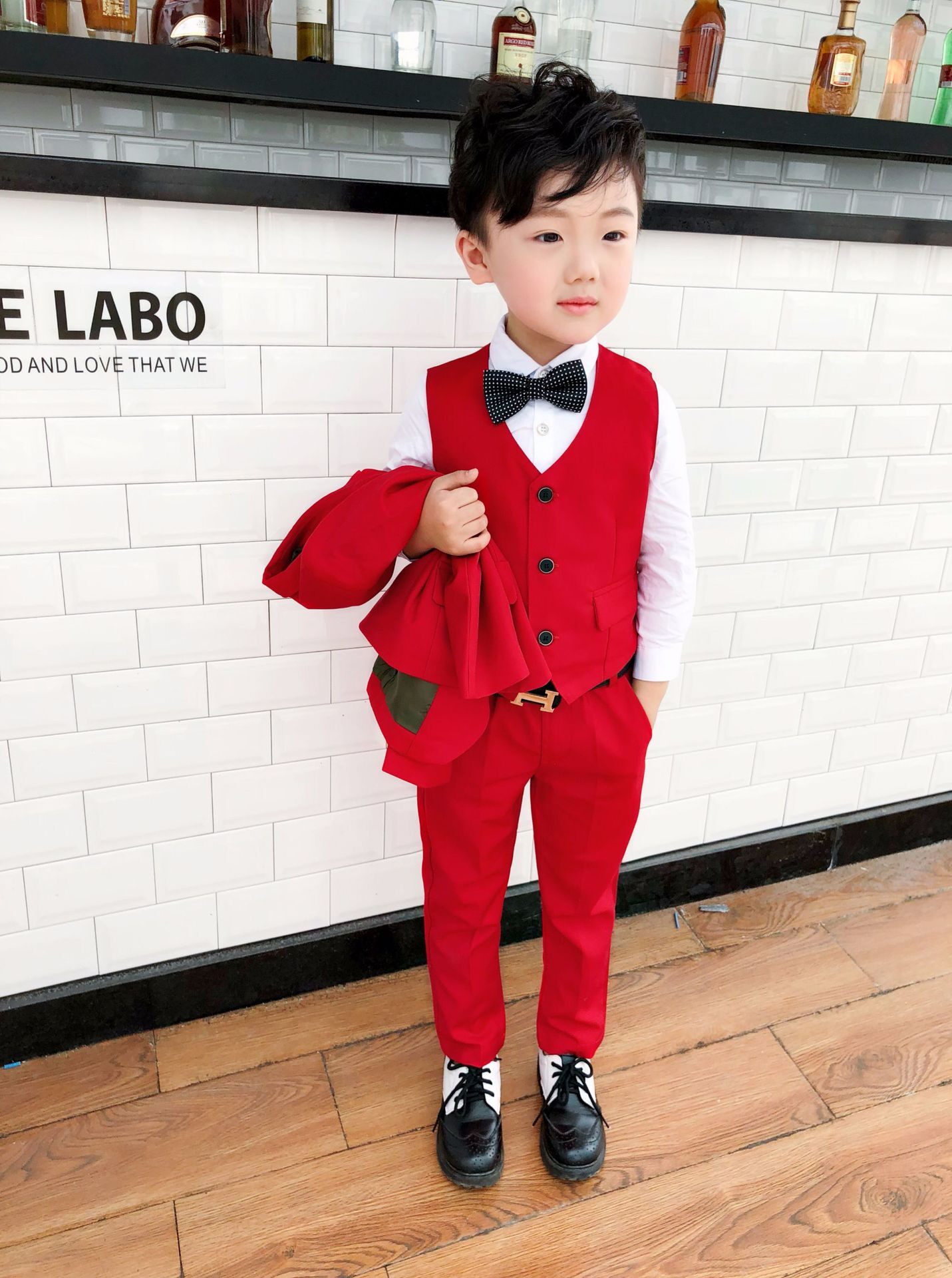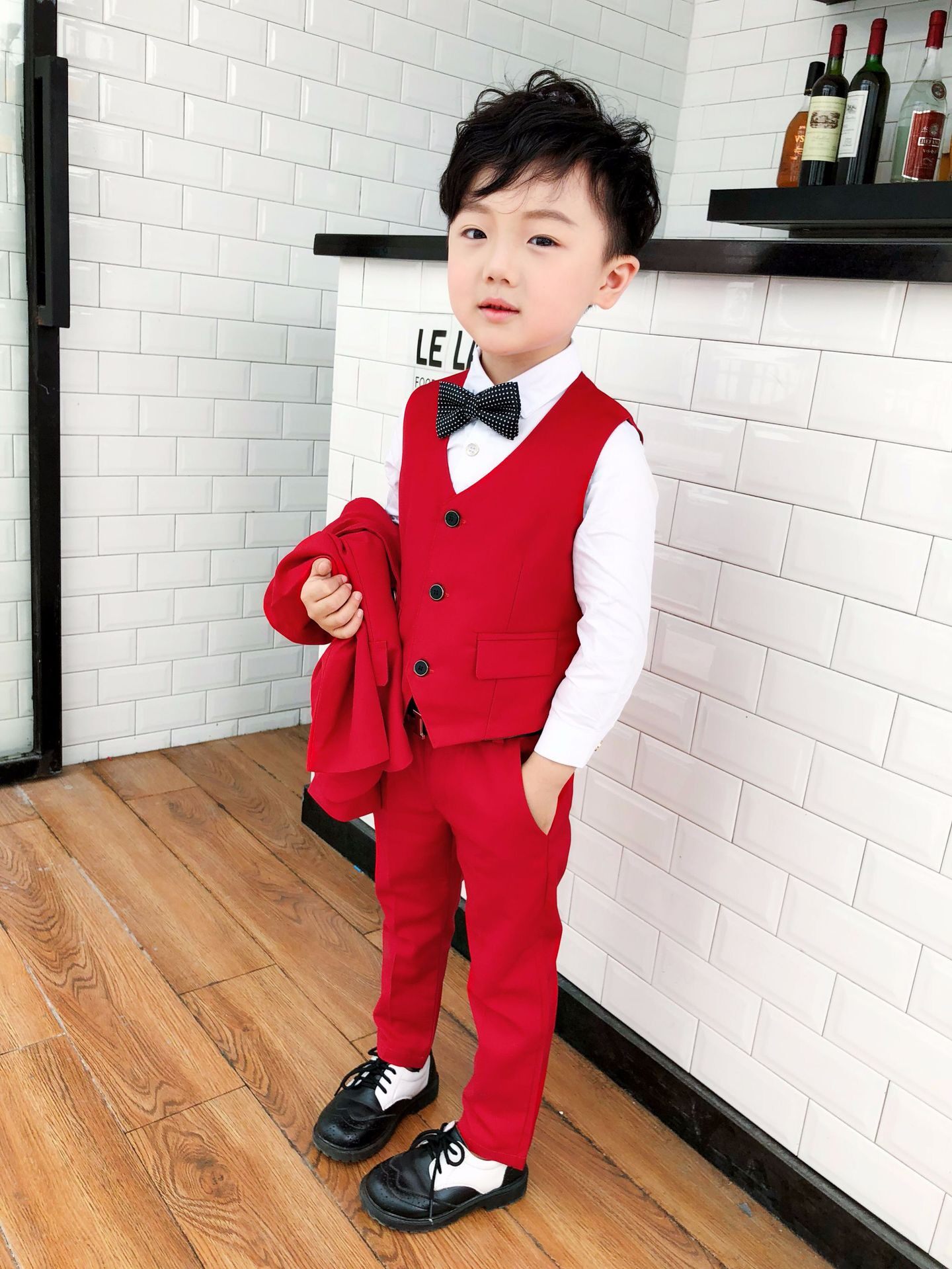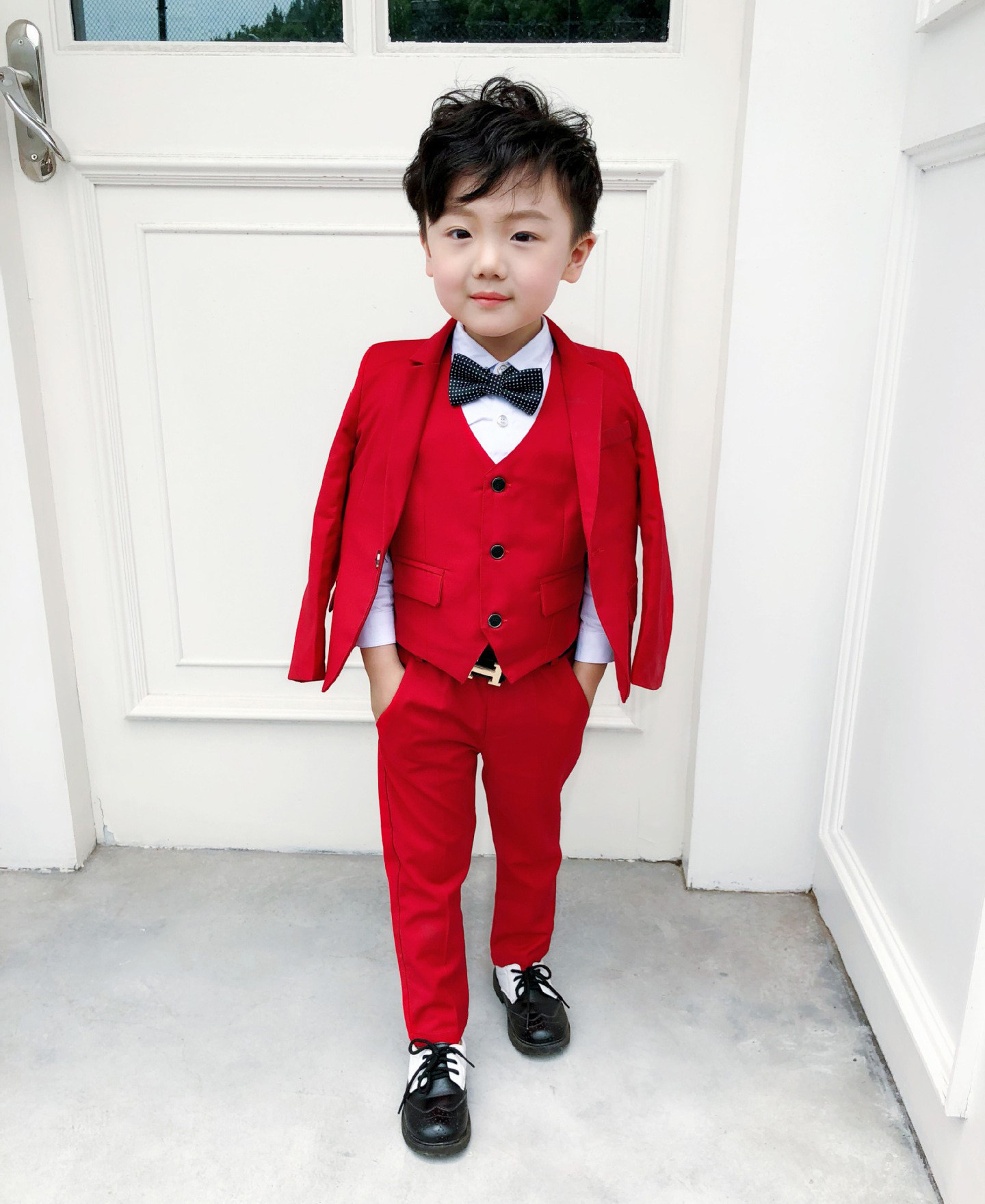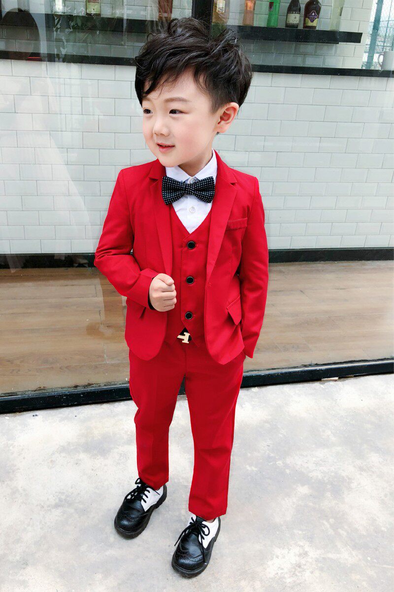 - Красный комплект, куртка, штаны, жилет, рубашка, галстук, галстук-бабочка, 4 шт