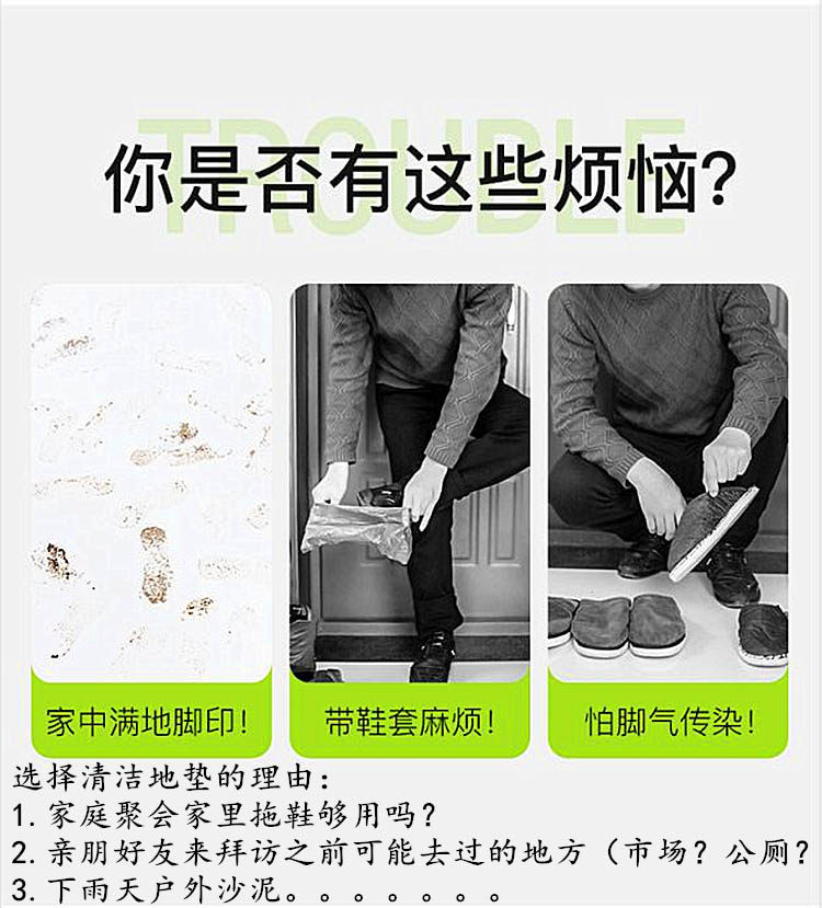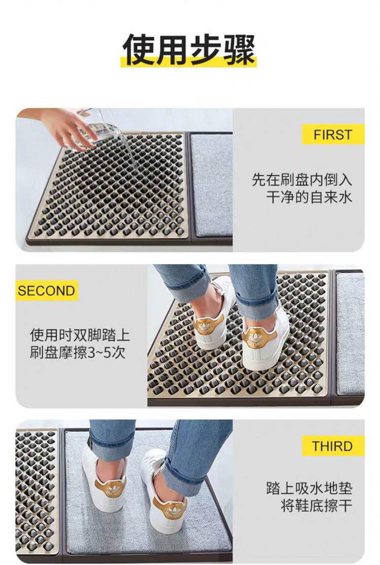 [使用本产品前请加入清水、适量清洁剂(如洗衣液、沐浴露或清洁精)及稀释消毒水,][一般家庭3-5天换水一次(具体根据使用人次或频率而变)。使用时只要在本产品刷棉上来回摩擦2-4次,踏上配制的][吸水地毯,即可达到理想的鞋底清洁效果。(使用环境温度2c]°-50c°)