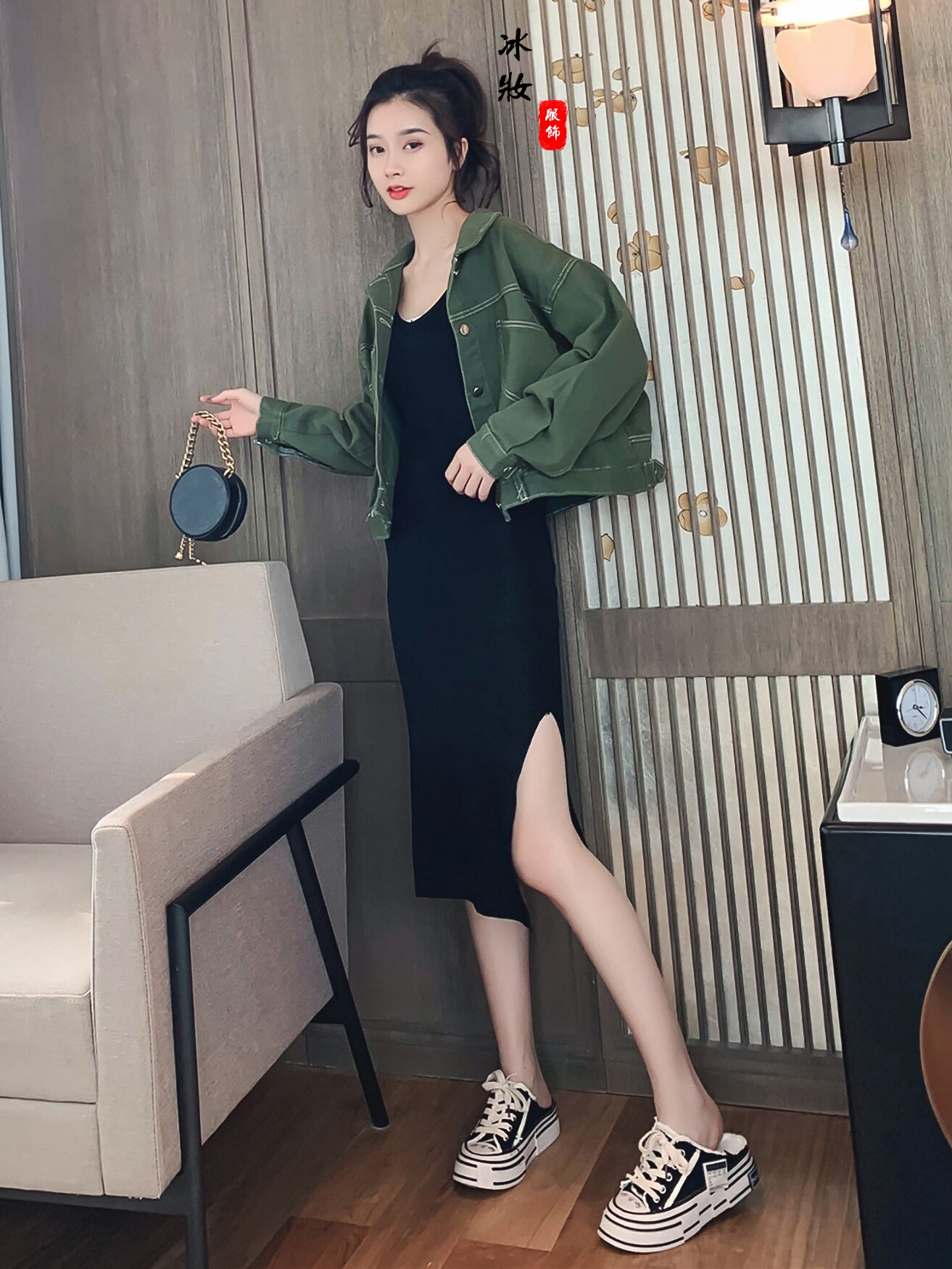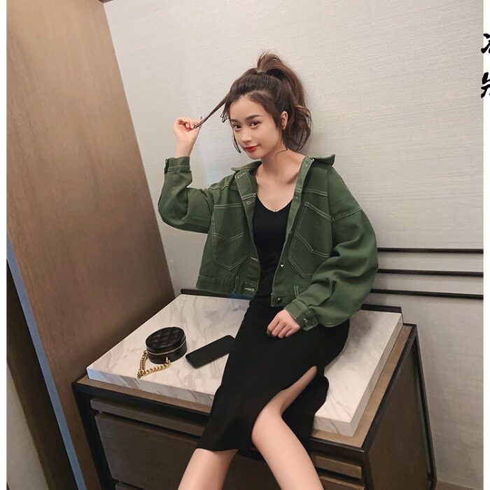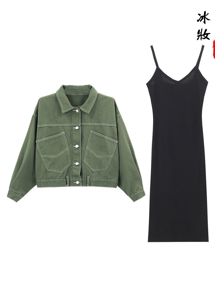 Джинсовый комплект, летняя зеленая летняя одежда, куртка, черное платье-комбинация, 2019, в корейском стиле