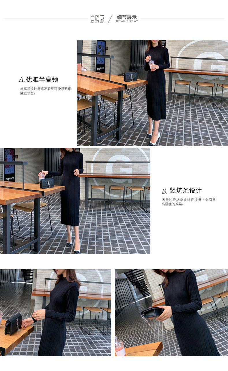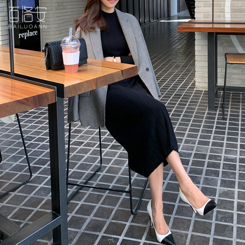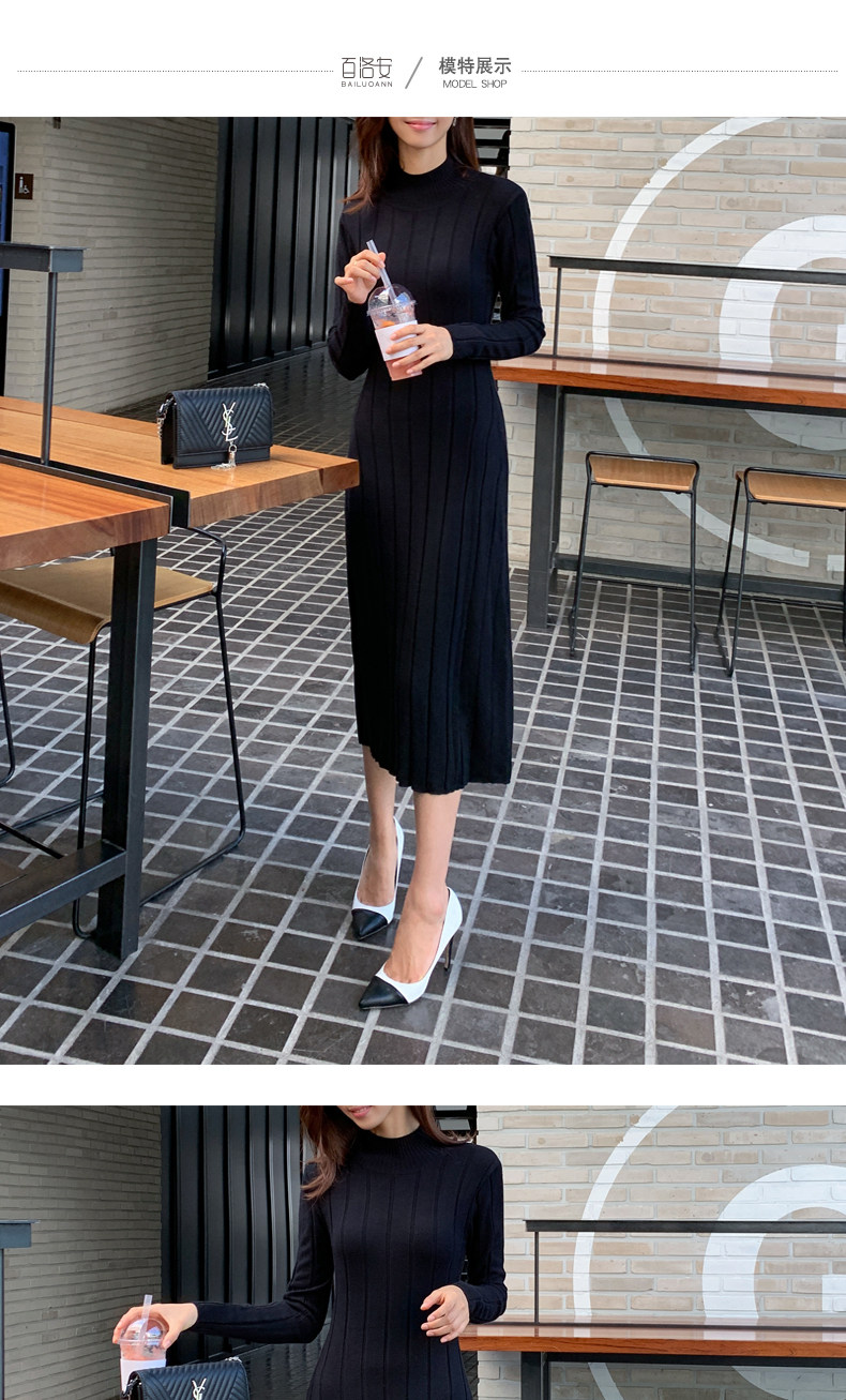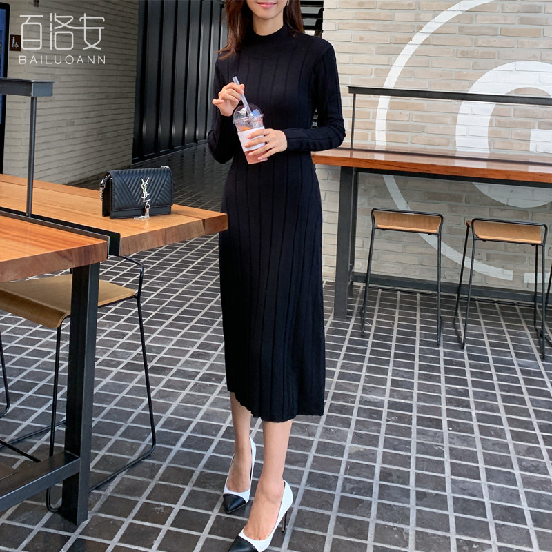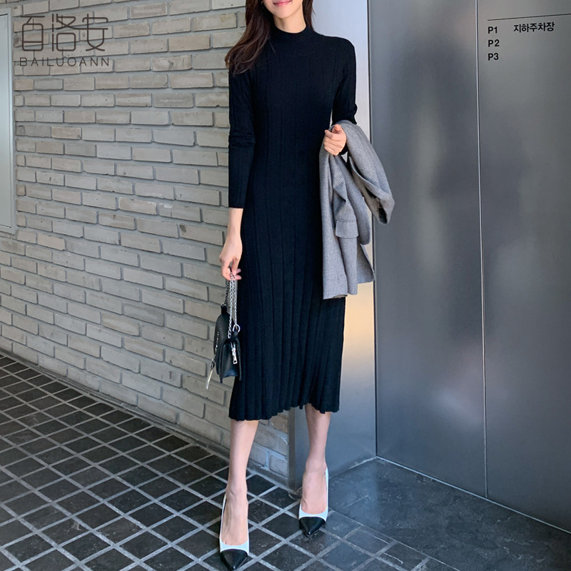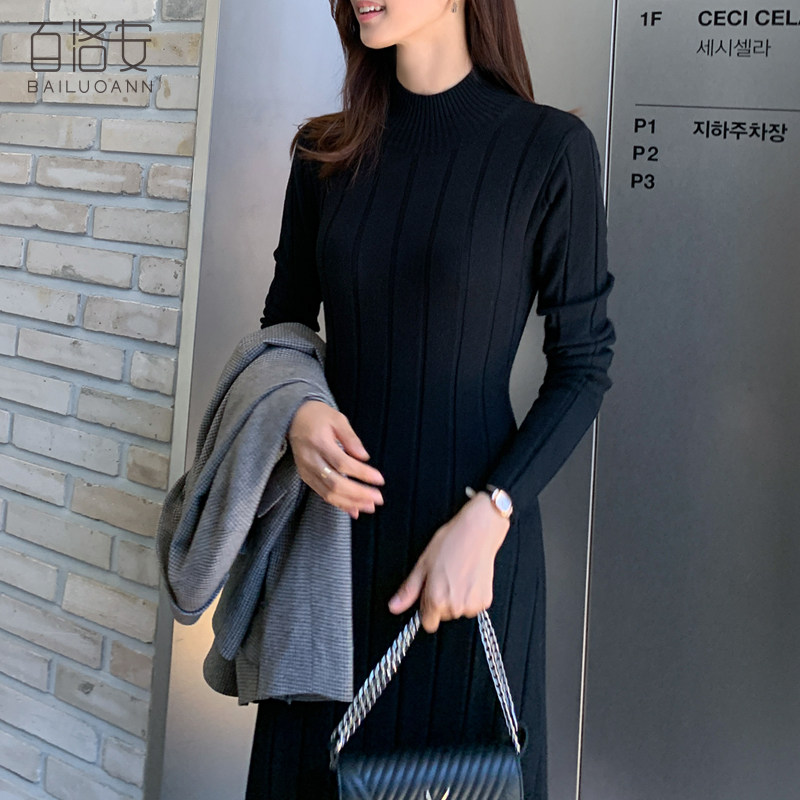 百洛安 Базовый свитер, зимняя длинная юбка, приталенное трикотажное платье, высокий воротник, в корейском стиле