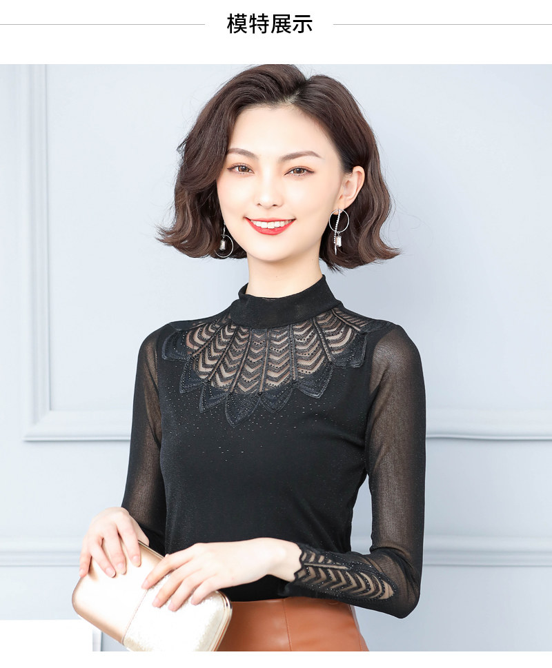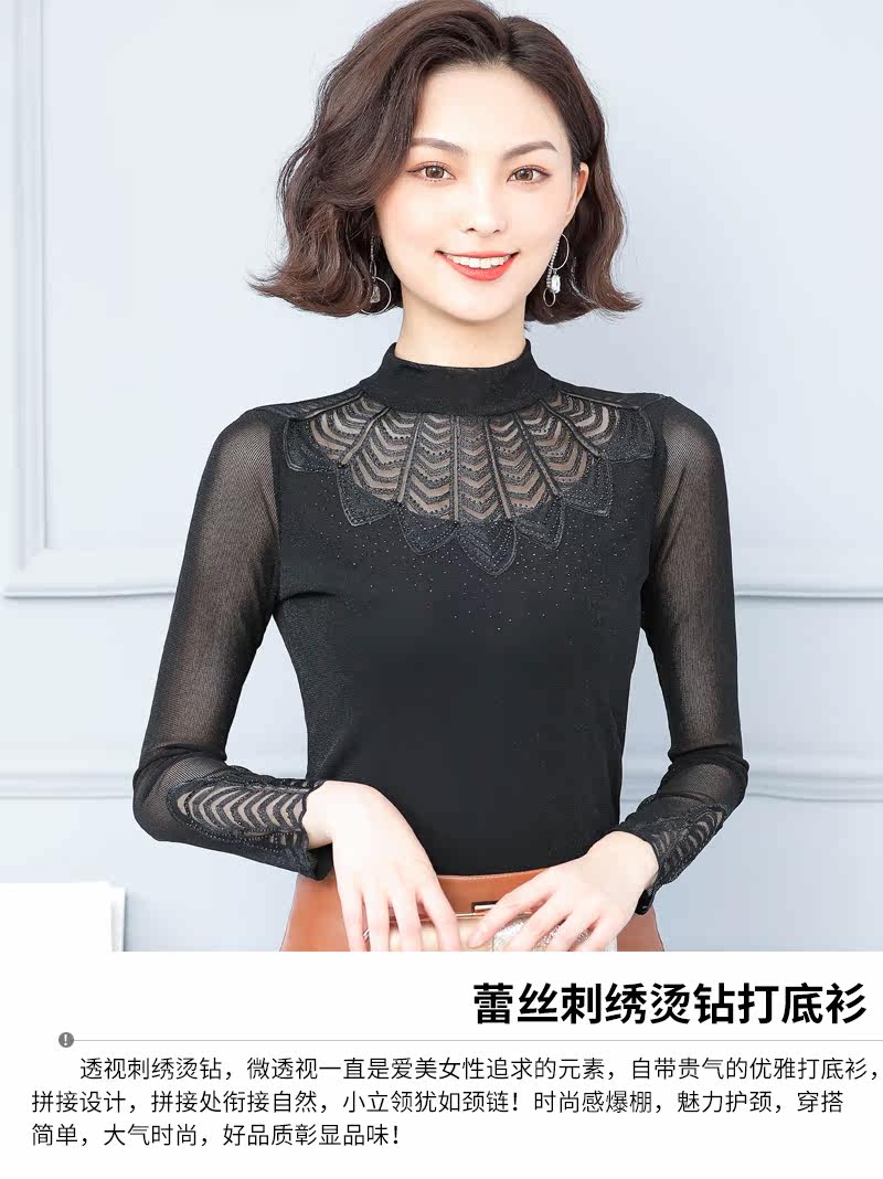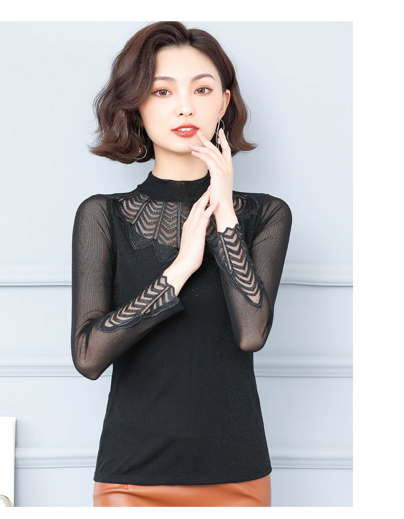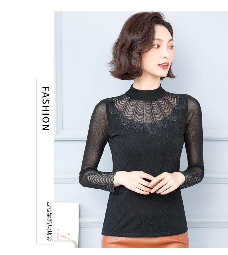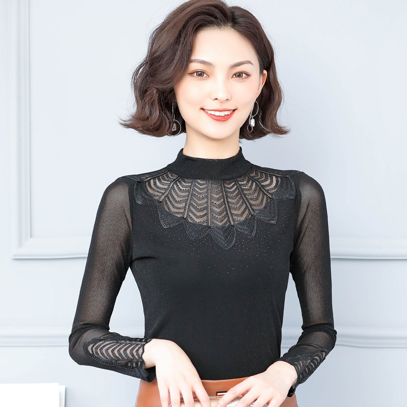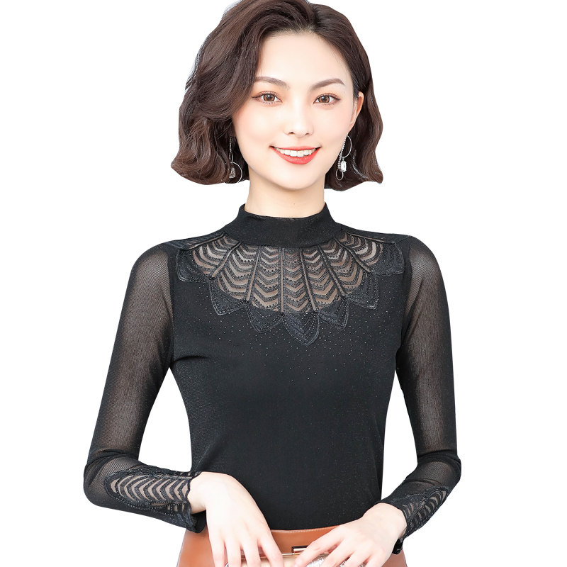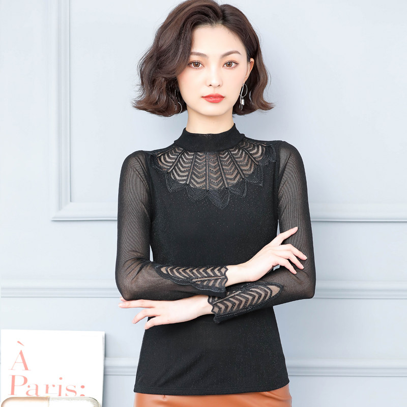 Кружевная шелковая приятная телу осенняя тонкая футболка, высокий воротник, коллекция 2022