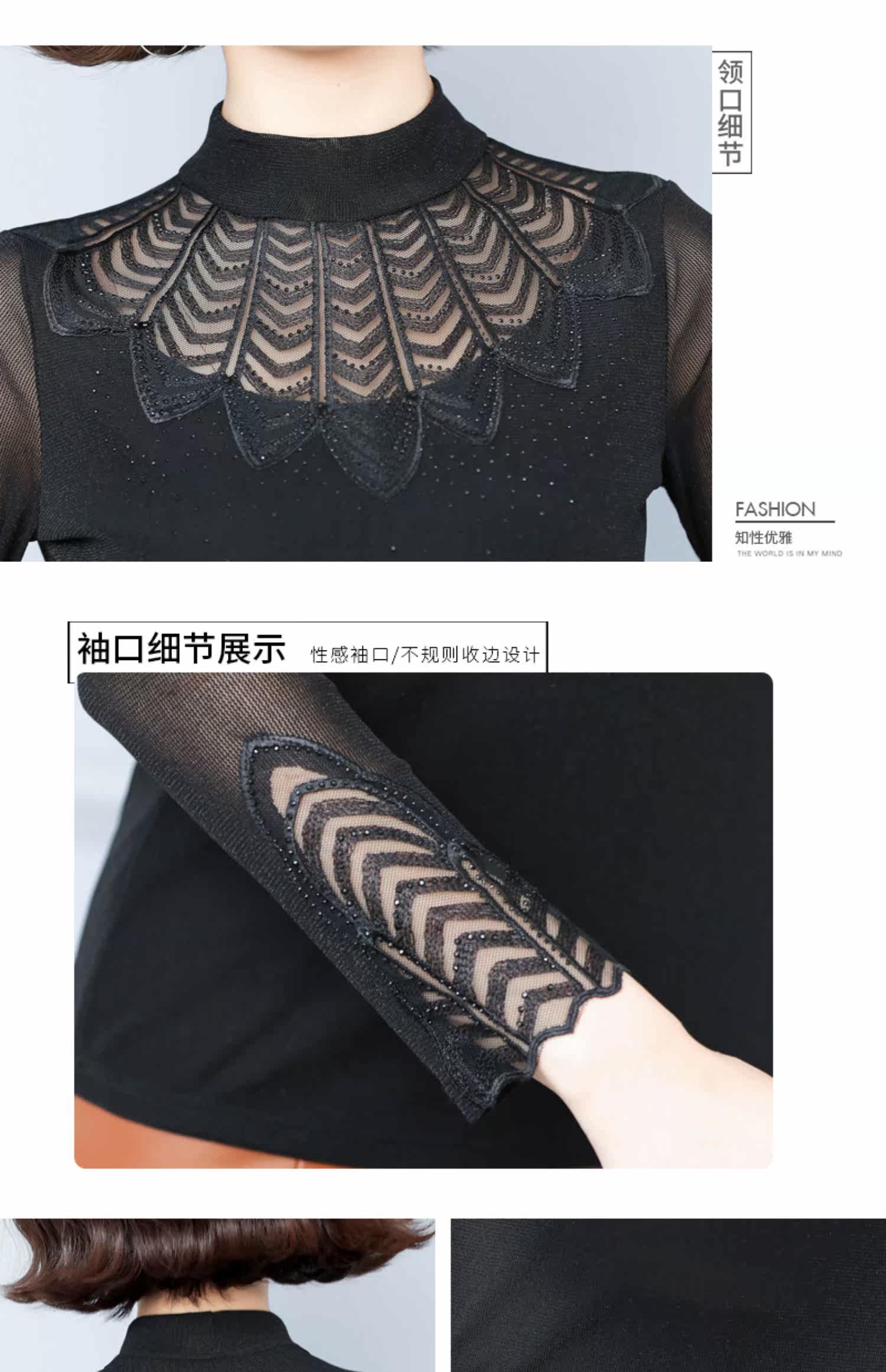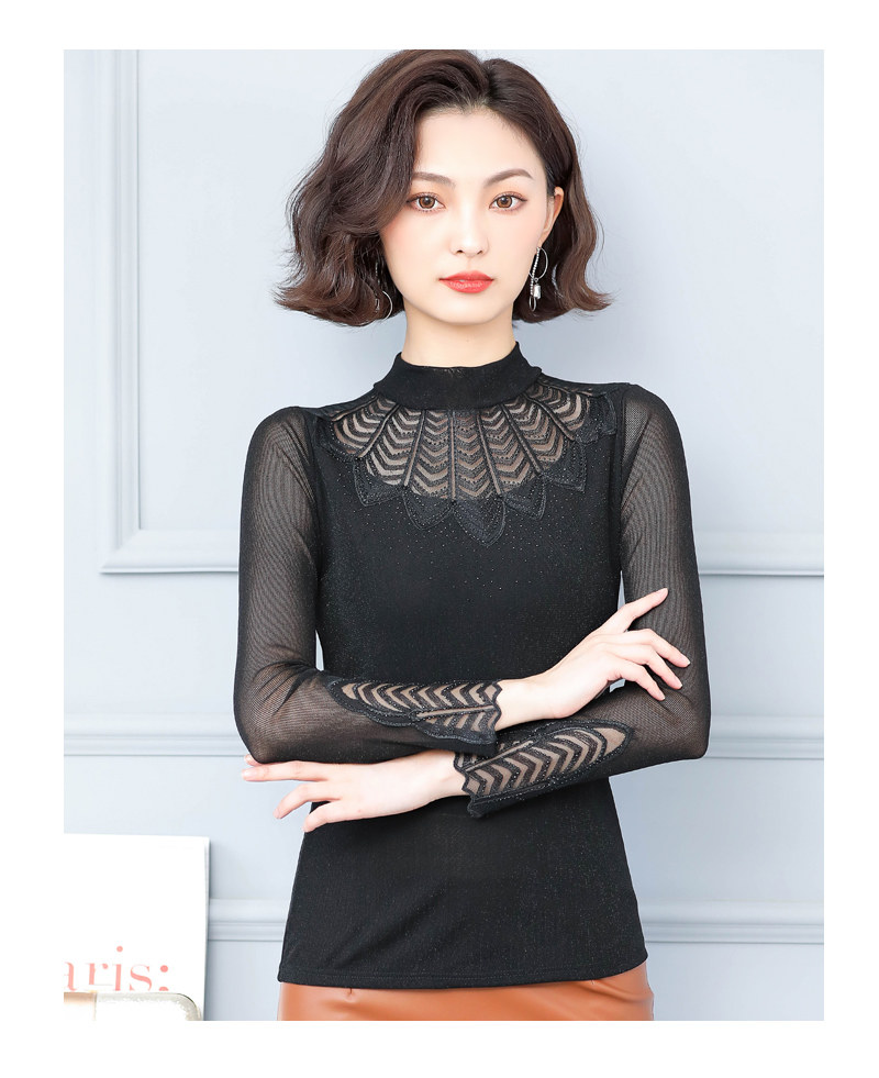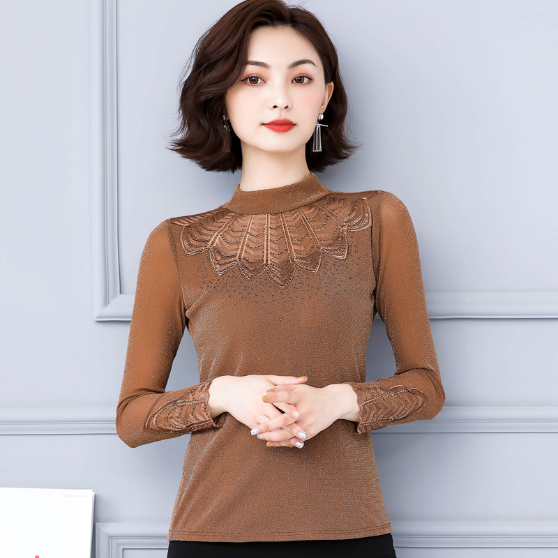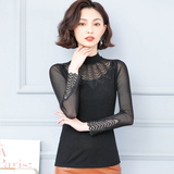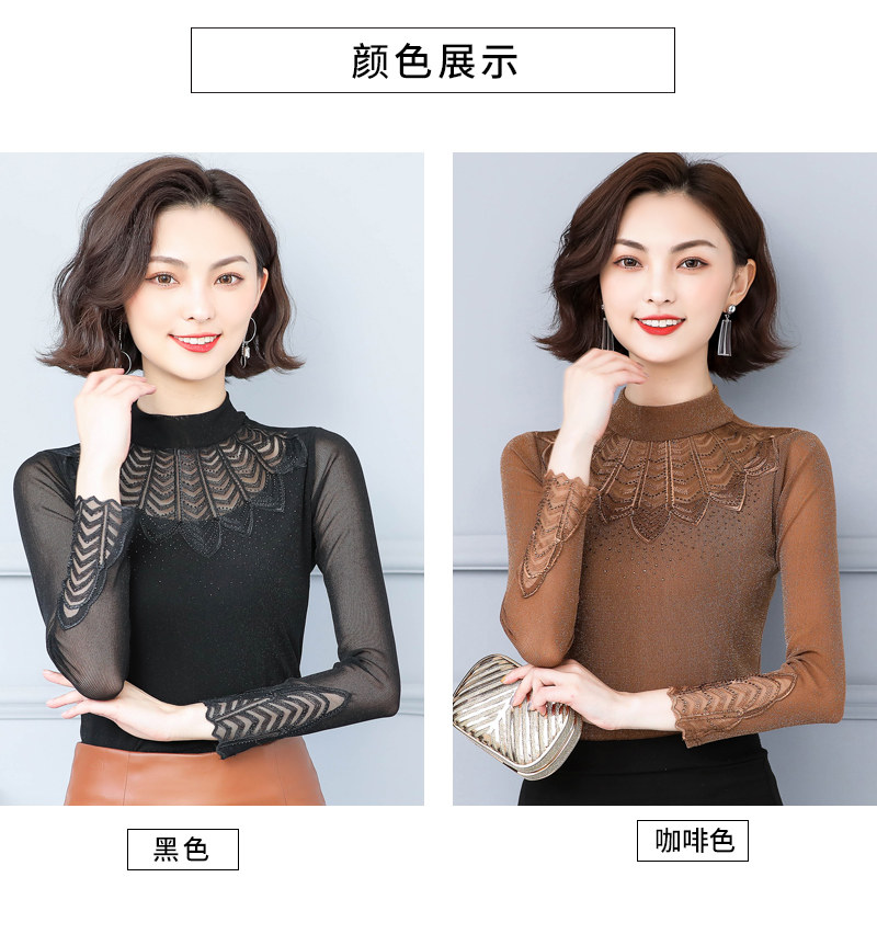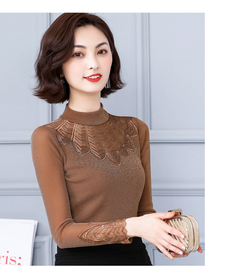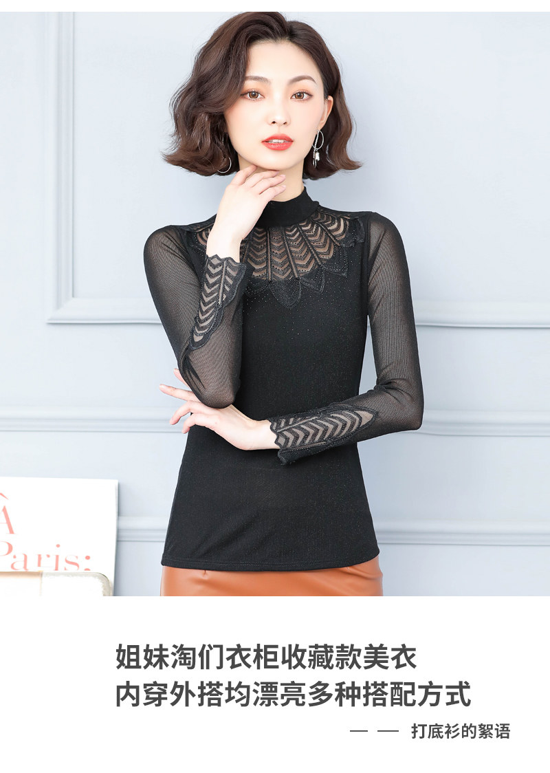 Кружевная шелковая приятная телу осенняя тонкая футболка, высокий воротник, коллекция 2022
