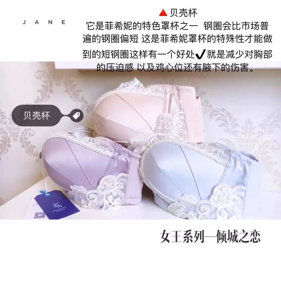 [1/2独特的贝壳模杯造型,厚度1.5cm,一眼望去便被深深吸引。那由光滑锦缎与水溶花边完美交织形成贴合身体曲线的轮廓,穿起来瞬间质感提升,典雅高贵,让元气女王由此优雅回归。 海绵:采用棉质3D立体棉,配合新型科研技术,反复测试,改变常规海绵的透气不足,和直立绵的结构力不强,取二者之间的优点。更轻、更透气、更贴肤、更健康。 面料:采用国外进口高档真丝色丁布料,成分为锦纶。主要特点光度鲜艳牢固力强。异域贵族风情的建筑设计灵感糅合在刺绣的妩媚性感。 钢圈:采用超软材质钢圈用料,以及记忆钢圈的不宜变型特点。做到不压迫,不给胸部造成压力又起到完美塑造胸型的效果。 特殊里料:桑蚕丝。 真丝由18种氨基酸组成,对人体具有良好的保健作用,被誉为人体第二肌肤]”[。 菲希妮罩杯里料采用独具魅力的欧系真丝,丝滑的触感,帮助乳房肌肤维持新陈代谢,长期穿戴让您的胸部一天比一天年轻。]