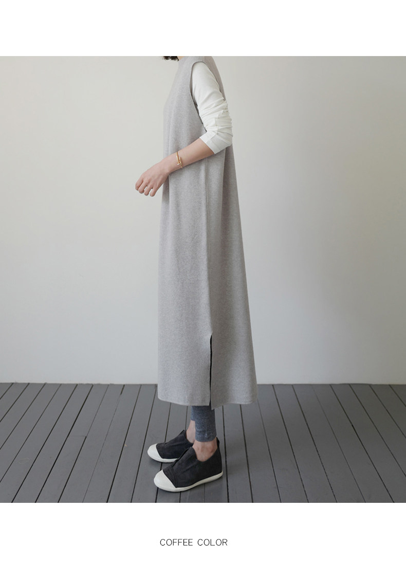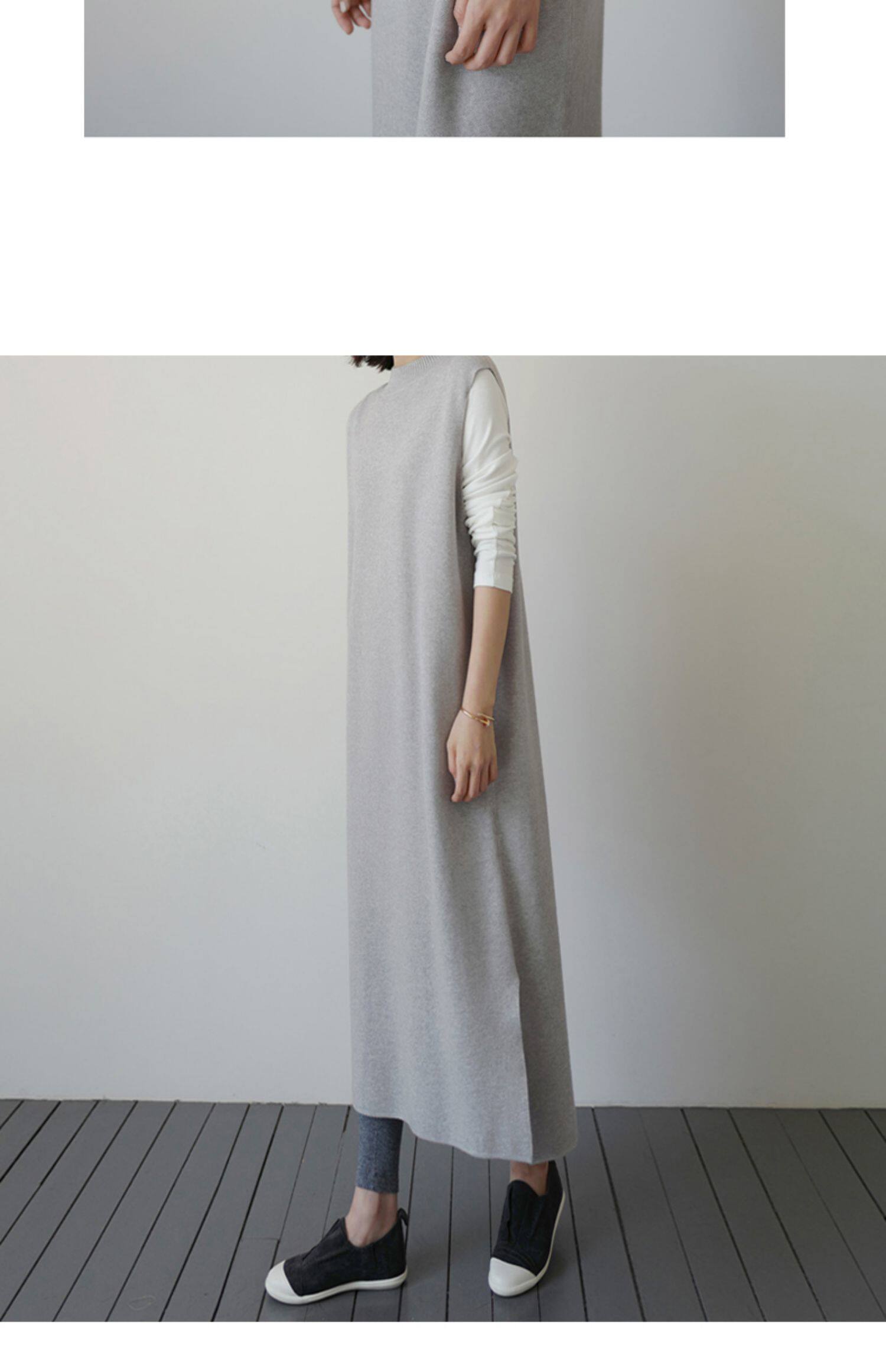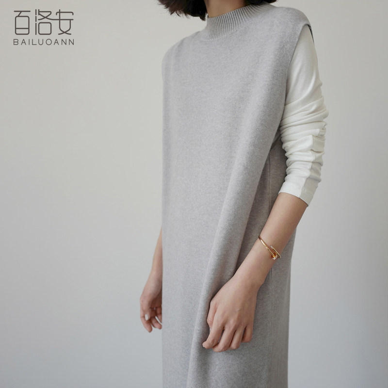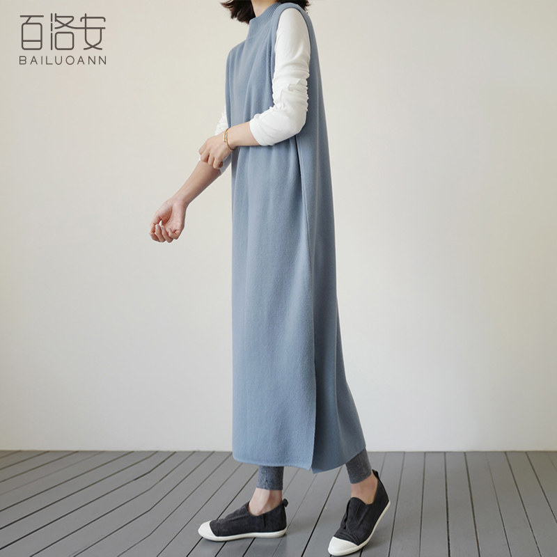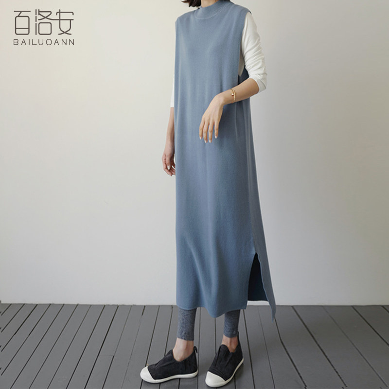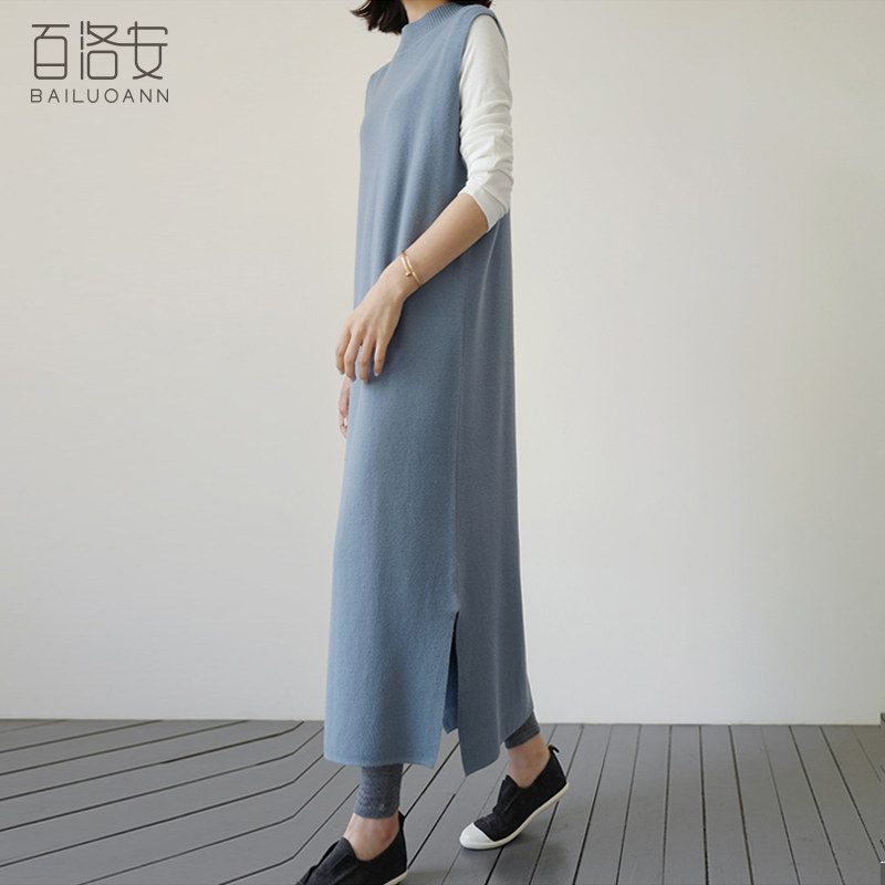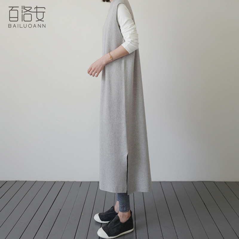 百洛安 Длинный трикотажный жилет, платье без рукавов, однотонная юбка, нарукавники с круглым воротником, свитер, длина макси, оверсайз