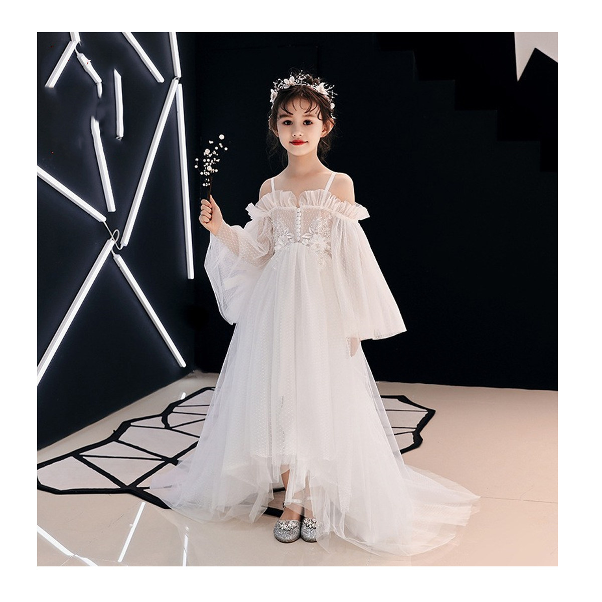Детское платье, пианино, костюм, манекен головы, длинная юбка, открытые плечи