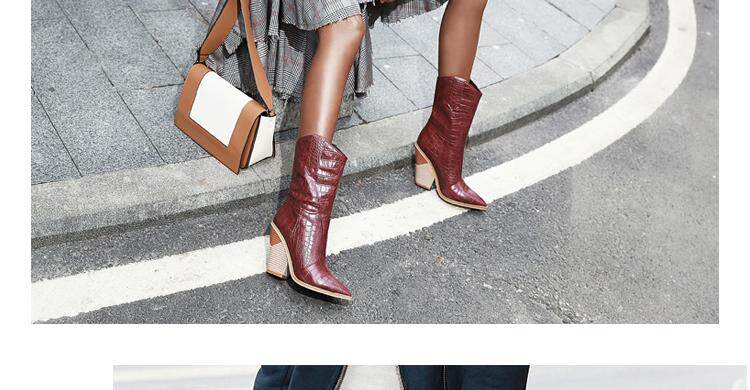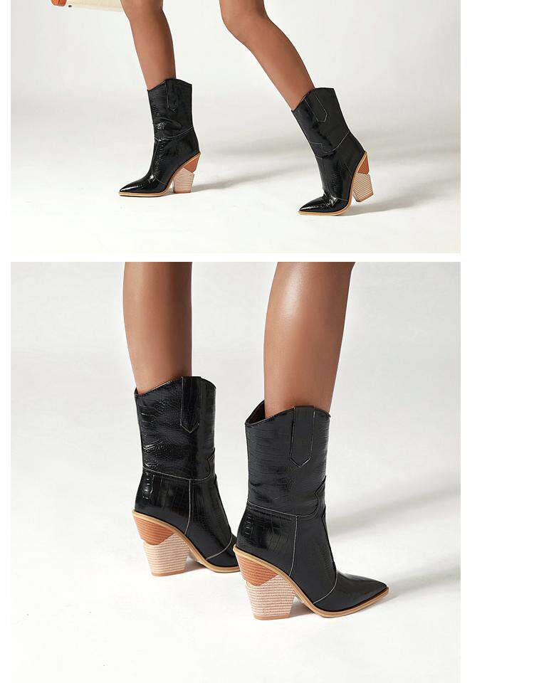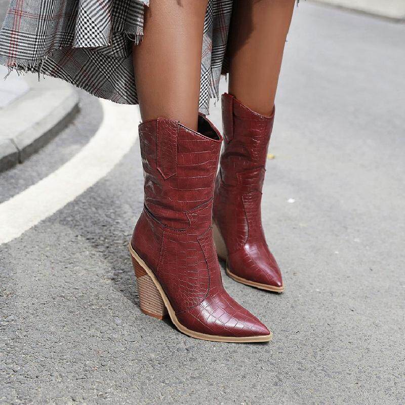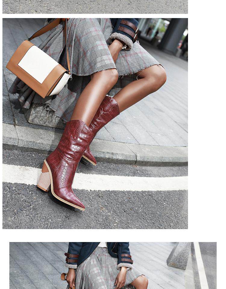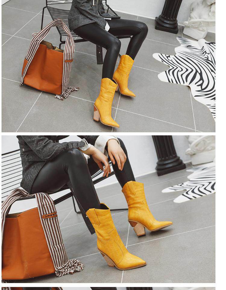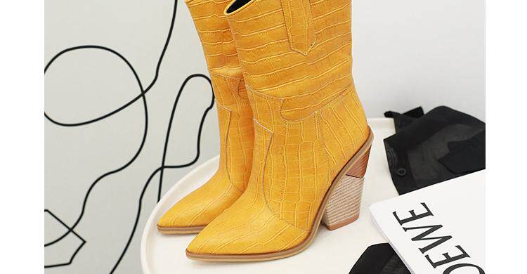 Новые желтые женские сапоги, кожаные сапоги на высоком каблуке с крокодиловым узором, сапоги до середины икры на толстом каблуке с острым носком, большие размеры 44, 45, 46, 47, 48