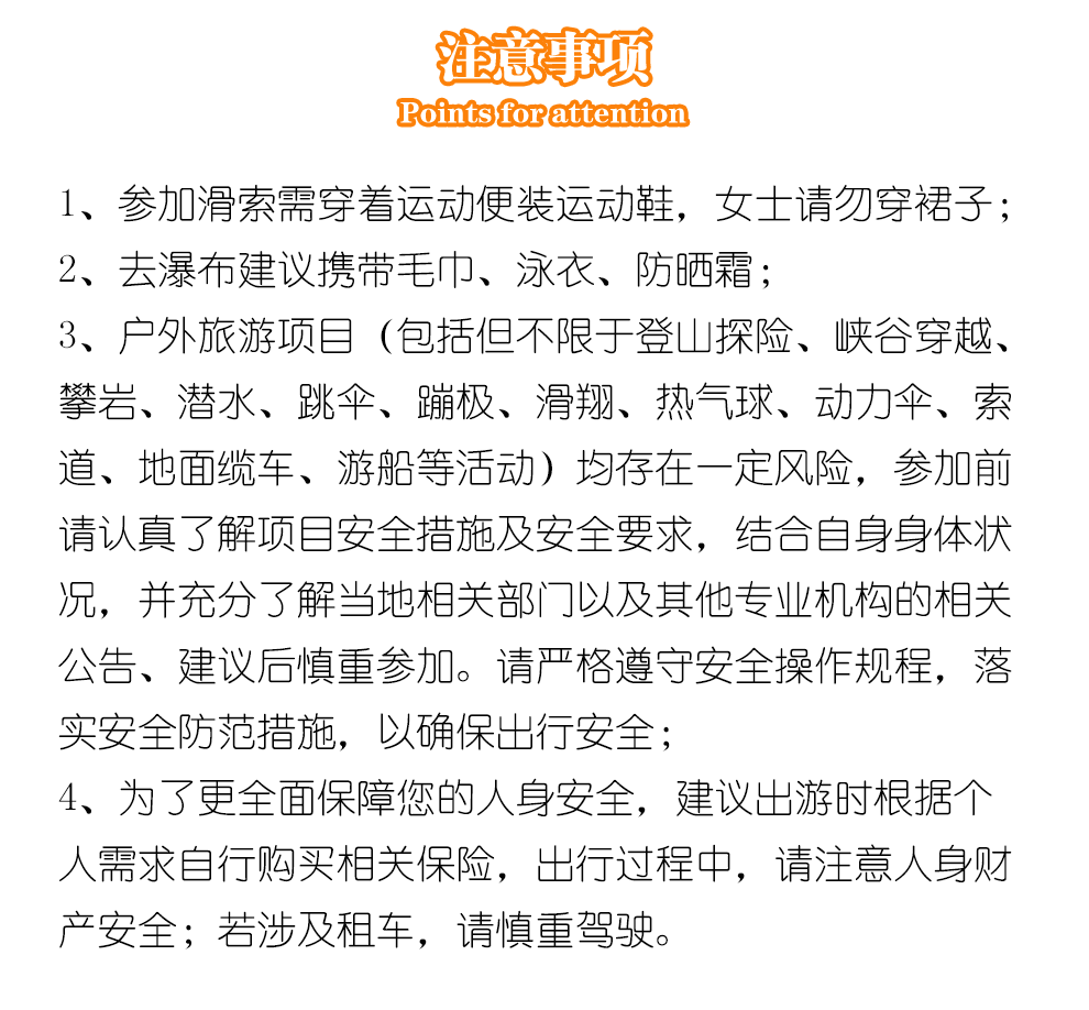 2. Туризм, туризм на открытом воздухе и некоторые проекты развлечений в помещении (включая, помимо прочего, дайвинг, плавание, дрейф, катание на коньках, катание на лыжах, серфинг, приключения, воздушный воздушный шарик, альпийская веревка и другие проекты) - все это риск.Теперь платформа формулирует «Руководство по охране безопасности» (https://market.m.taobao.com/markets/h5/treavel_02) из двух аспектов специальной толпы и профилактики риска туристической деятельности.Перед участием, пожалуйста, спросите продавца в соответствии с вашими собственными условиями и полностью обратитесь к соответствующим объявлениям и предложениям профессиональных учреждений.В то же время, в строгом соответствии с требованиями проекта, подготовитесь к безопасности и, пожалуйста, активно обращайте внимание на изменения погоды.