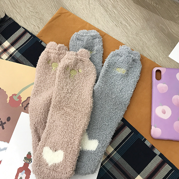Симпатичные плюшевые носки на полу. Уши на носках спроектированы в трехмерном