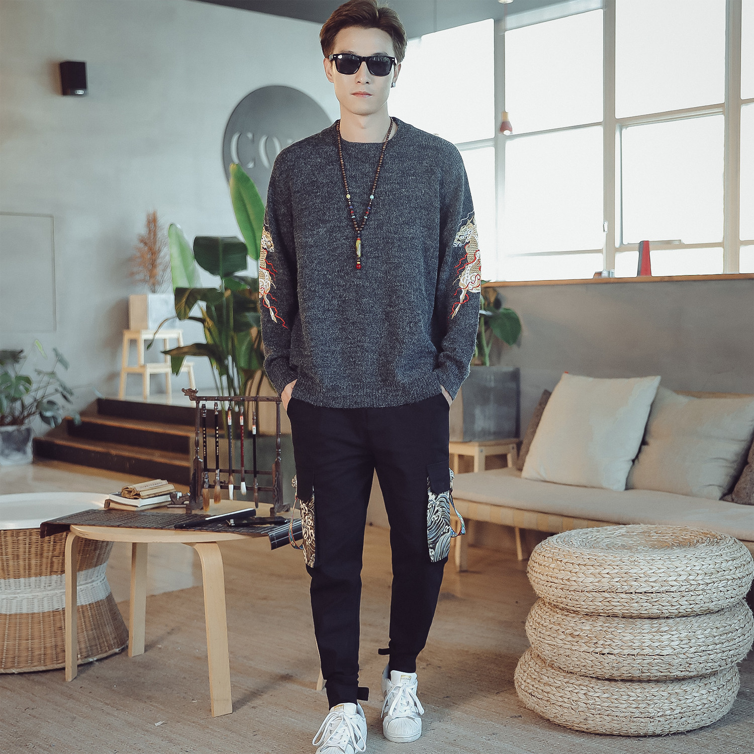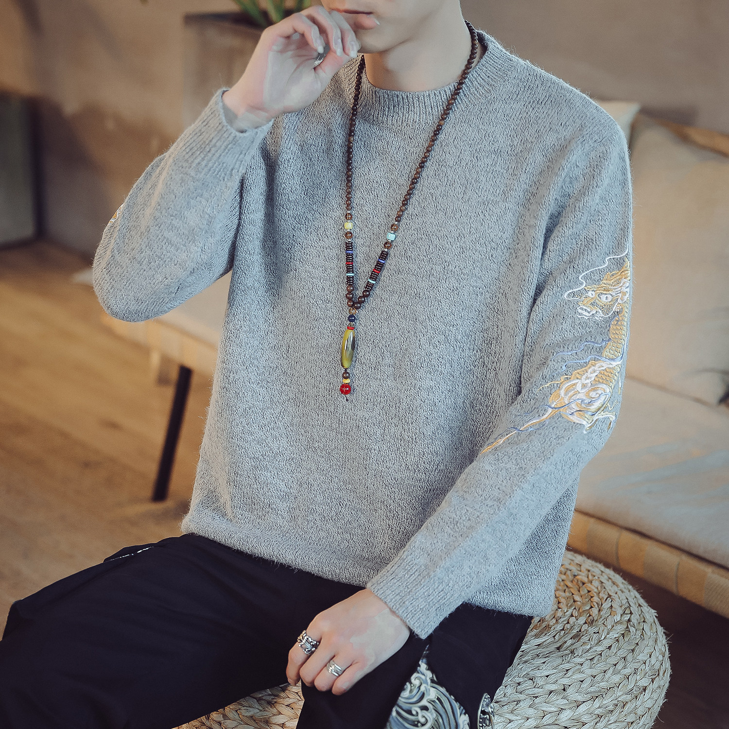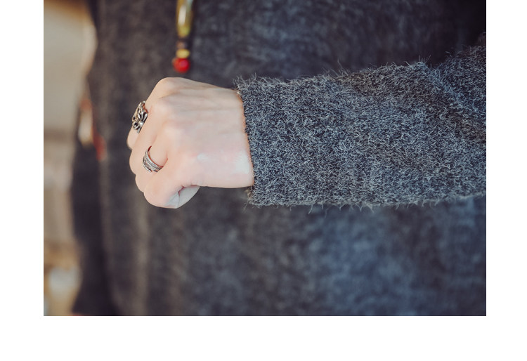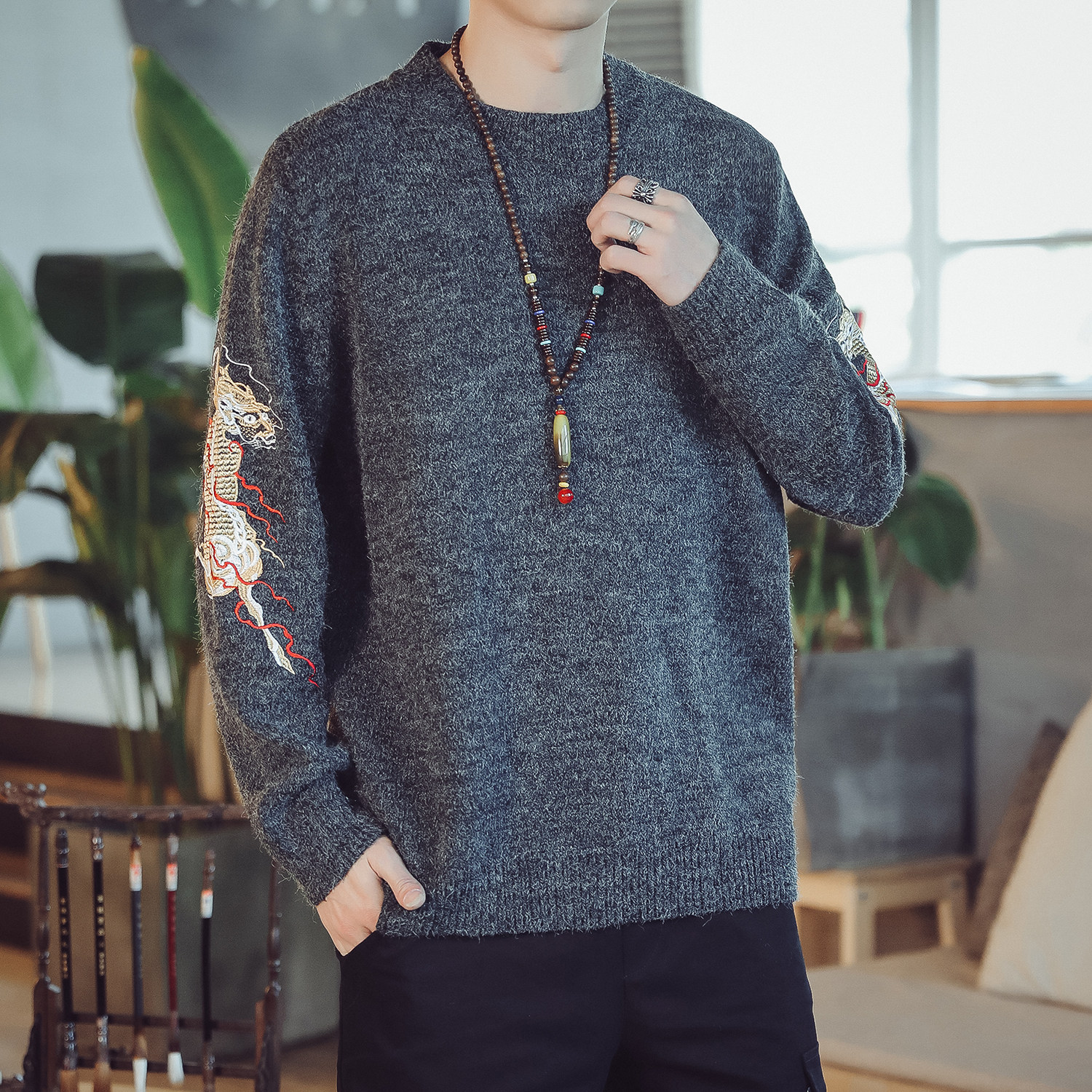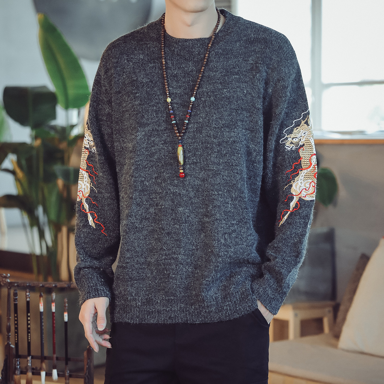 Осенний трикотажный свитер с круглым воротником, китайский стиль, с вышивкой, большой размер