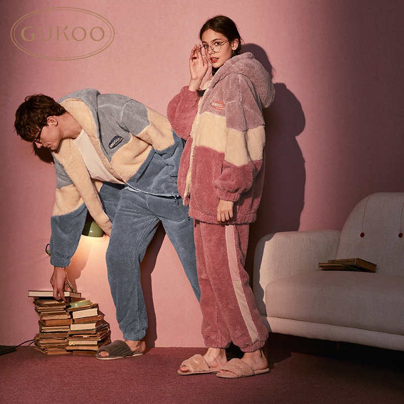 Gukoo/果壳 Демисезонная коралловая бархатная пижама для влюбленных, зимний комплект для отдыха с капюшоном