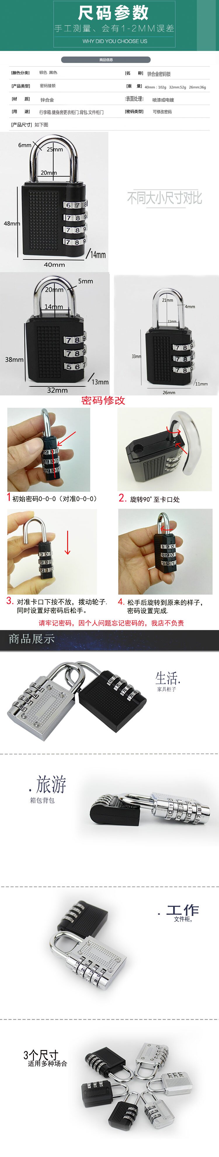 Замок пароля цинка, прочный и долговечный, может сохранить бремя с помощью ключа.Измените свой пароль, так как вы можете использовать гибкость и удобство.Пароль должен помнить.