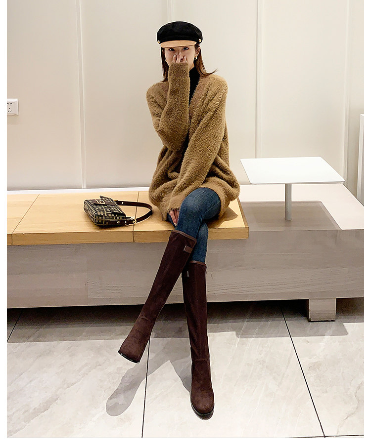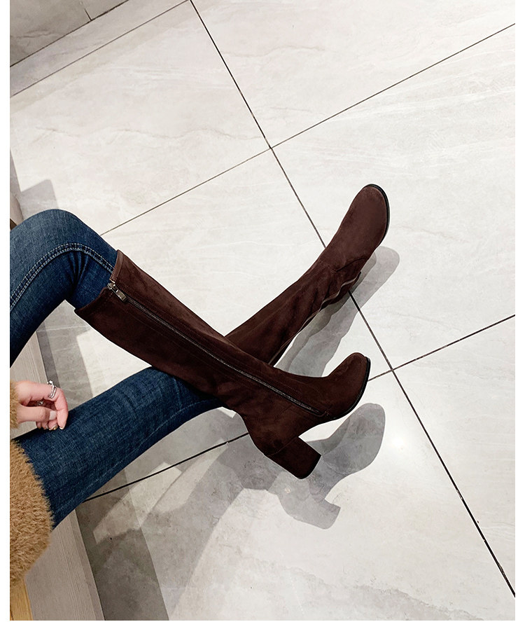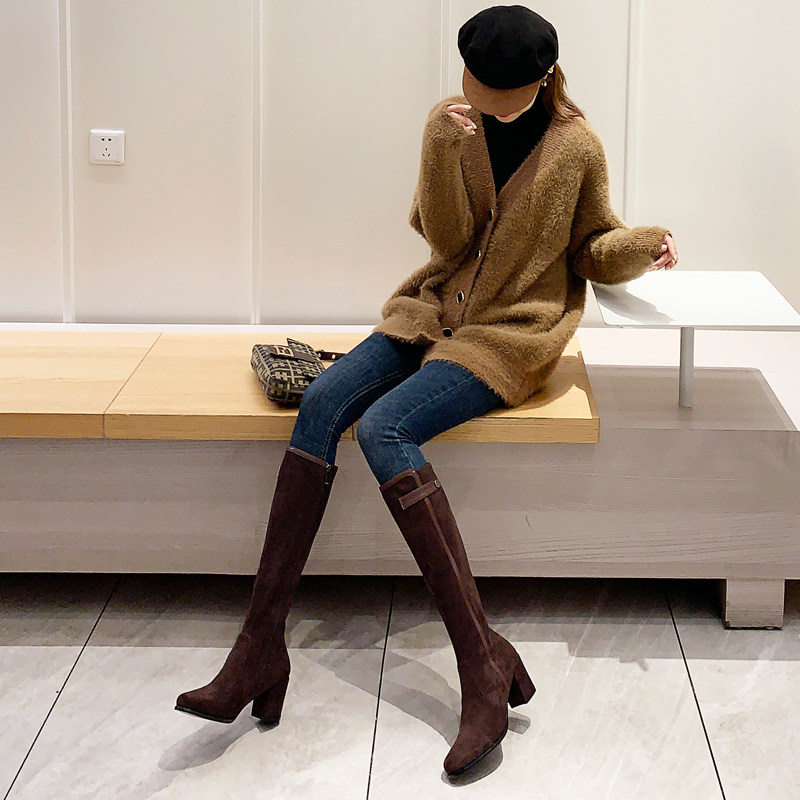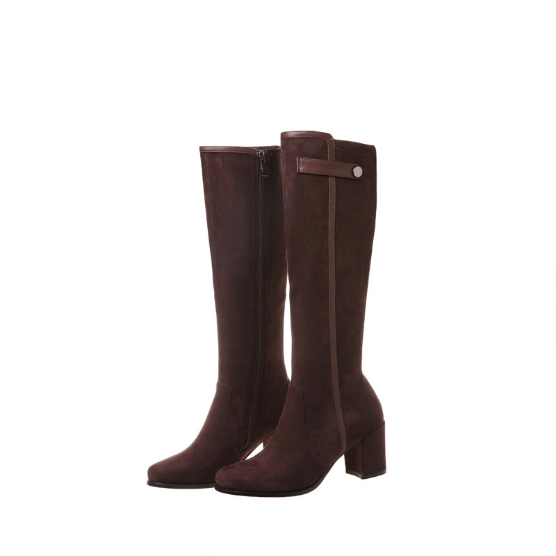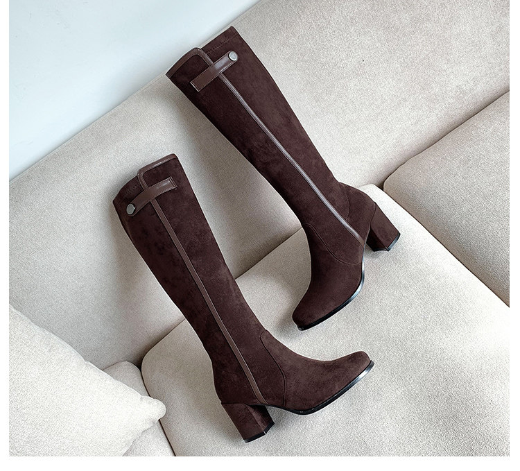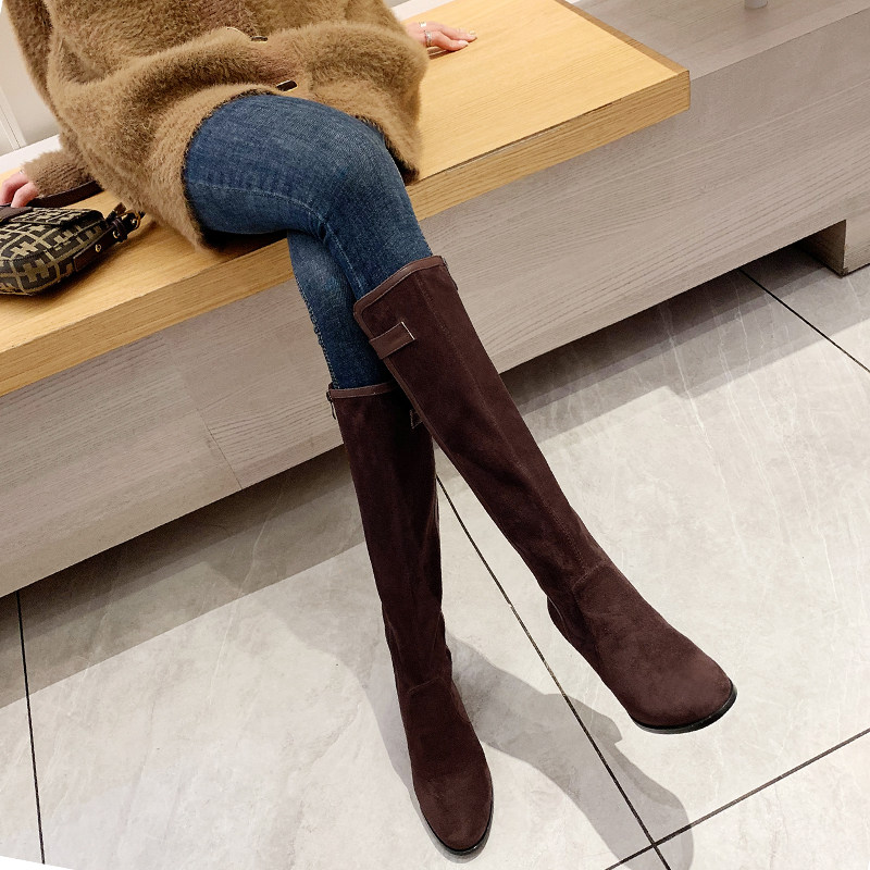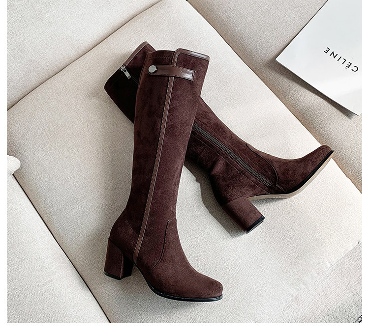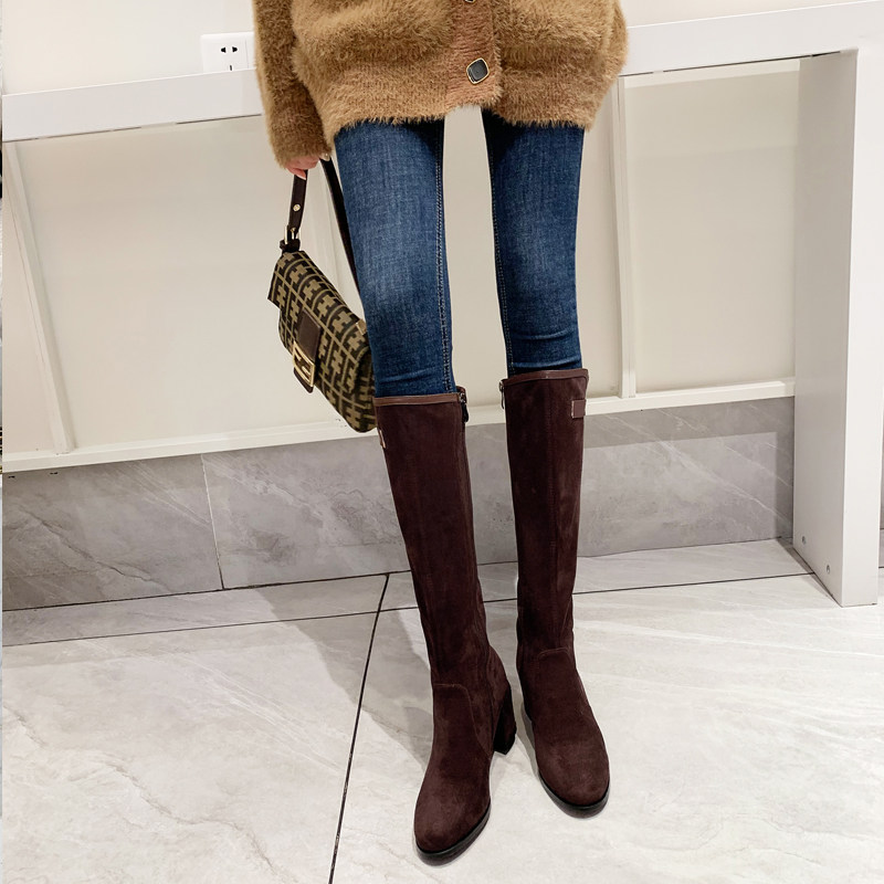 2024 зимние коричневые женские сапоги, сапоги не выше колена 150 см, высокие каблуки, сапоги до середины икры, эластичные высокие рыцарские сапоги
